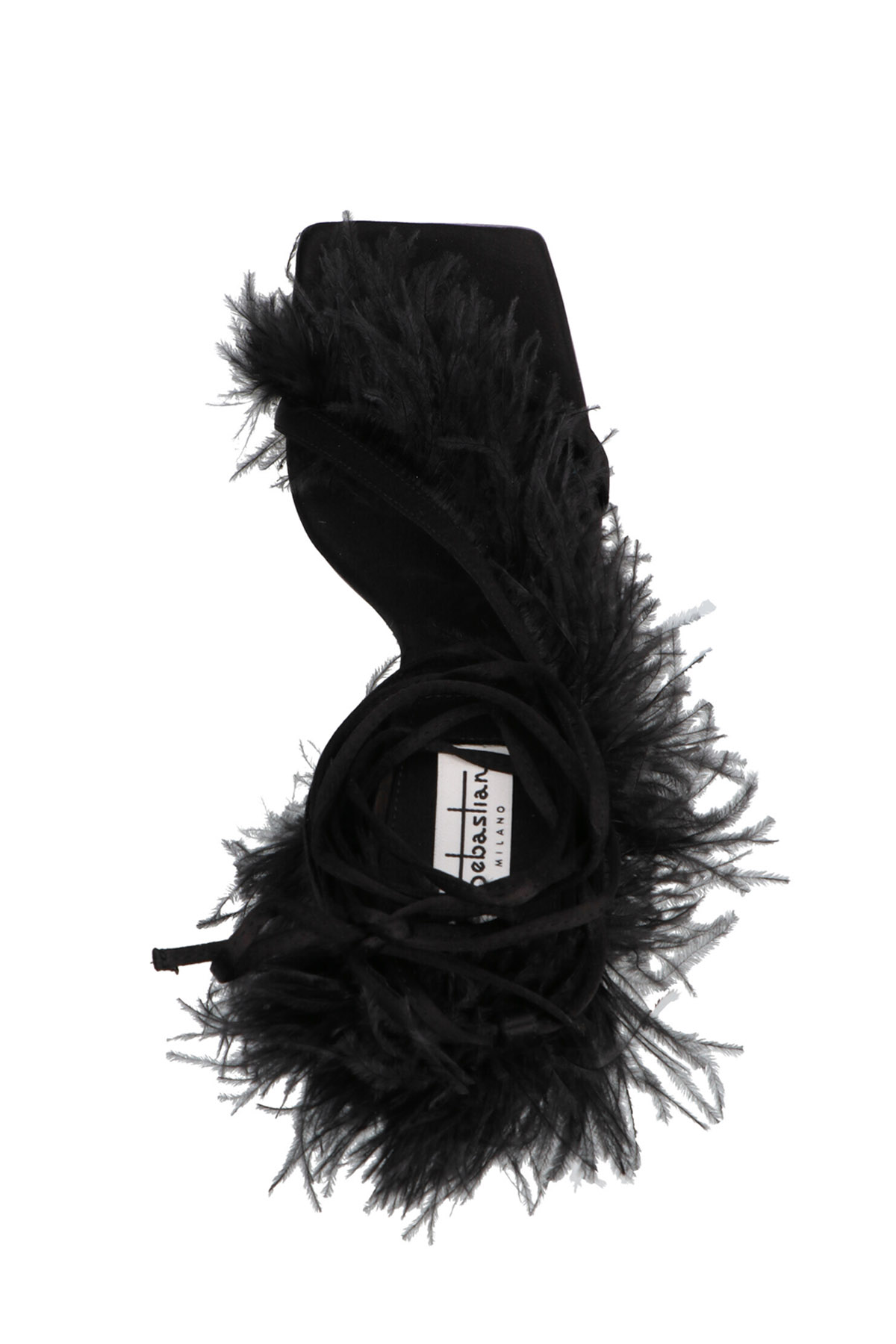 ‘Feather Wrap' satin sandals with feather appliques, and ankle laces, a squared toe and a sculpted heel.