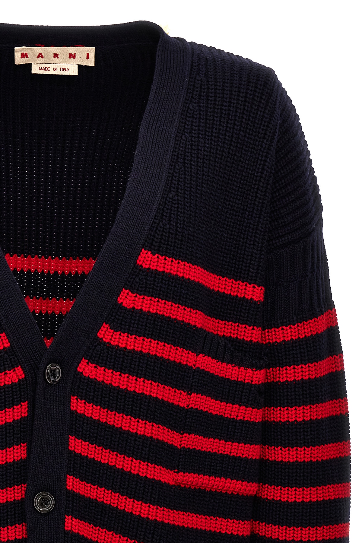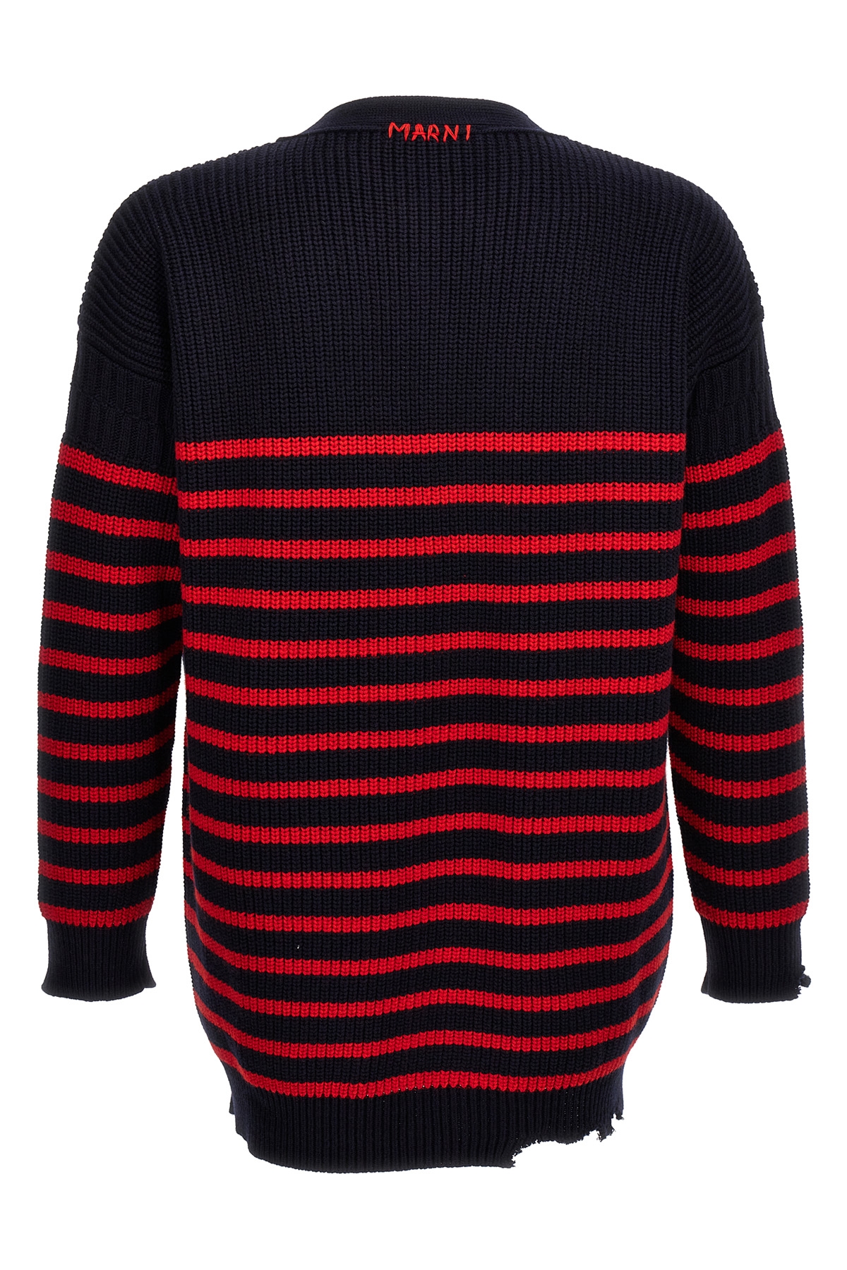Striped wool cardigan with destroyed effect details, front pocket, button closure, long cuffed sleeves.