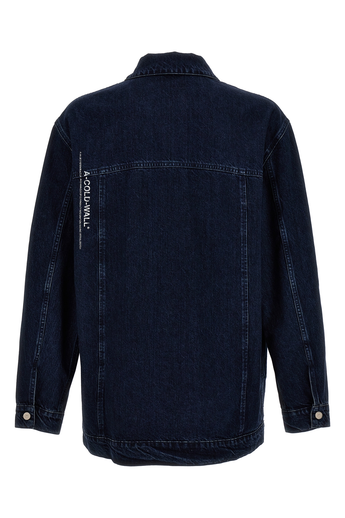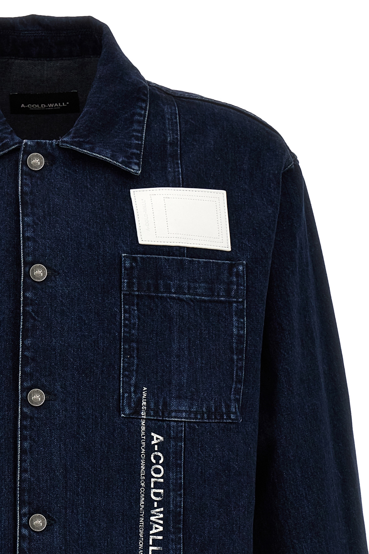 'Discourse Chore' cotton denim jacket with front logo print, button closure, pockets, long cuffed sleeves.