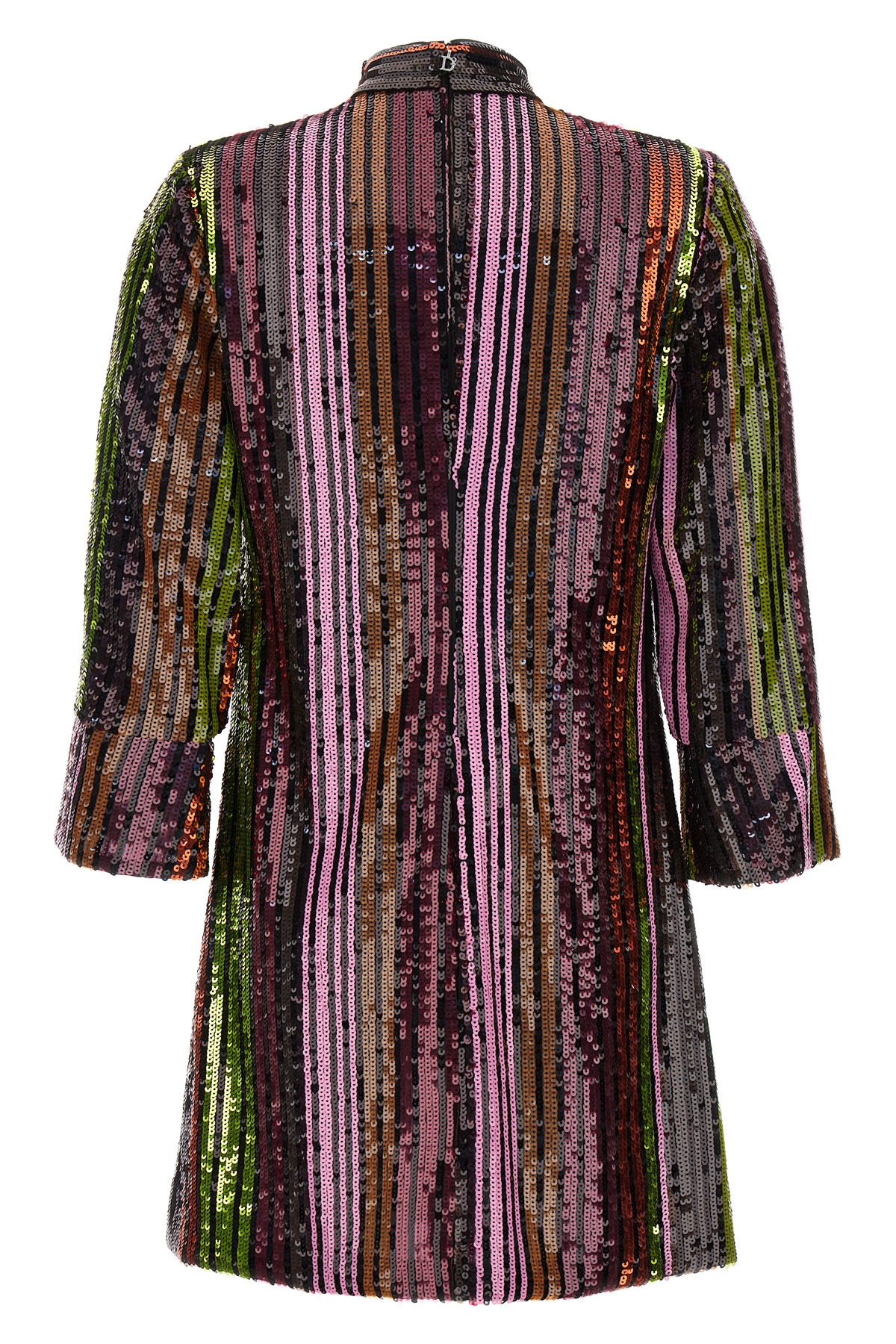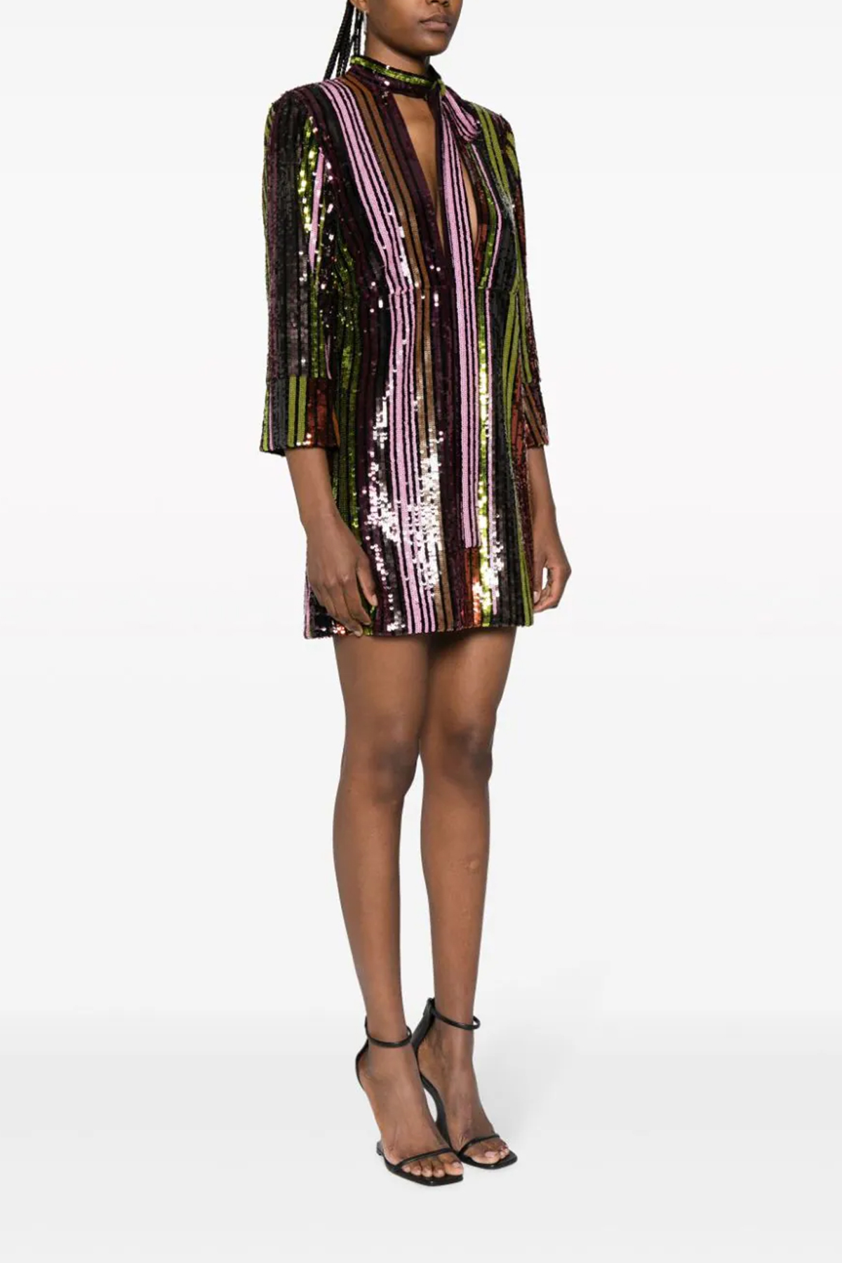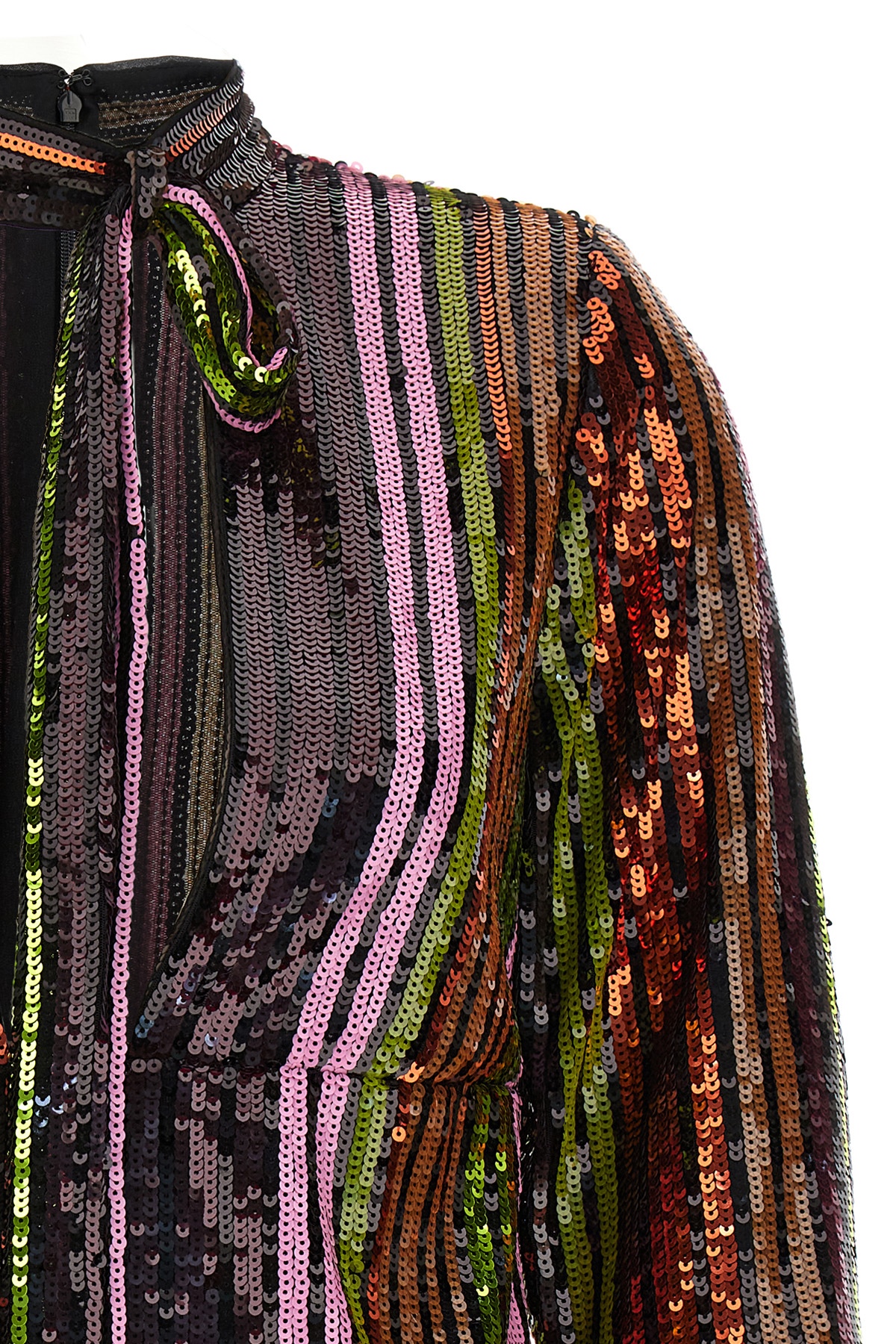 'Disco Queen' dress in multicolor striped sequins, crewneck with sash, maxi neckline at the front, long sleeves, and back zip closure.