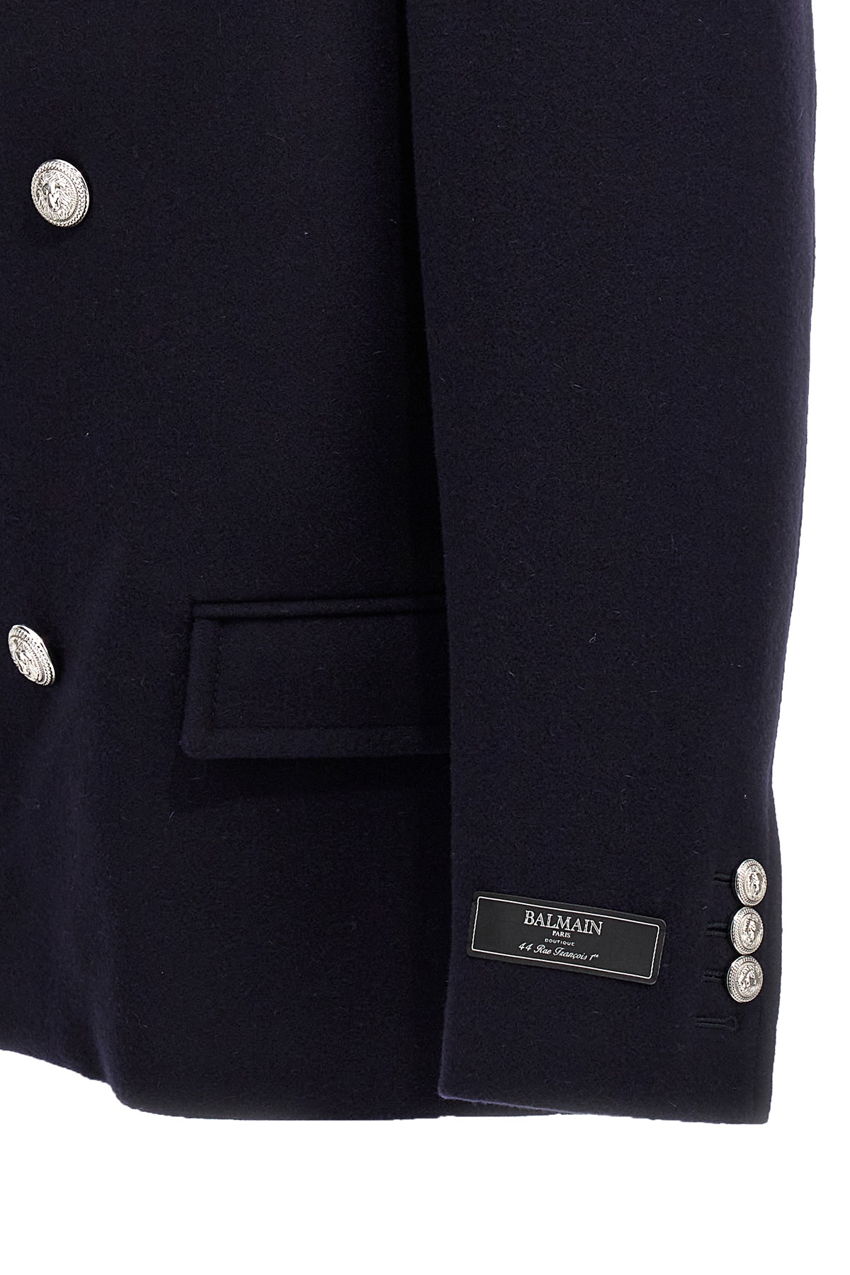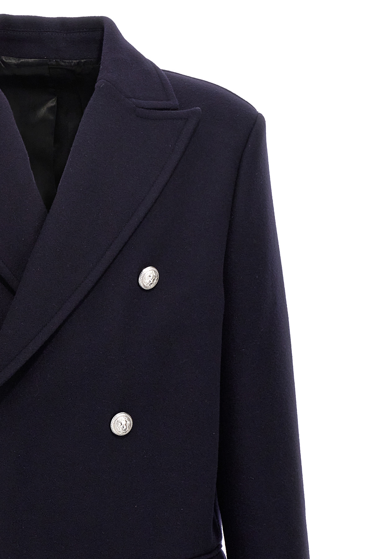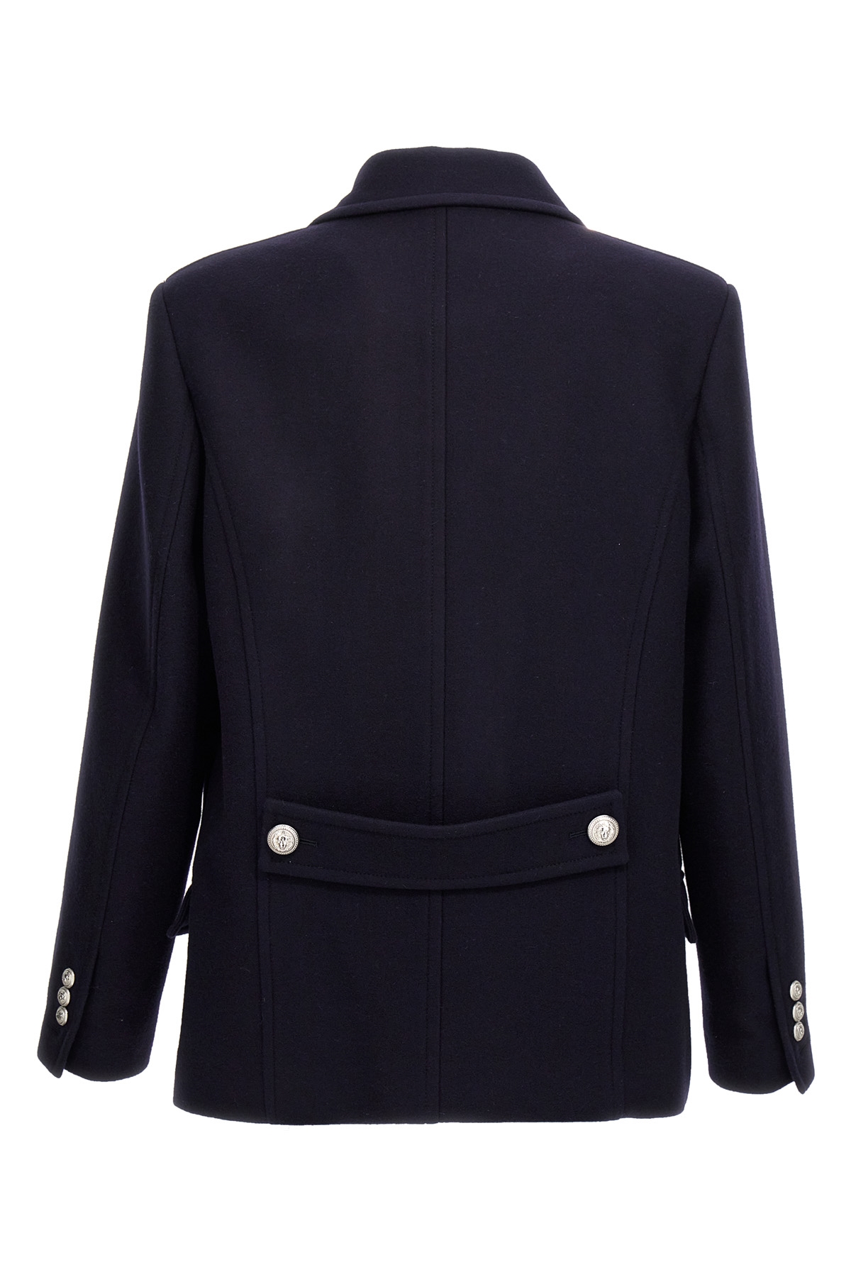 Double-breasted wool felt coat, logo button closure, pockets, long sleeves, back half belt.