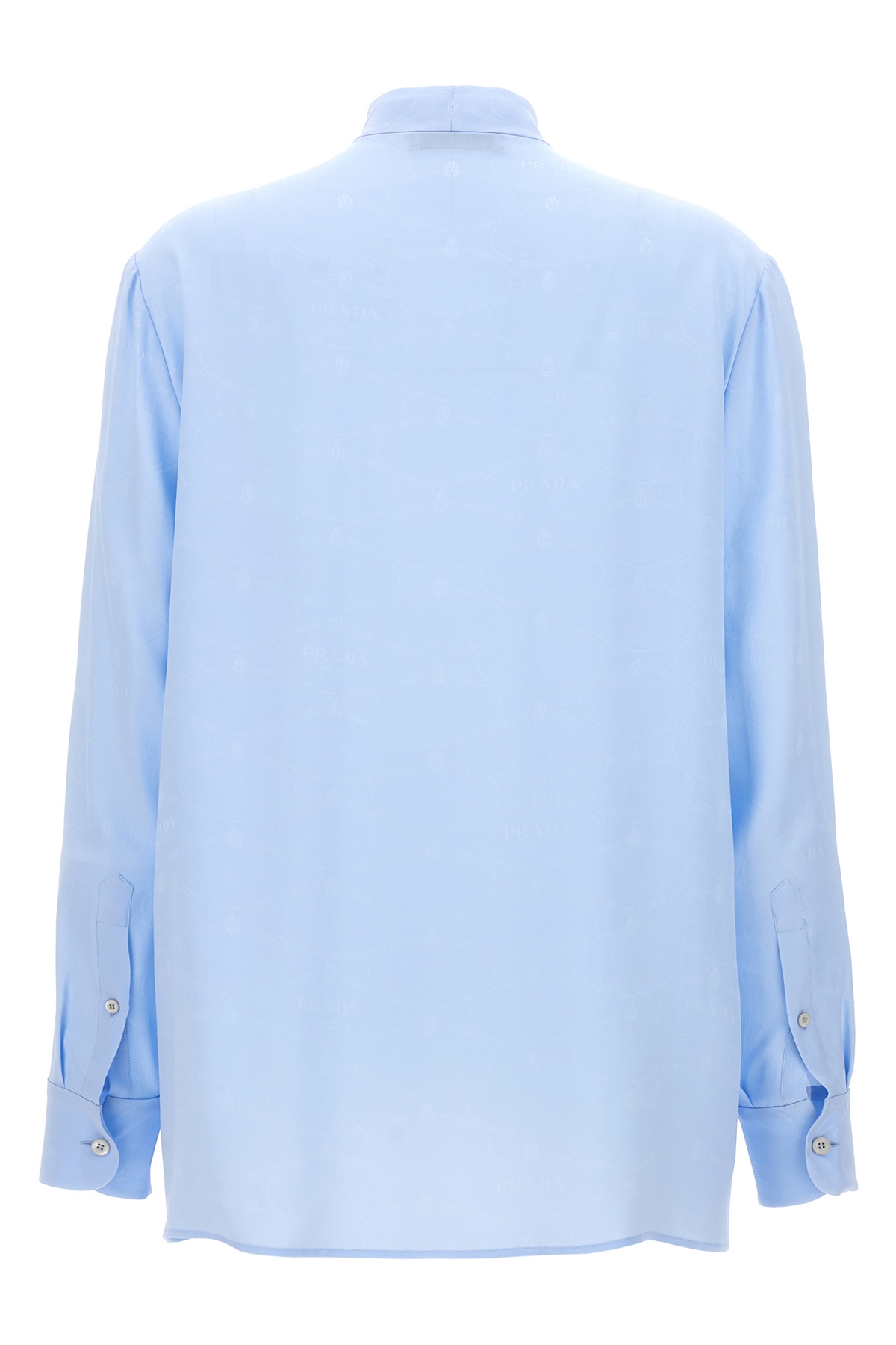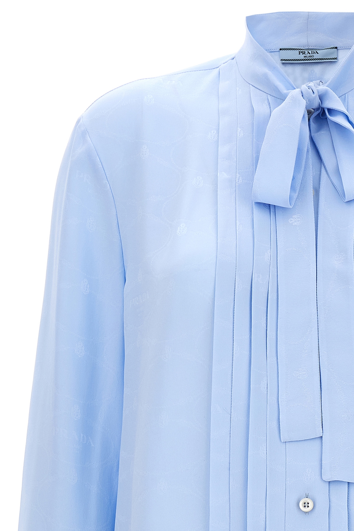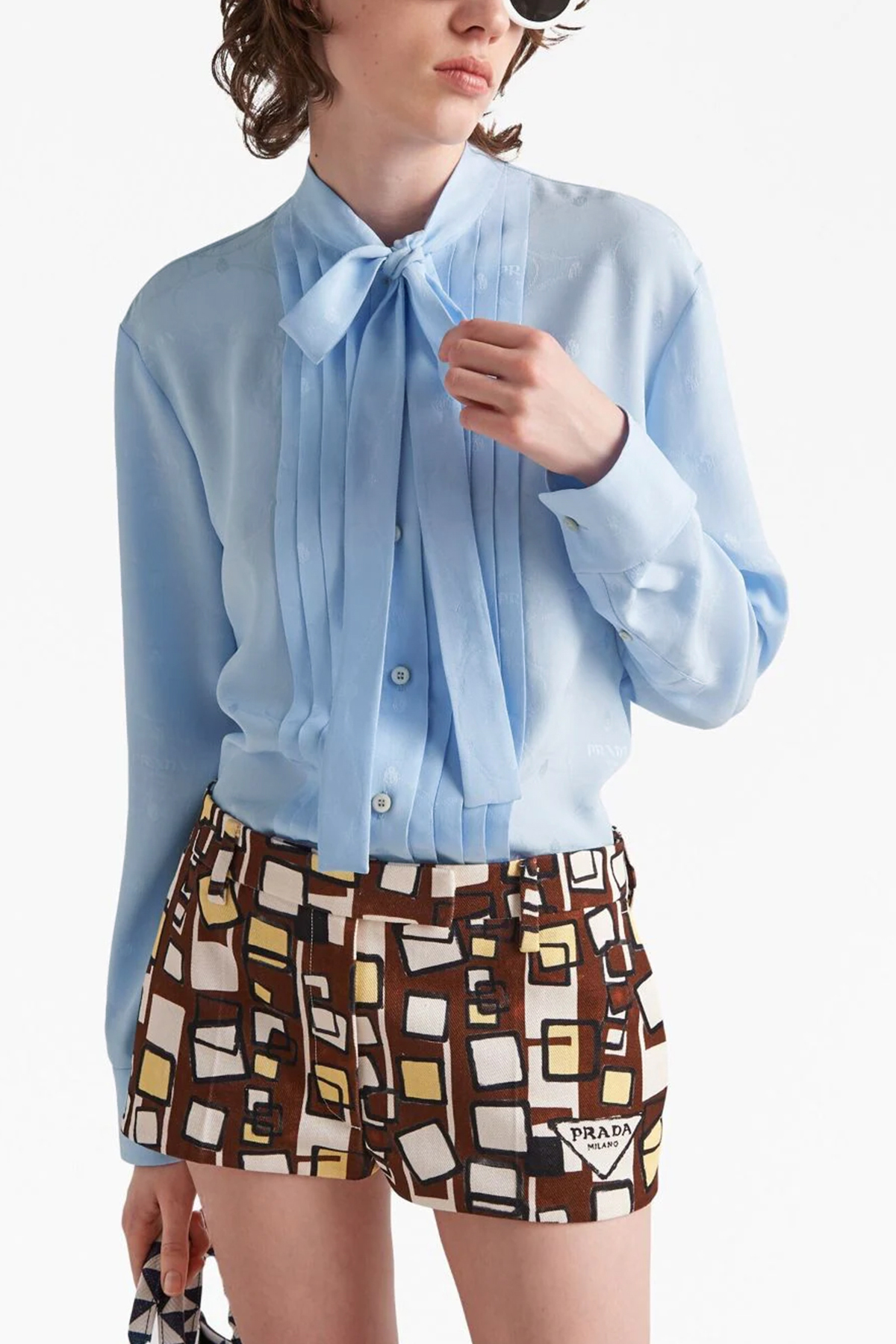Silk shirt with all-over logo pattern, button closure with pleated detail on the sides, long sleeves with cuffs, bow to tie at the neck.