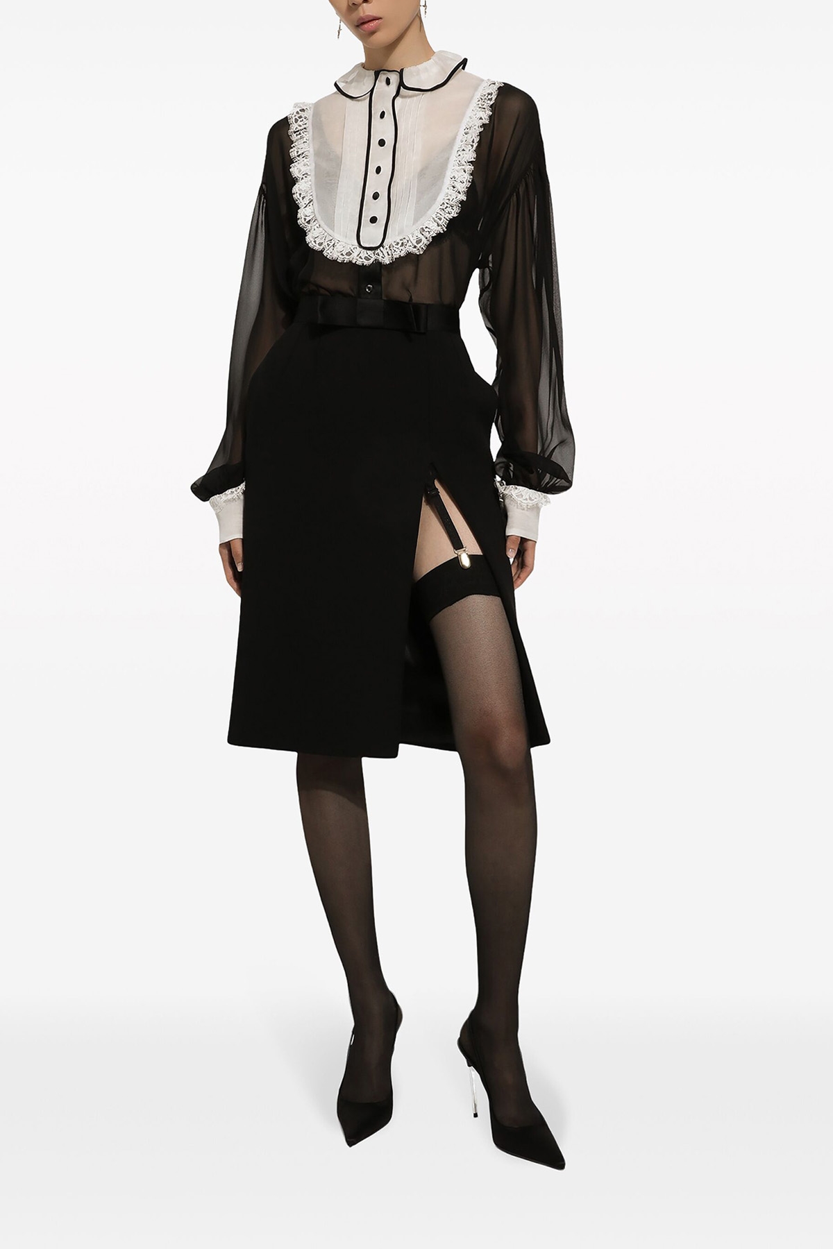 Stretch wool pencil skirt with satin strap, front slit, back zip closure.