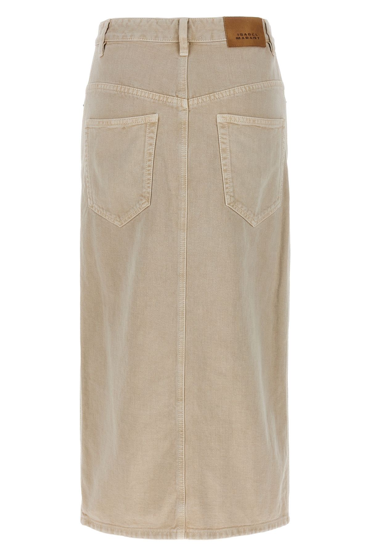 'Vandy' cotton denim skirt with front button closure, five pockets.
