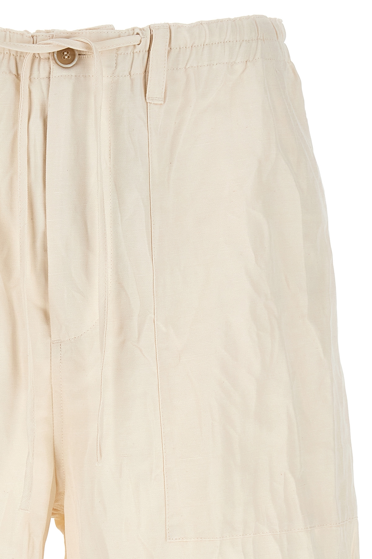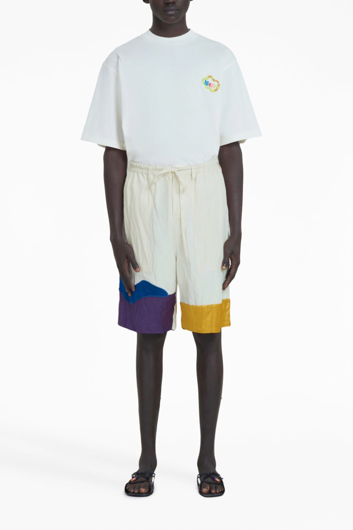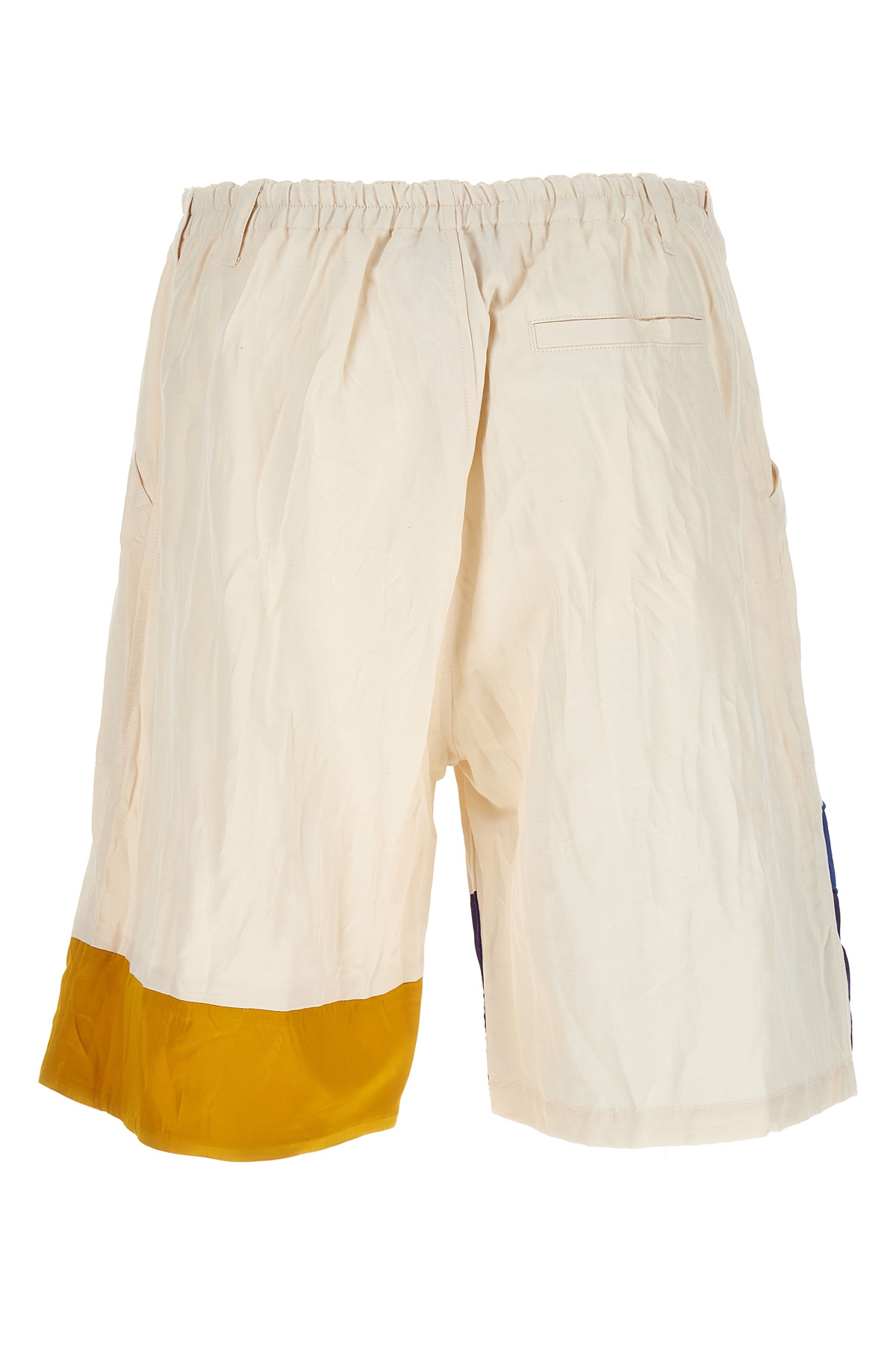 No Vacancy Inn' High Summer capsule linen blend bermuda shorts with patchwork inserts, zip and button closure, elastic and drawstring at the waist, pockets.