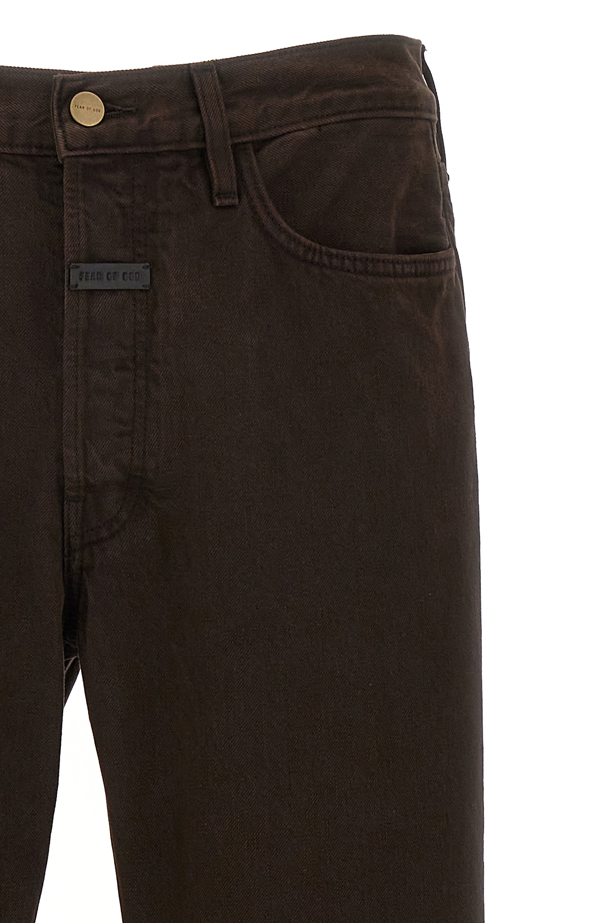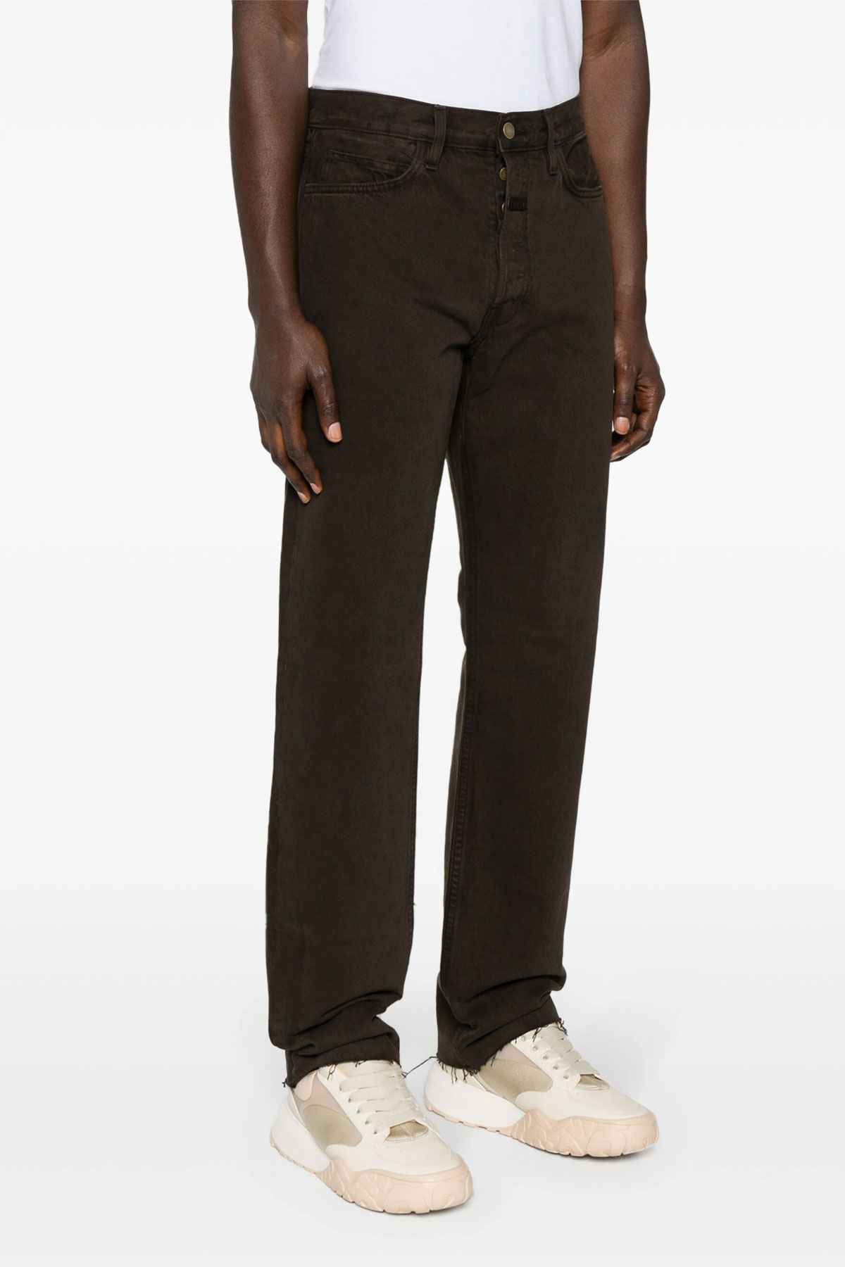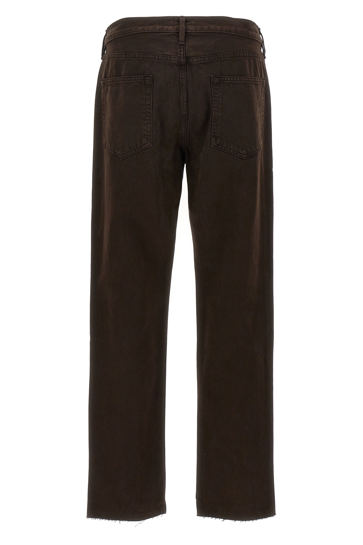 '8th Collection' cotton denim jeans with button closure, five pockets, leather logo patch, raw cut hem.