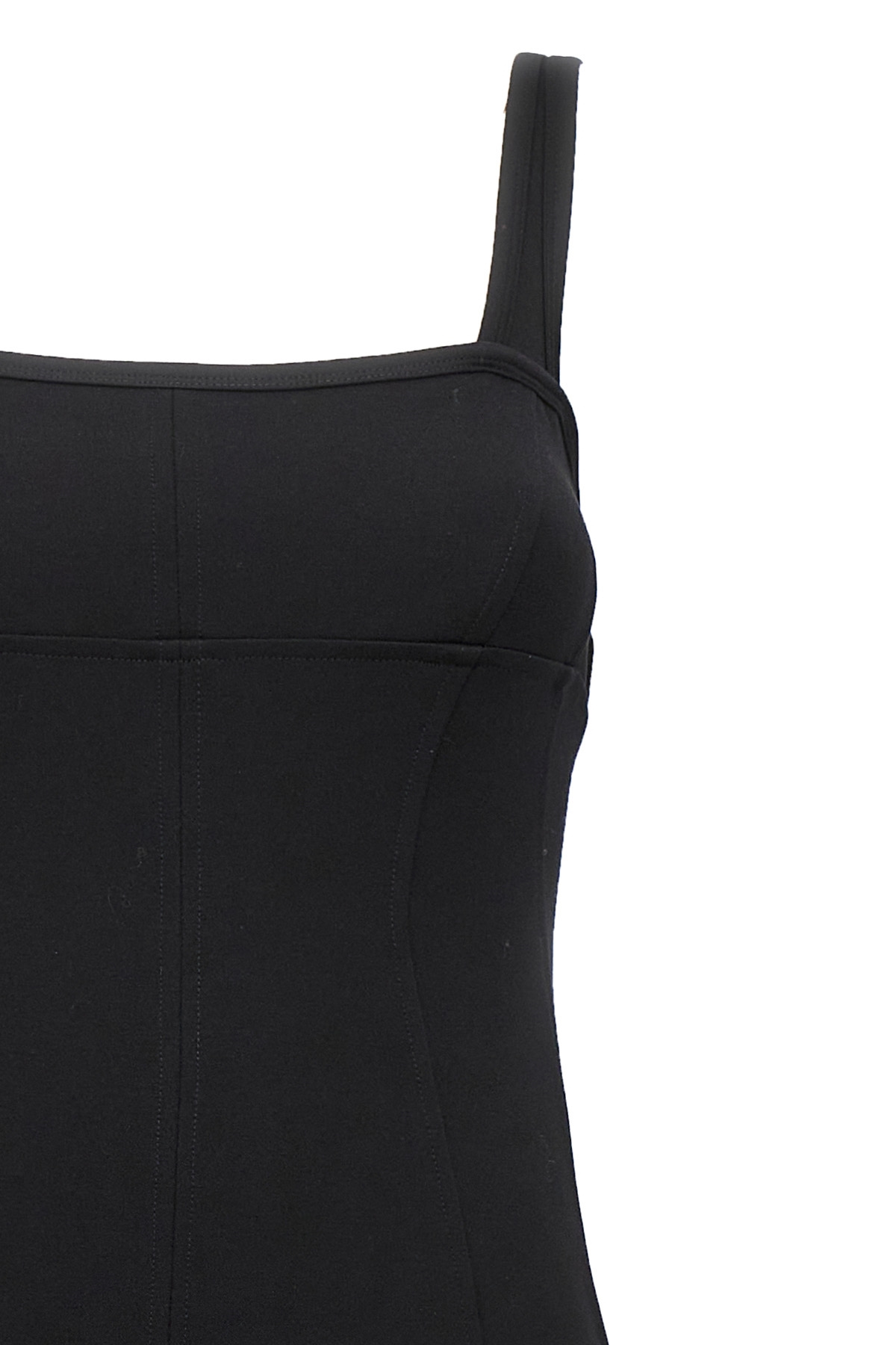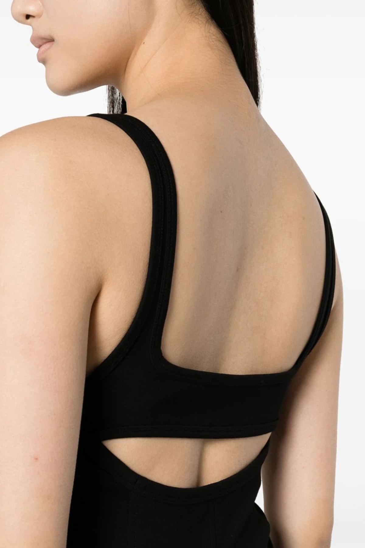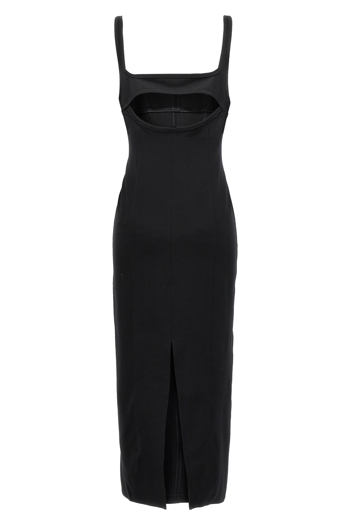 Stretch fabric midi dress with square neckline, shoulder straps, cut out detail at the back, back split.