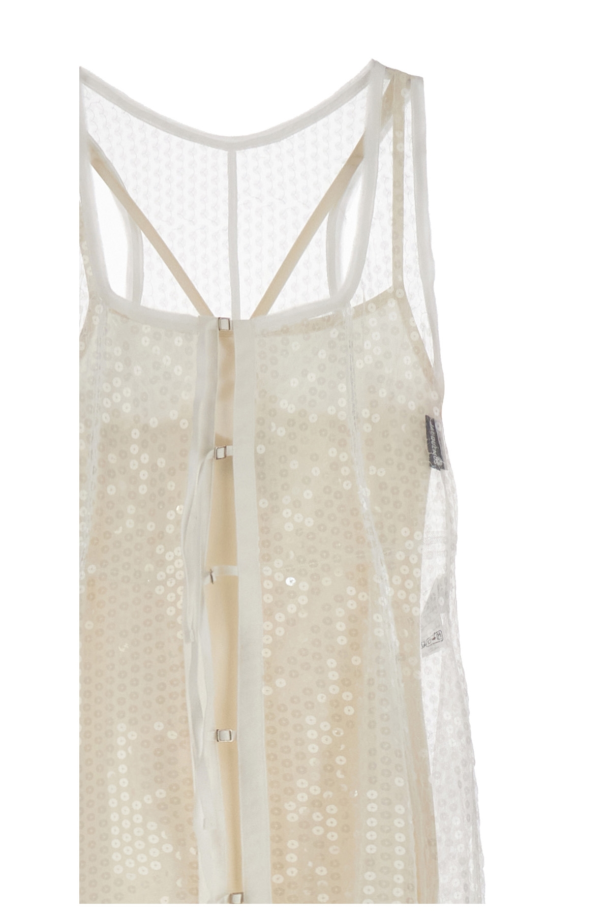 'Le robe dentelle' dress in transparent fabric covered with tone-on-tone sequins, A-shaped and long to the floor, sleeveless model with a wide neckline and an open front part that can be closed with laces. Equipped with short petticoat.