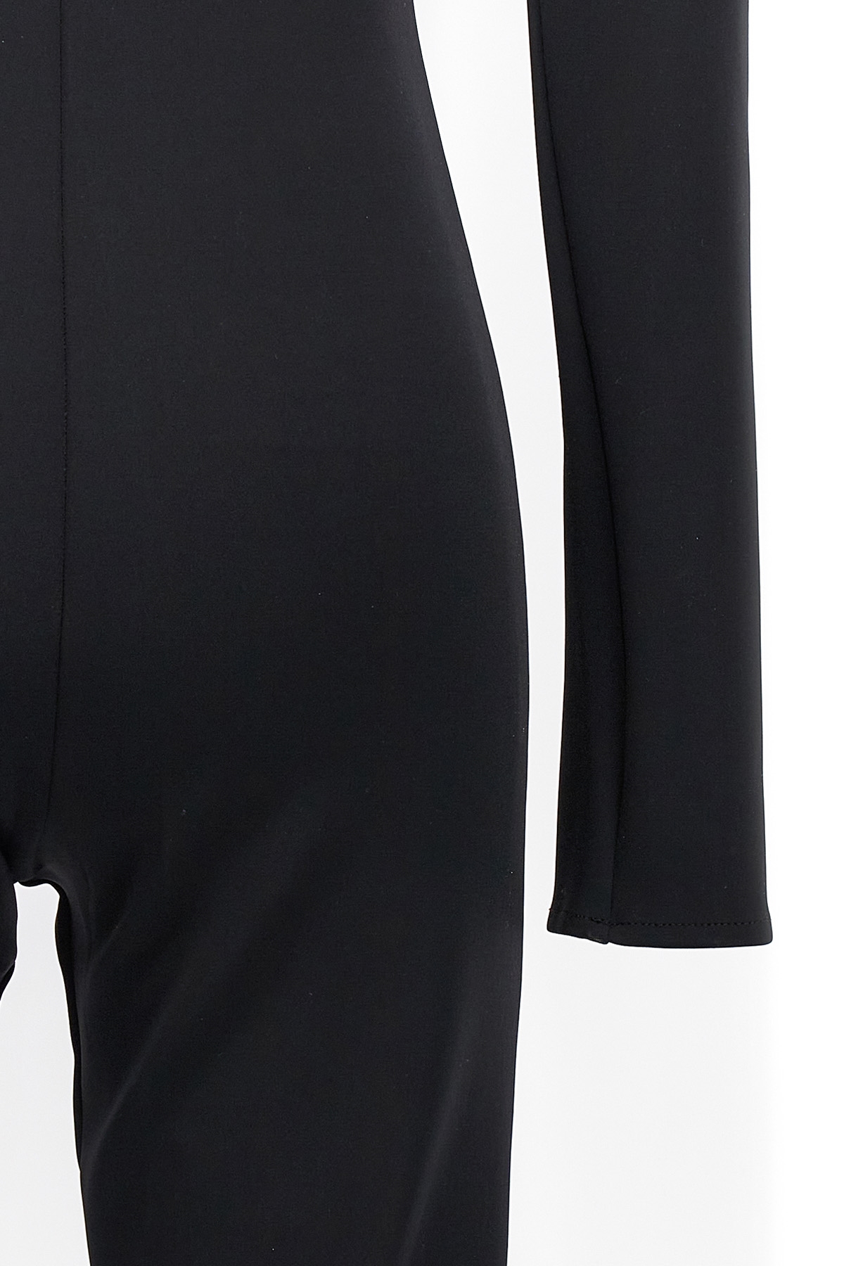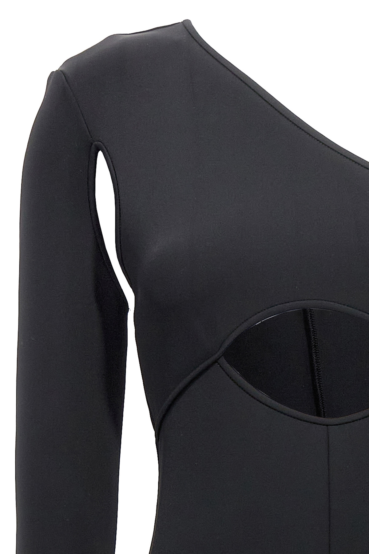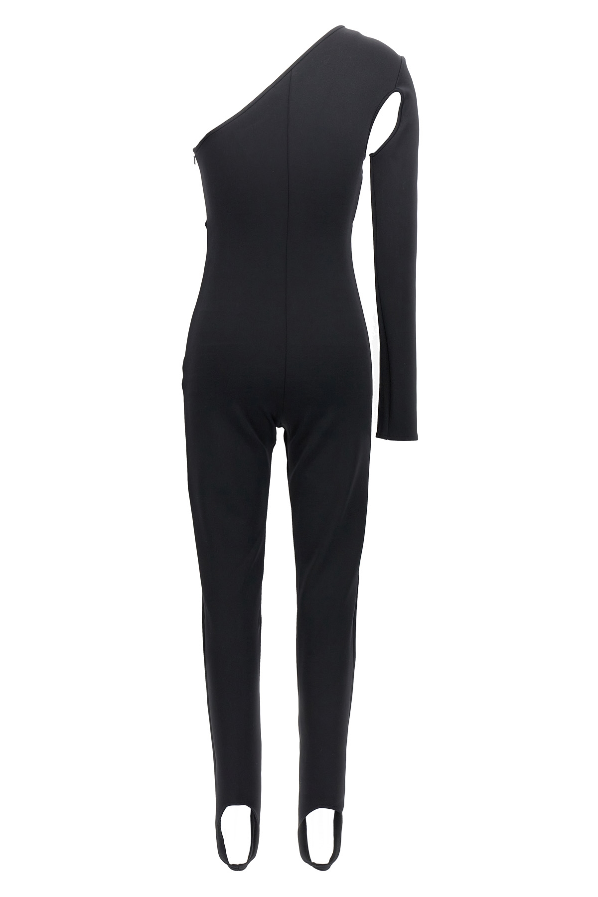 Scuba stretch fabric one-piece bodysuit with front cut out detail, one shoulder with long sleeves, back zip closure, long leg with foot band on the bottom.