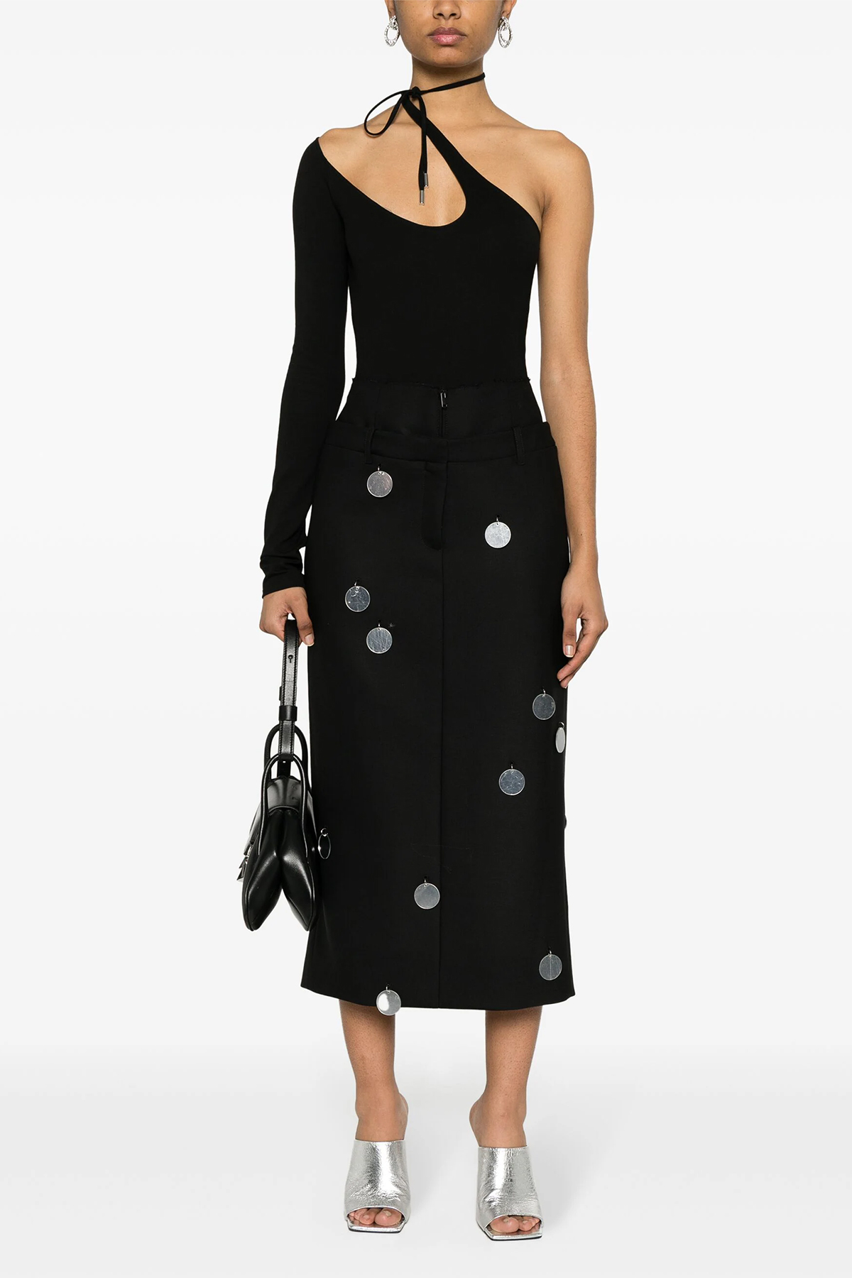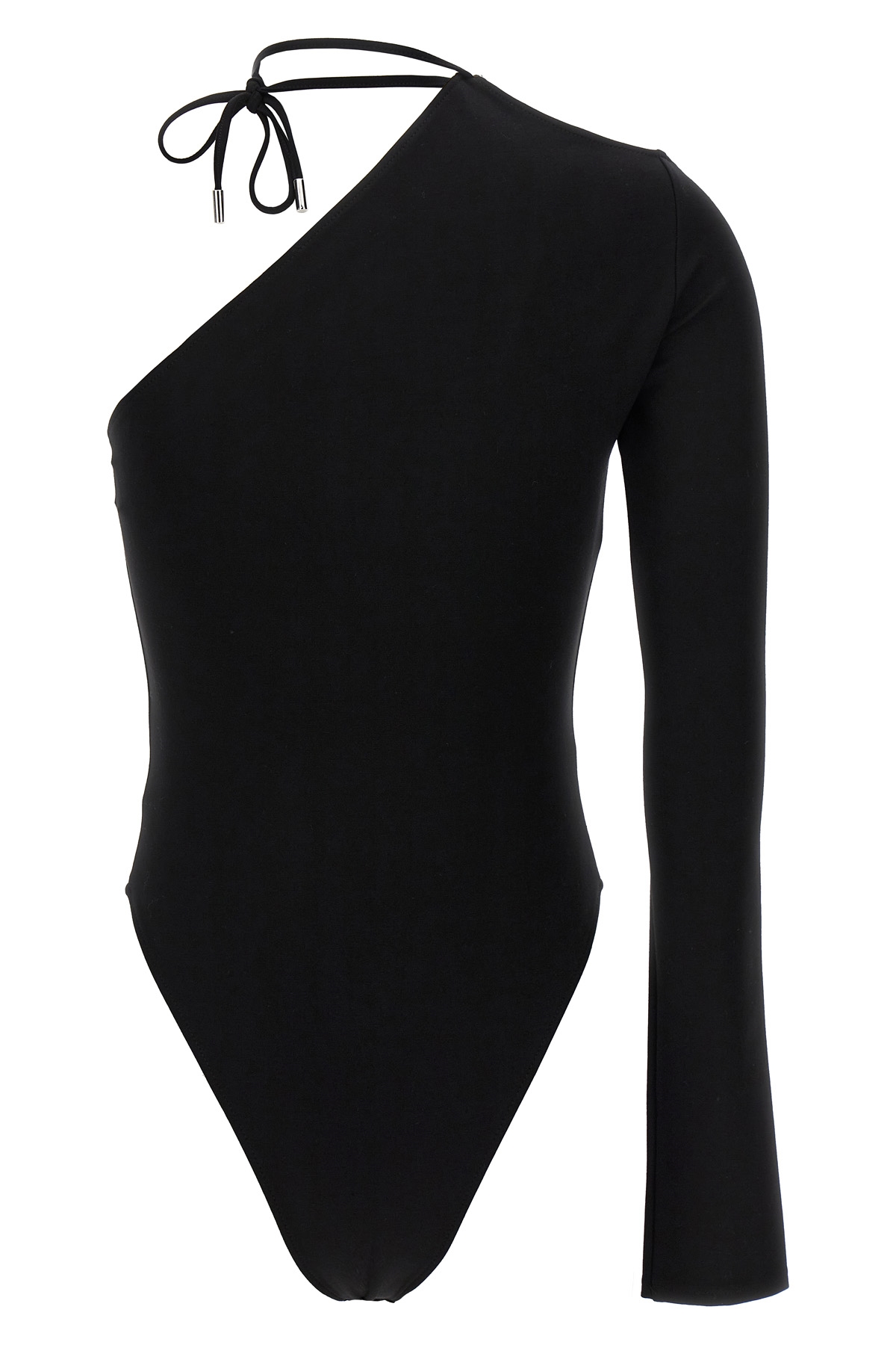 Asymmetrical stretch viscose bodysuit with long sleeves with cut-out detail on the chest and a laced collar.