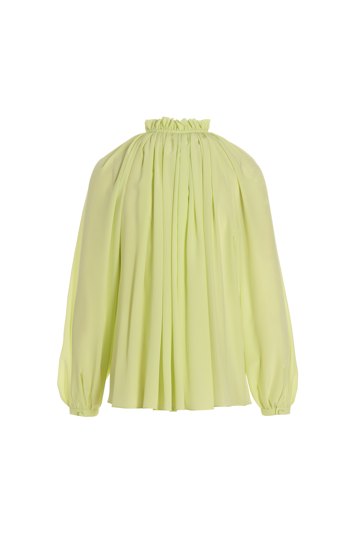 Silk blouse with high collar with djustable drawstring and long cuffed sleeves.