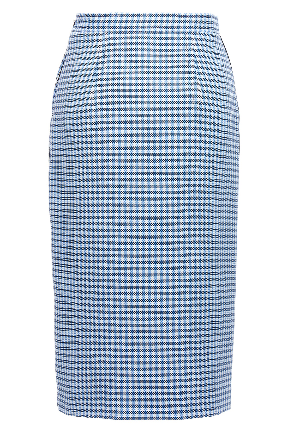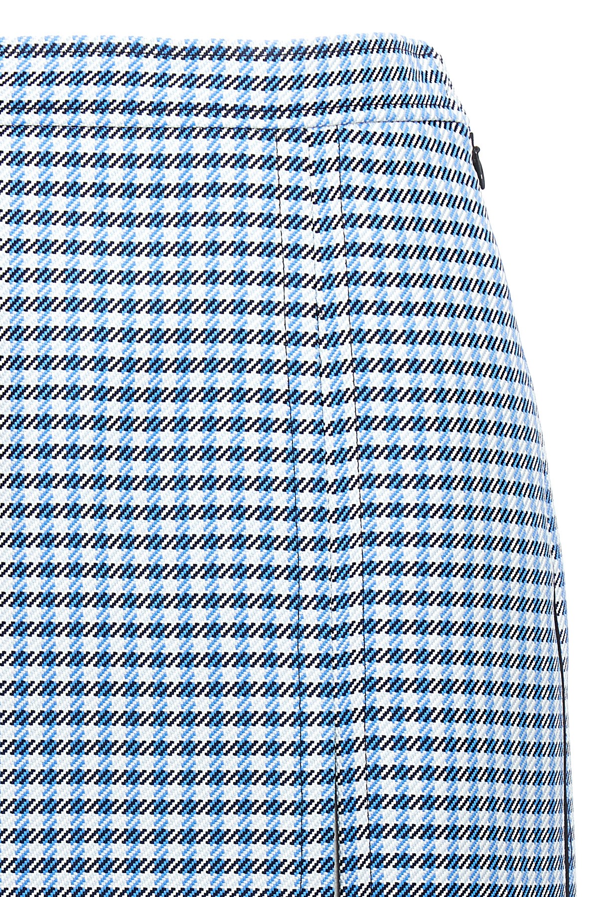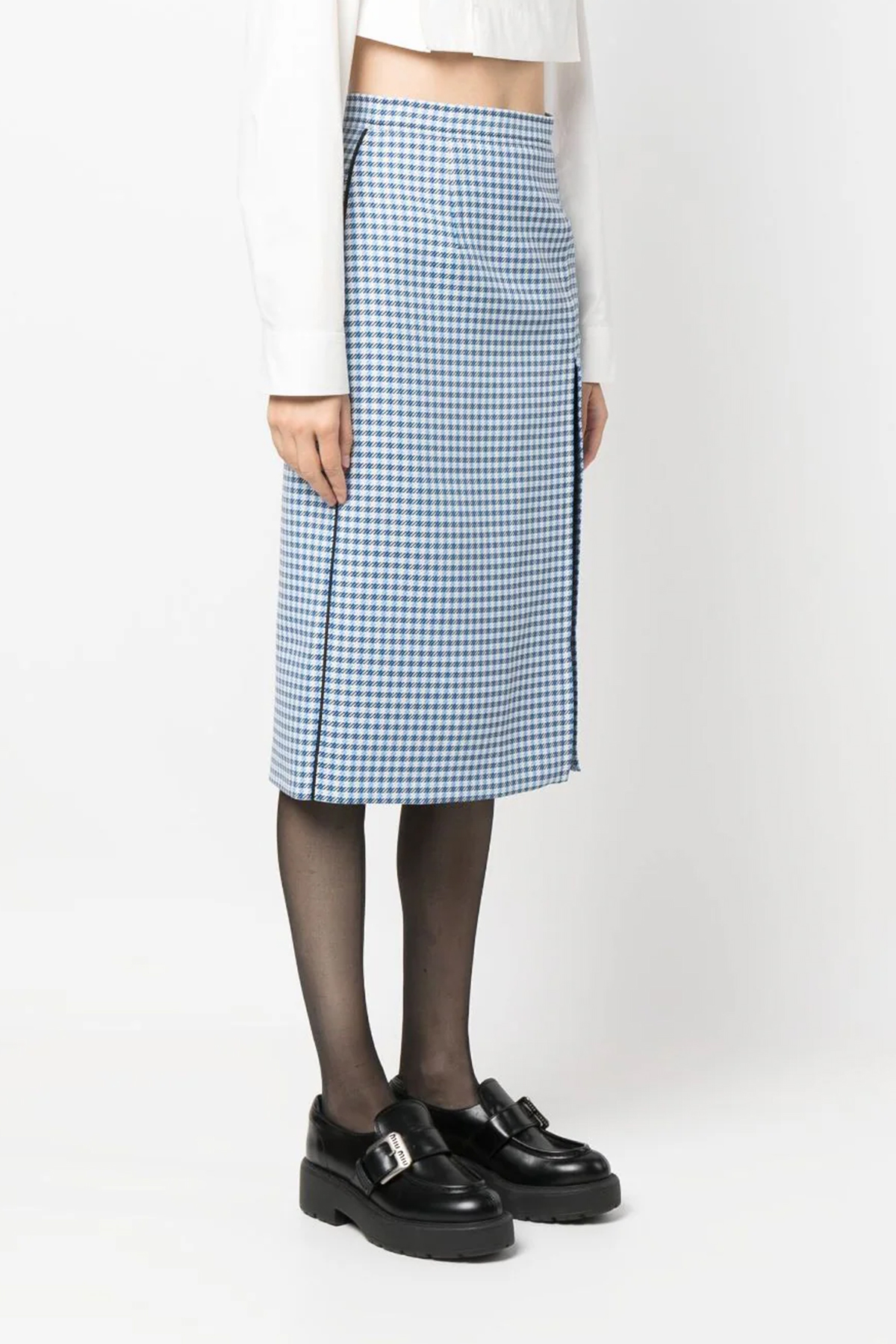 Check print fabric longuette skirt with wide front split, and a side zip closure.