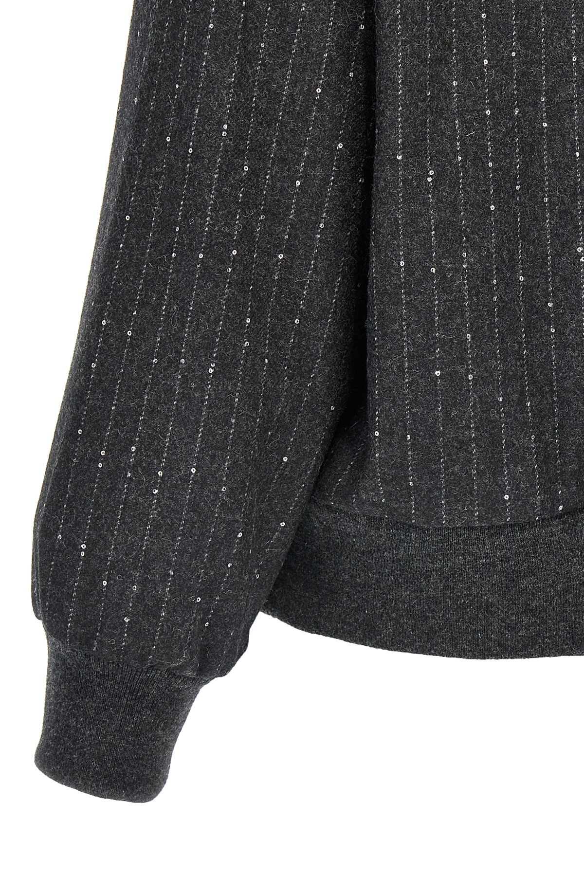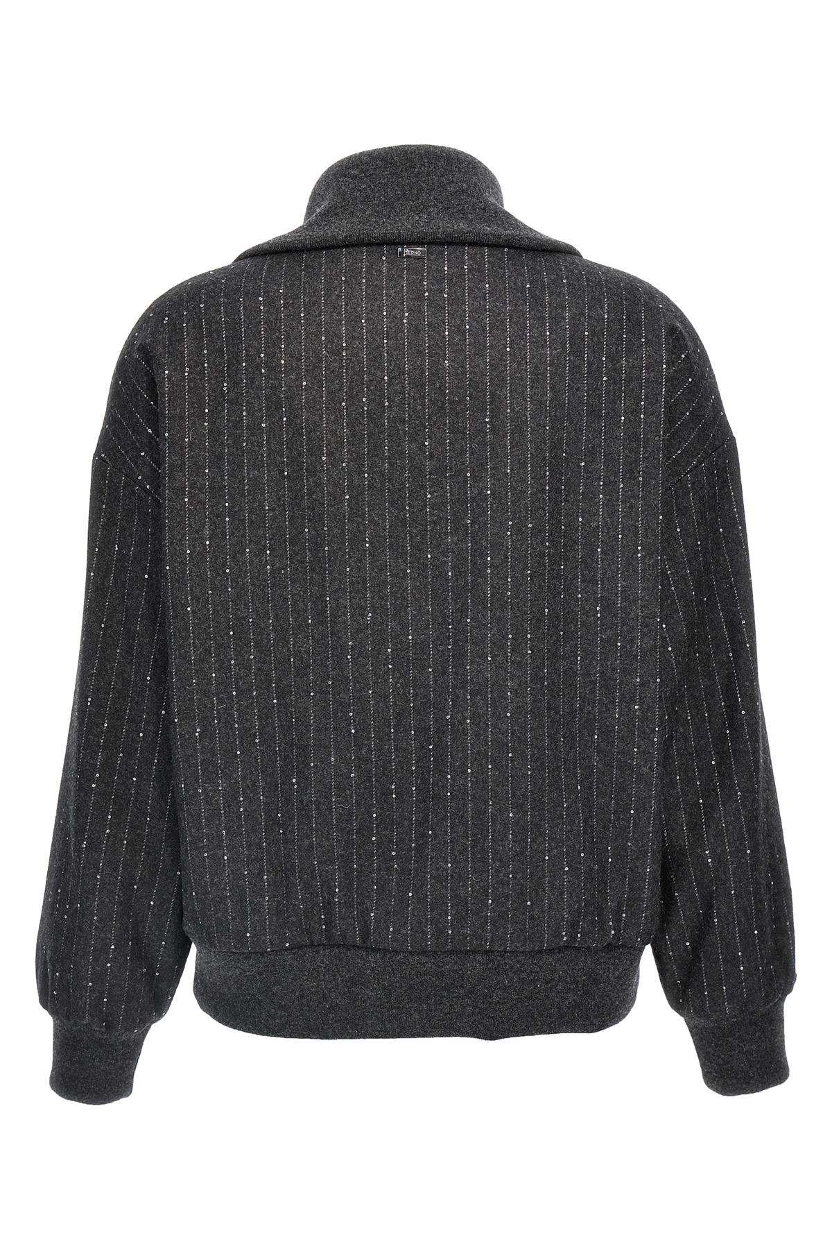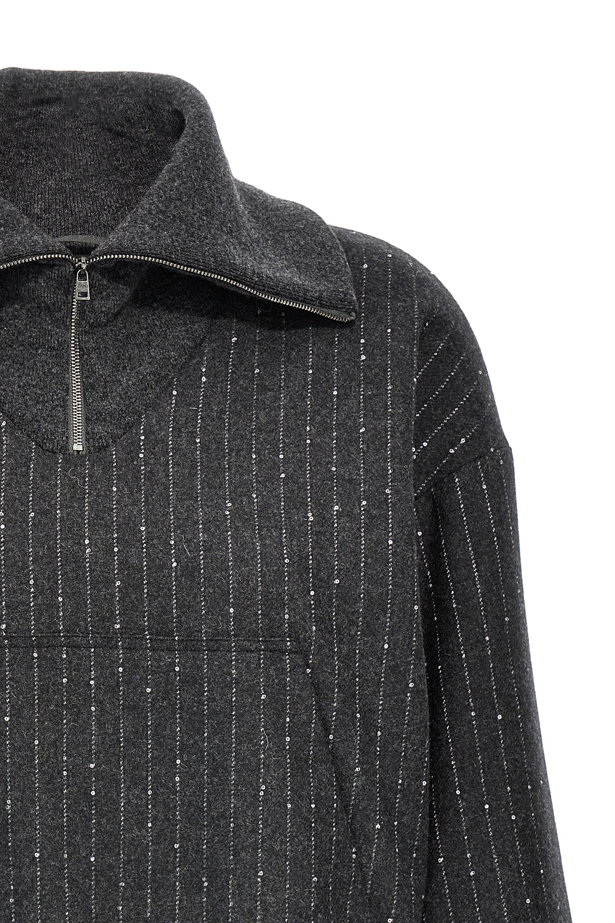 Pinstripe wool blend sweatshirt with sequin applique, kangaroo pocket, half zip, long cuffed sleeves.