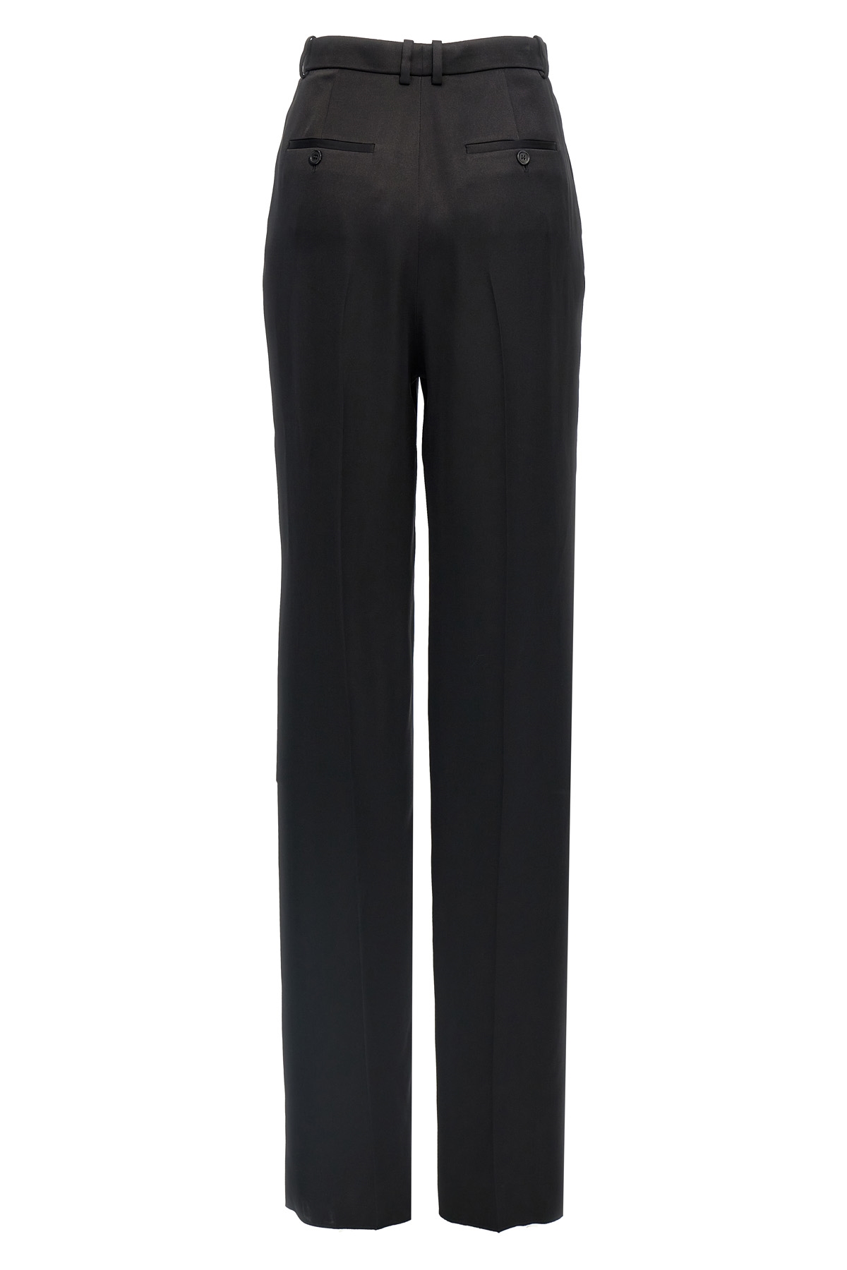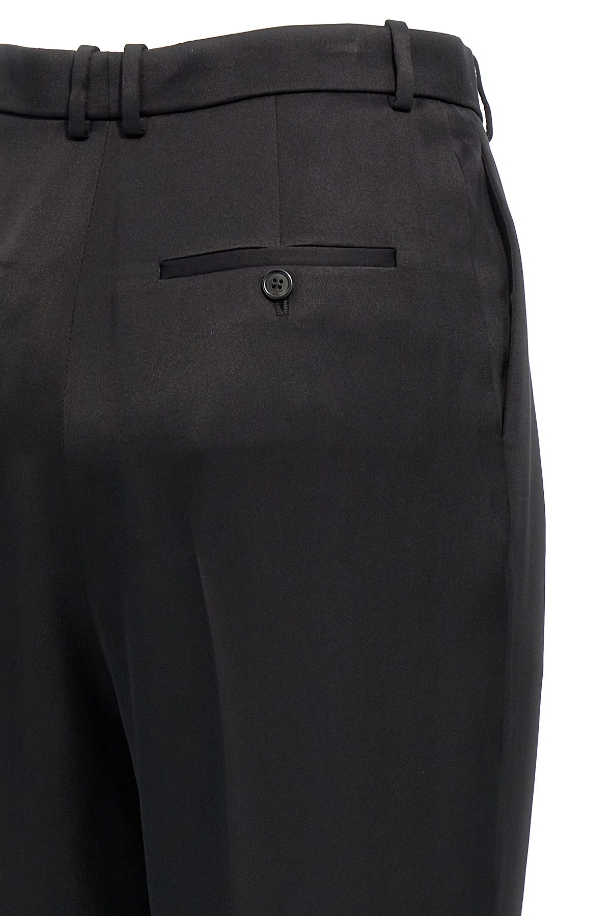 Silk satin trousers, zip and button closure, pockets, pin leg and stretched pleat.