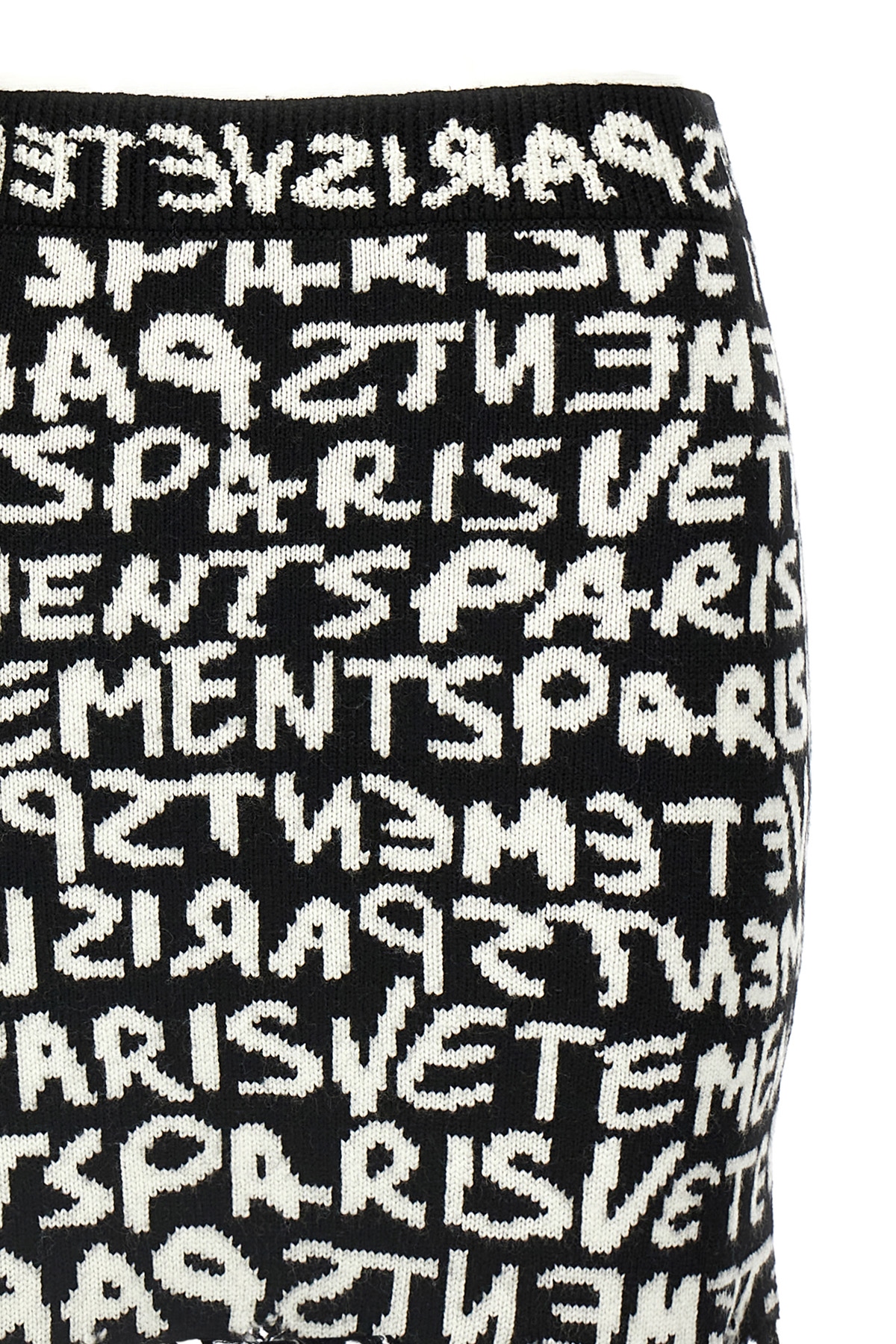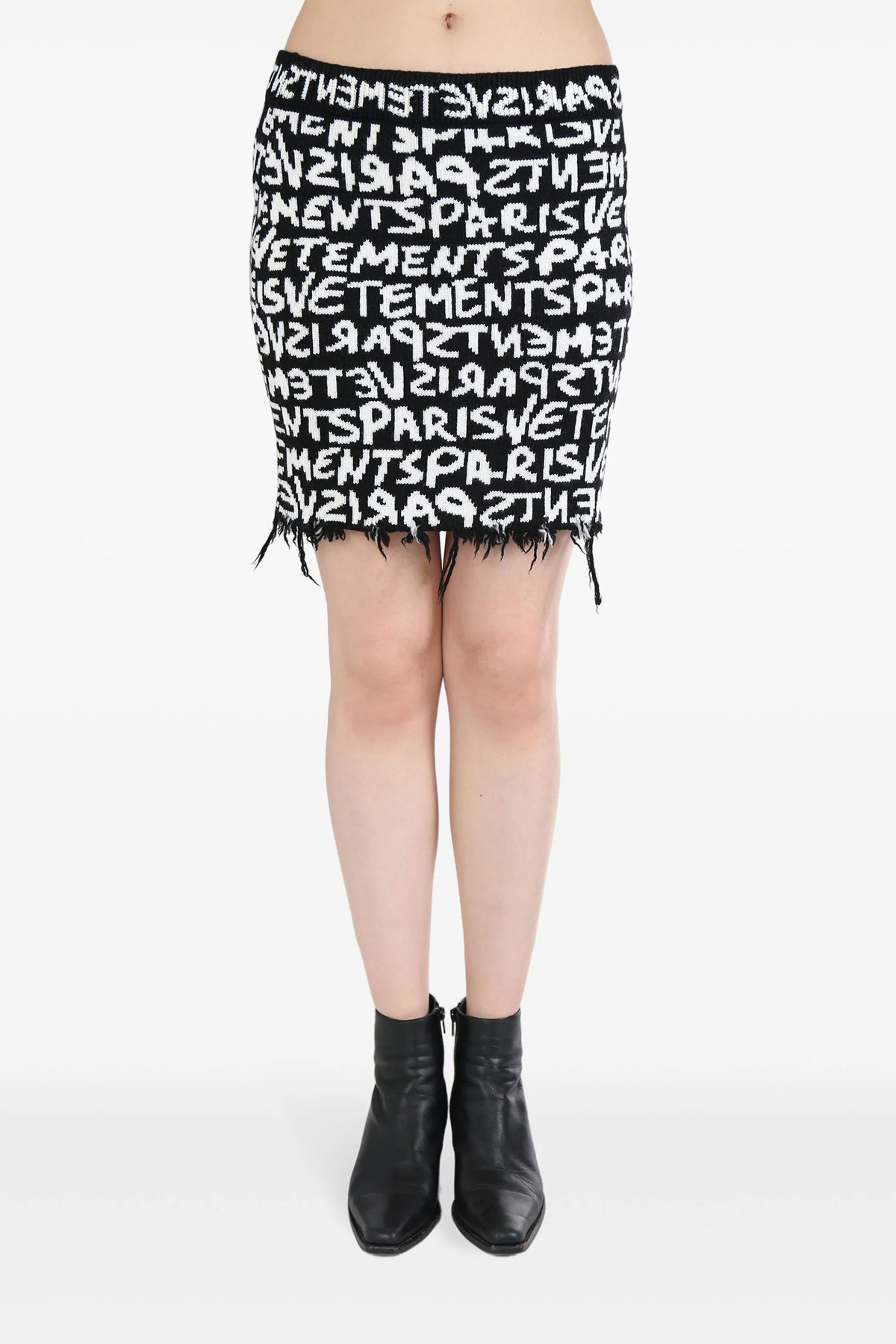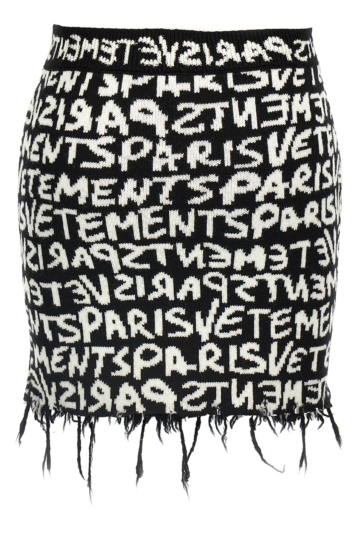 Vetements Paris Monogram Mini' wool knit skirt with all-over jacquard logo, elastic waistband, frayed hem.