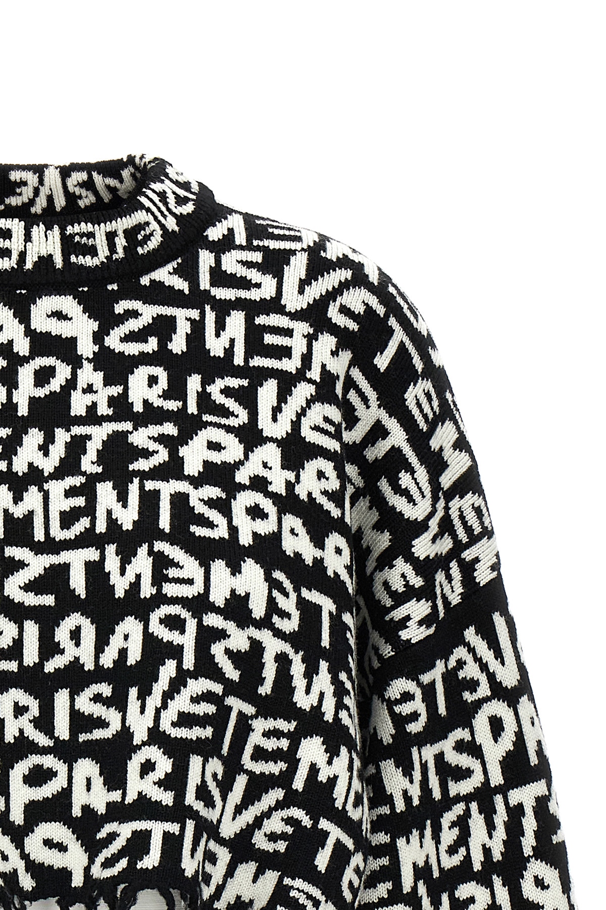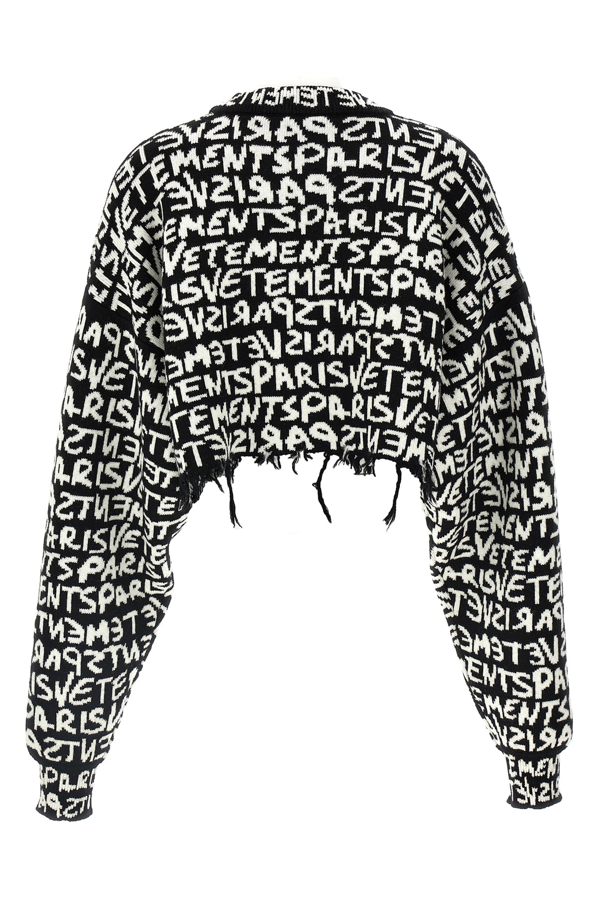 'Vetements Paris Monogram' cropped wool knit sweater with all-over jacquard logo, crew neck, long cuffed sleeves, frayed hem.