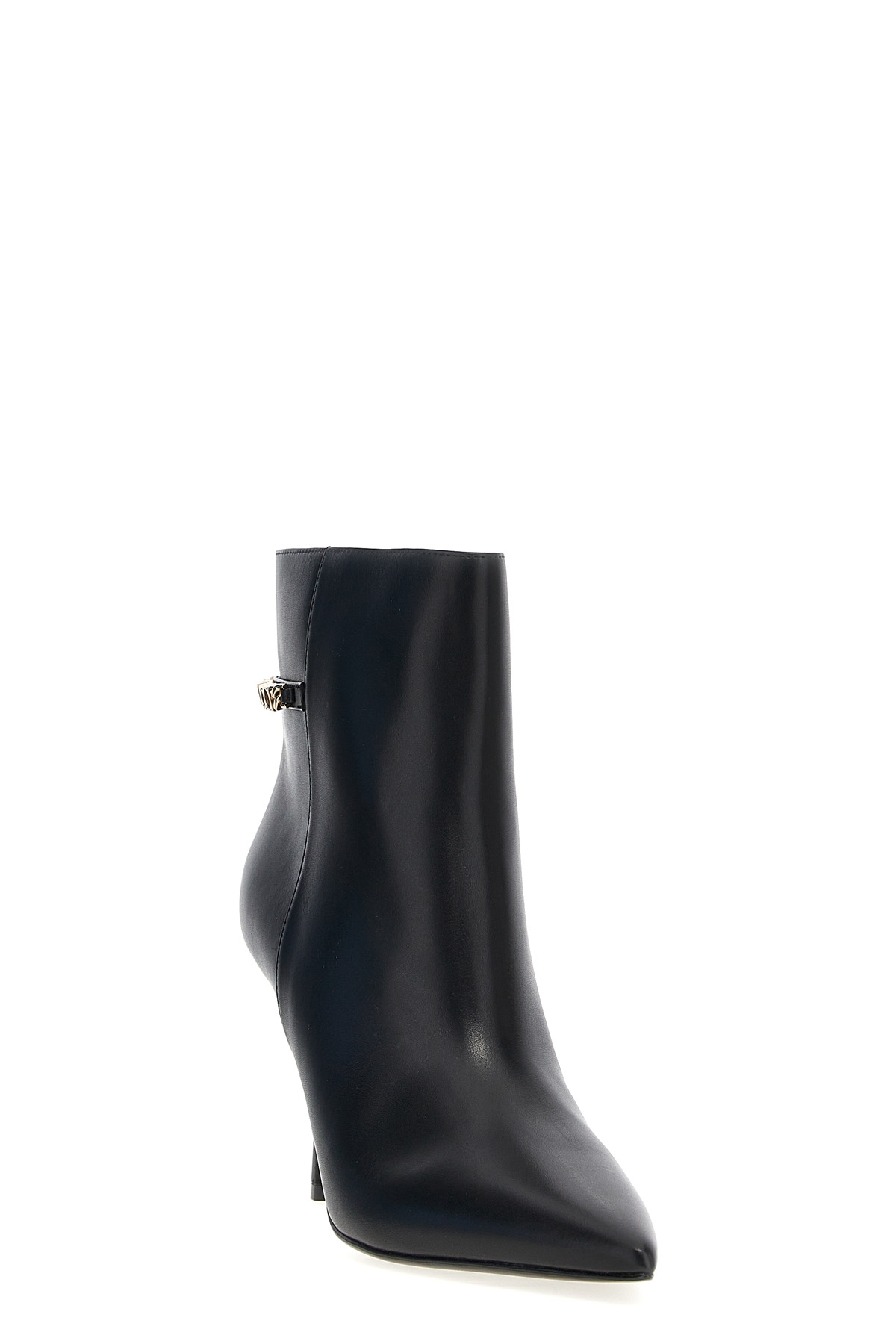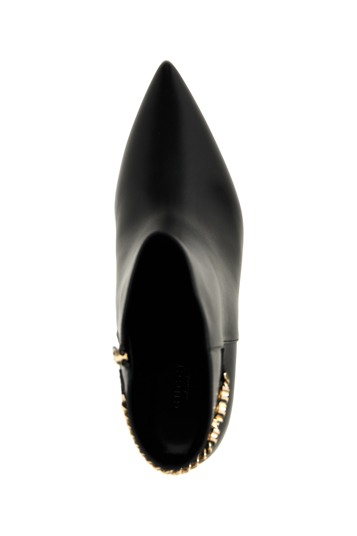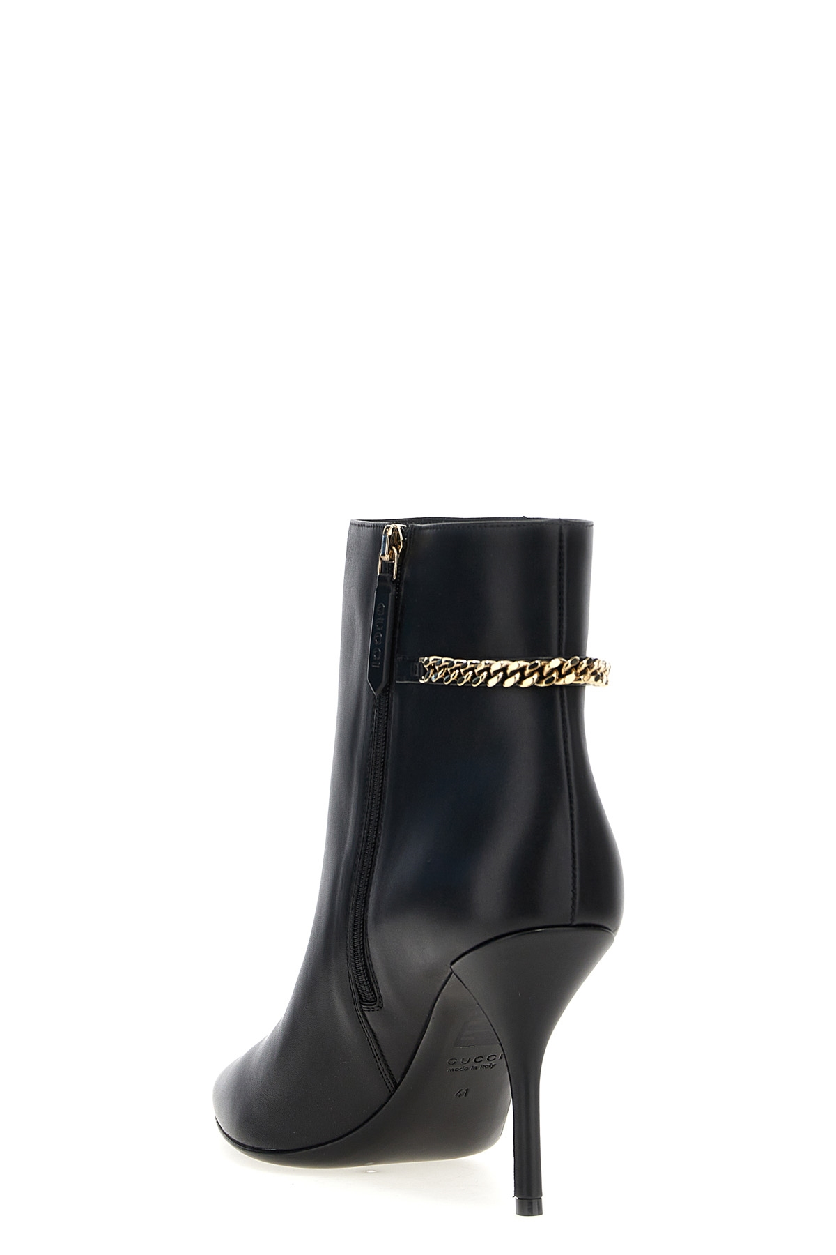 'Gucci Signoria' leather ankle boots with gold metal chain detail and logo, side zip closure, heel.
