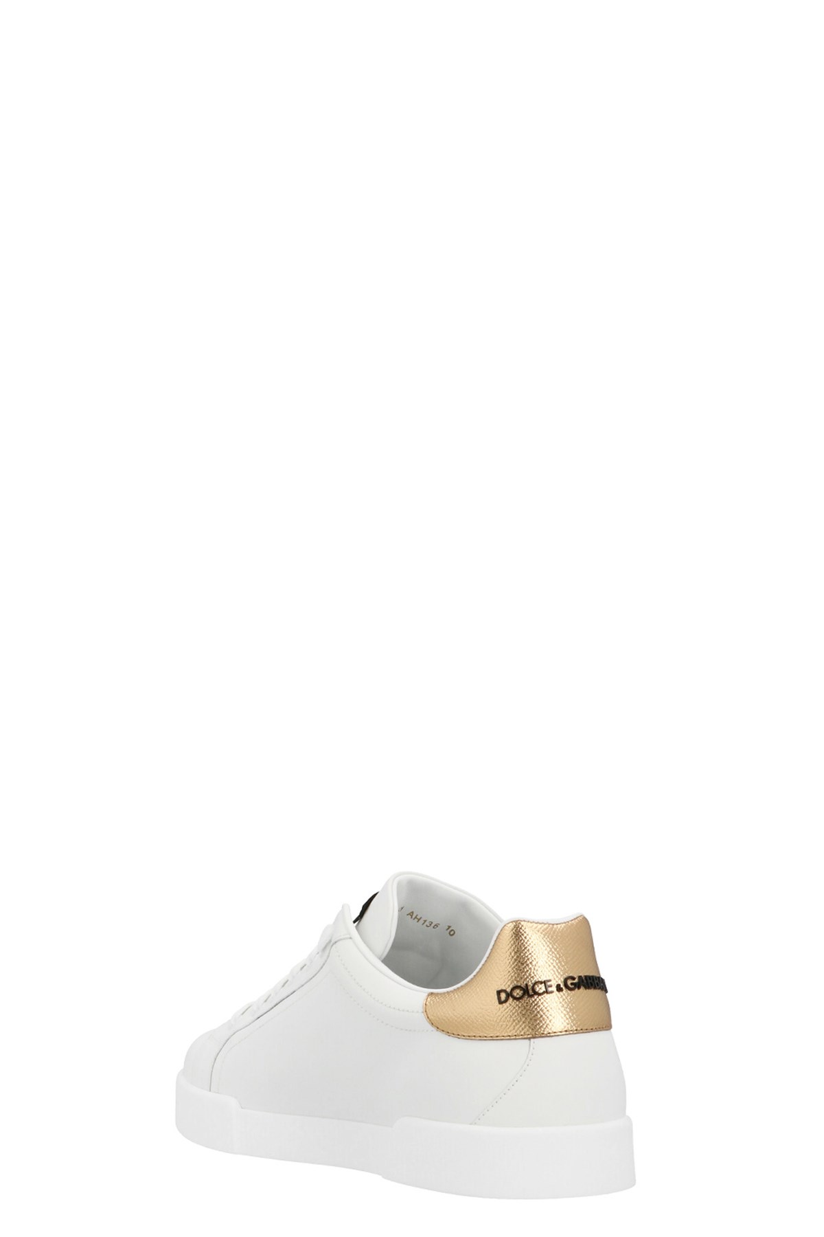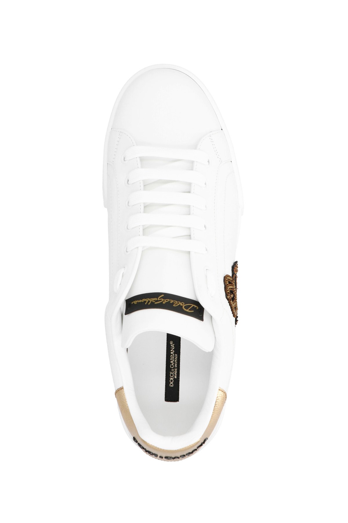 Dolce & Gabbana signature 'Portofino' leather lace-up sneakers with an embroidered sacred heart logo patch, gold metallic leather insert on the heel tab.