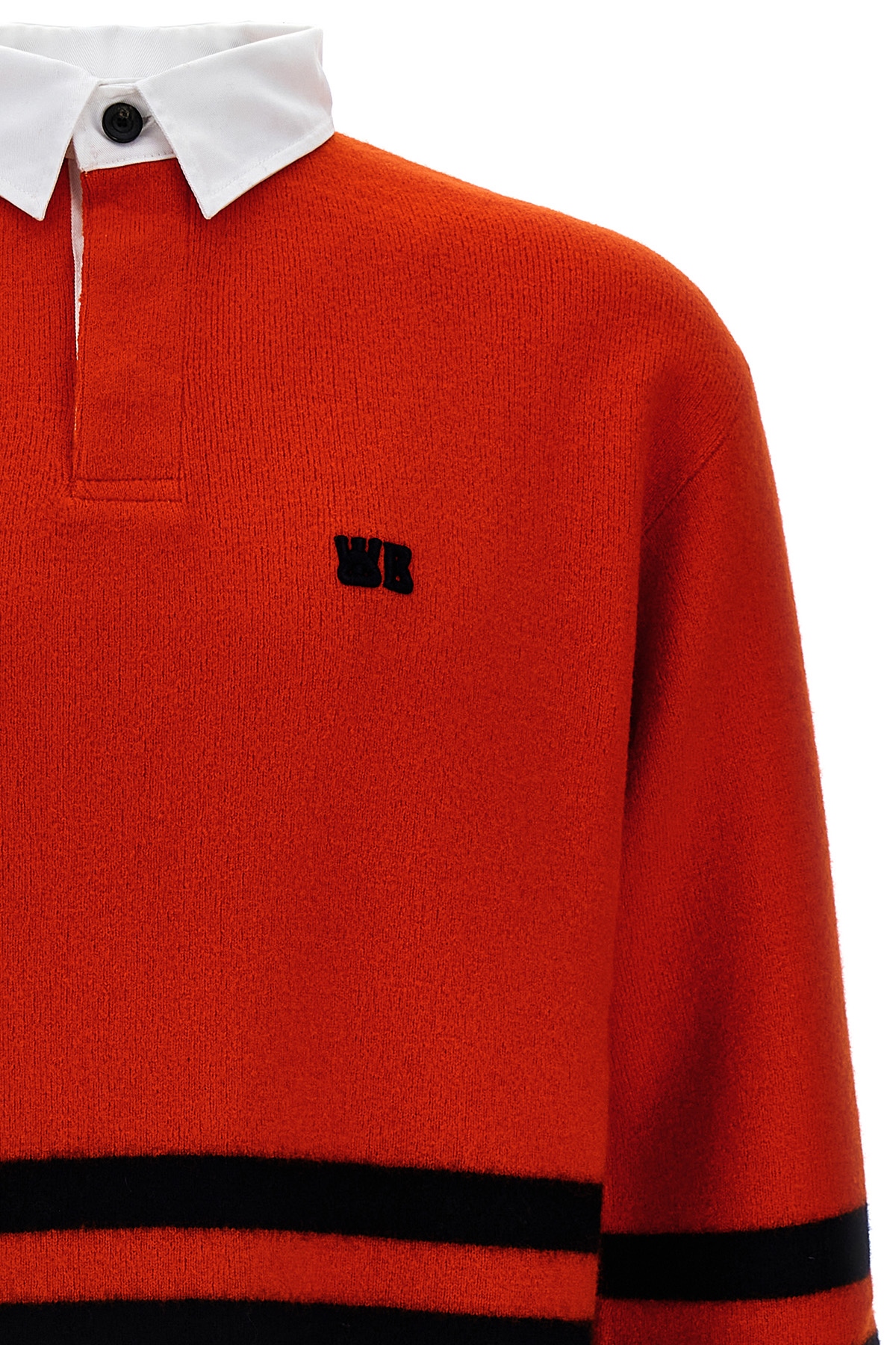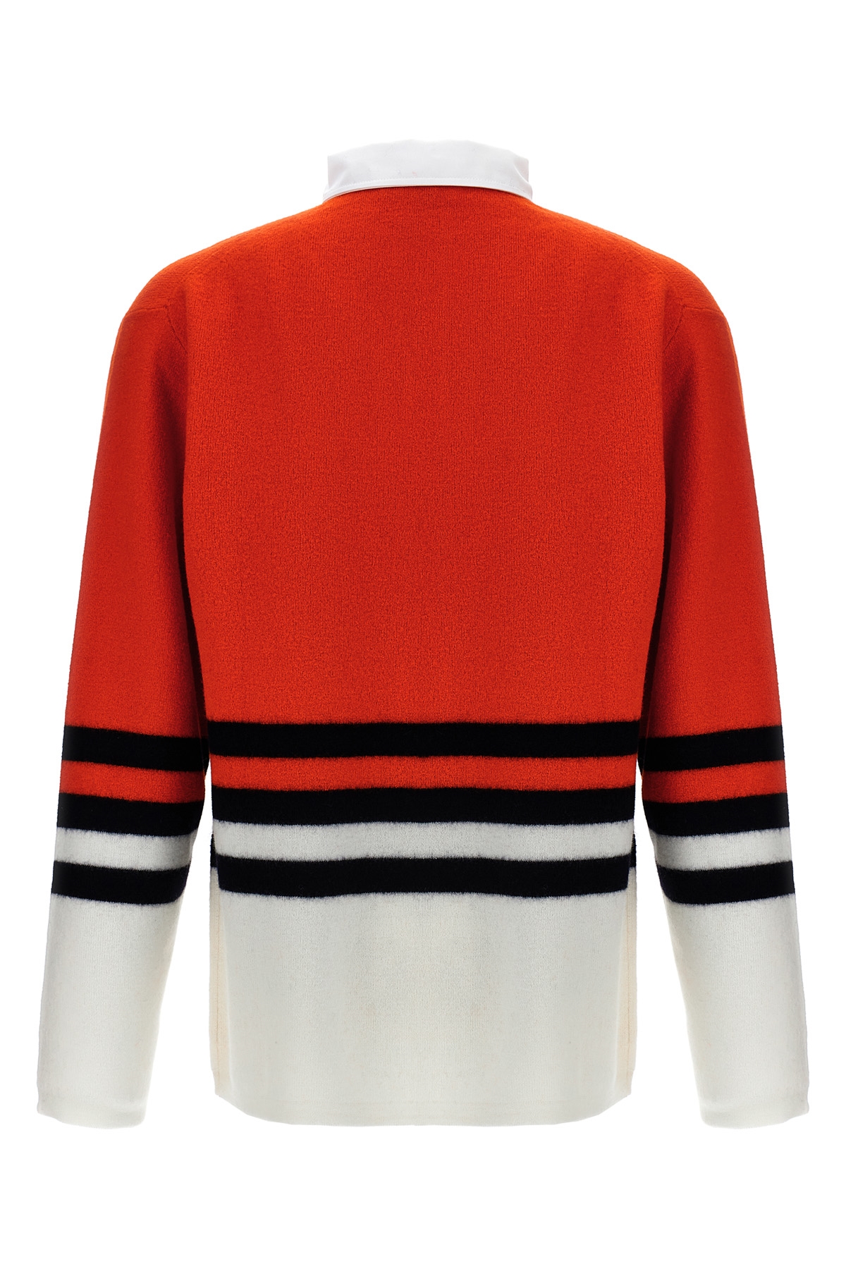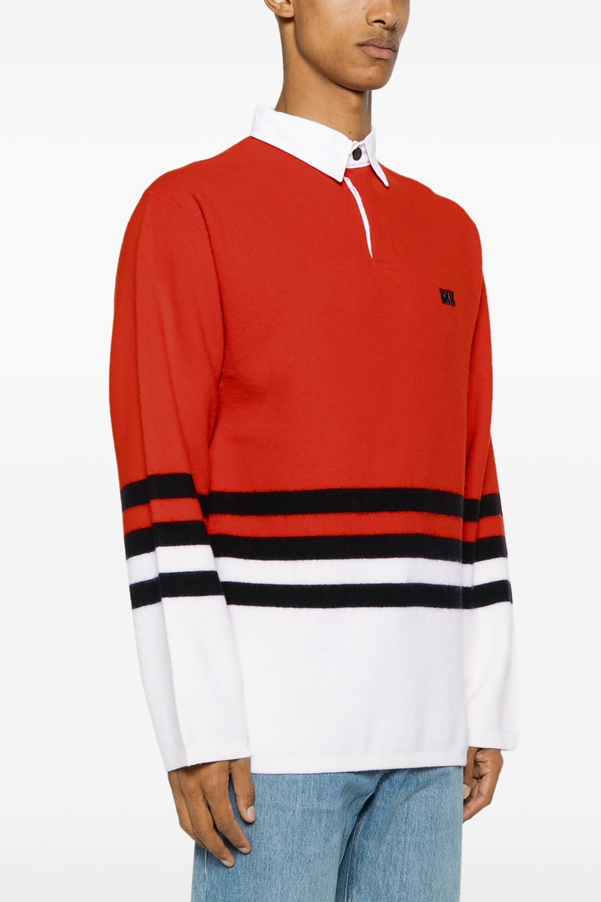 'Cypher' striped wool knit polo shirt with contrast collar, front logo embroidery, long sleeves.