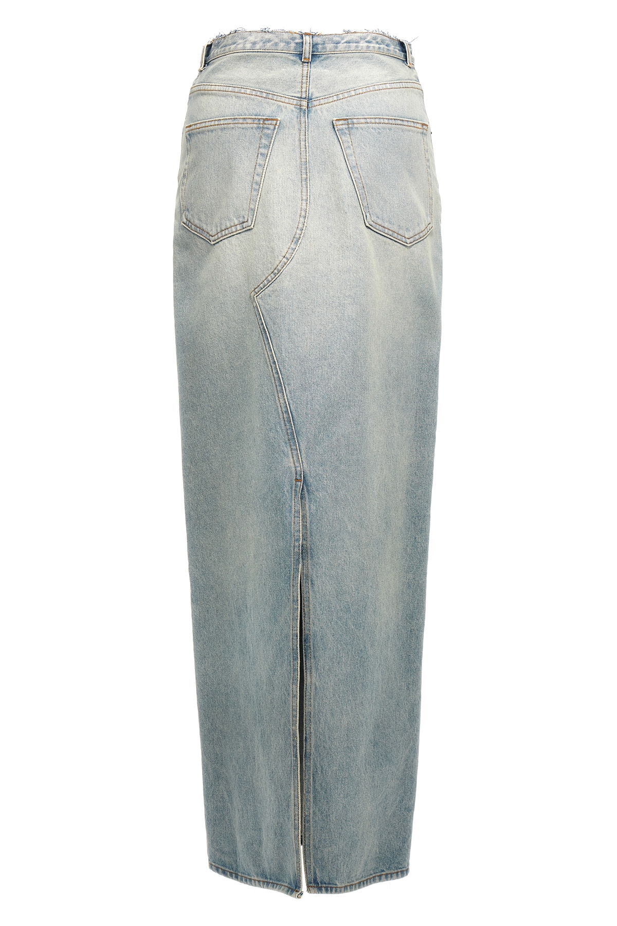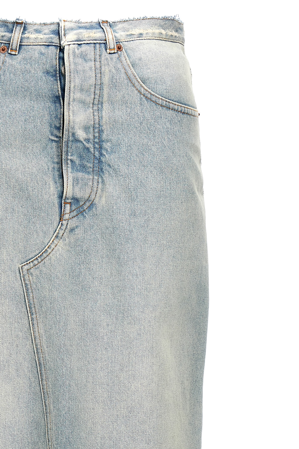 Long skirt in cotton denim with front and back slits, button closure, five pockets, frayed details at the waist.
