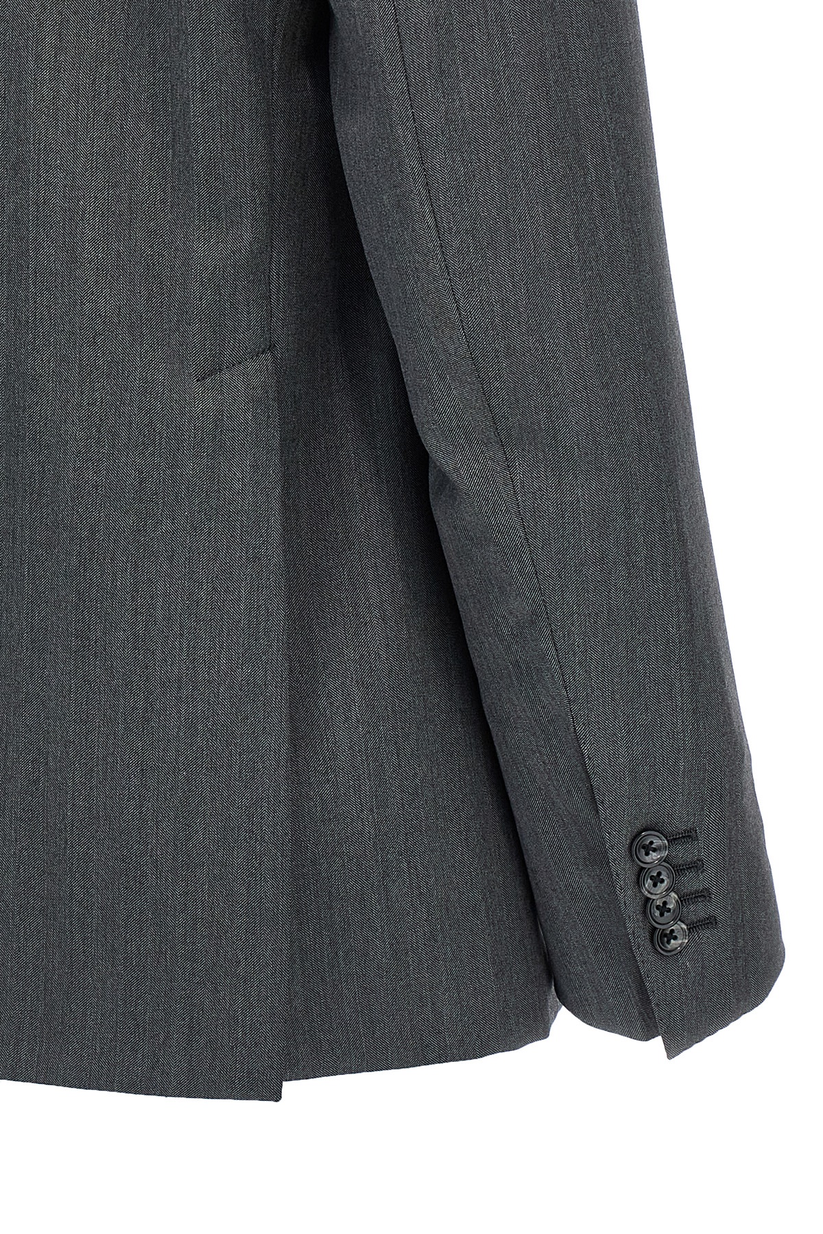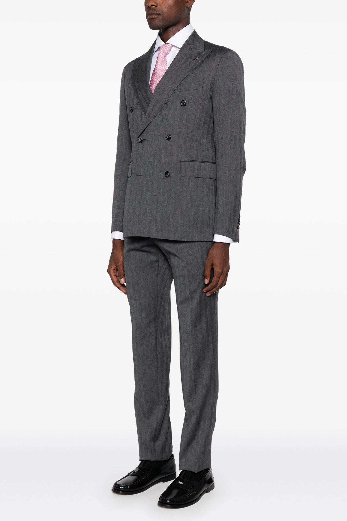 Super 130's virgin wool dress with chevron pattern, consisting of double-breasted blazer with button closure, pockets, long sleeves and back slits, pants with pence and ironed pleat, zip and button closure, pockets.