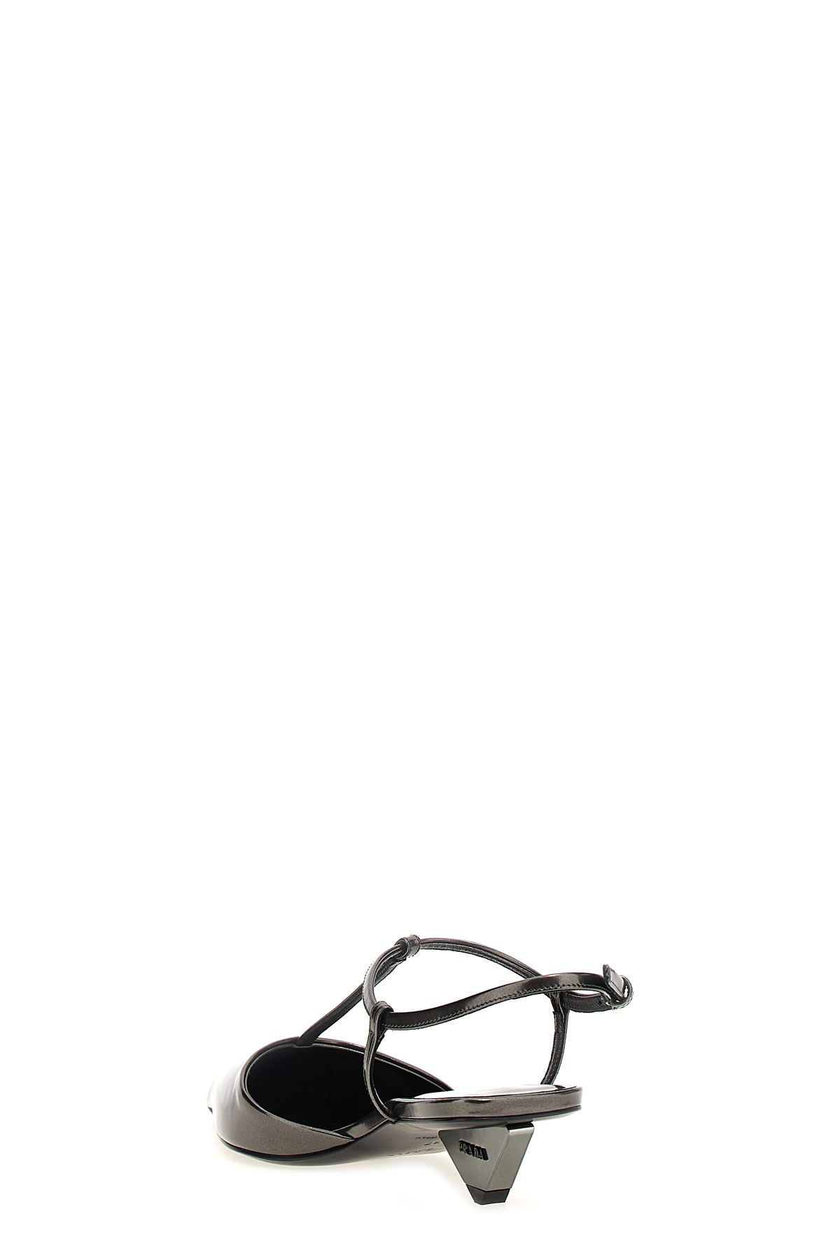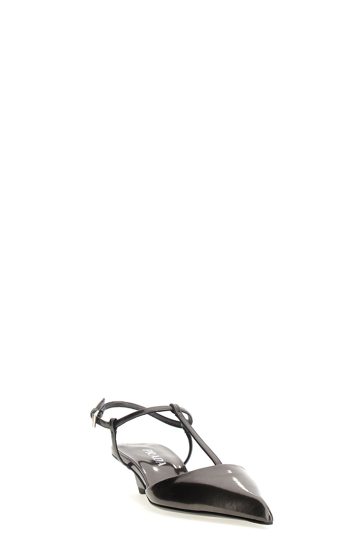 Laminated patent leather pumps with adjustable strap, pointed toe style with geometric heel.