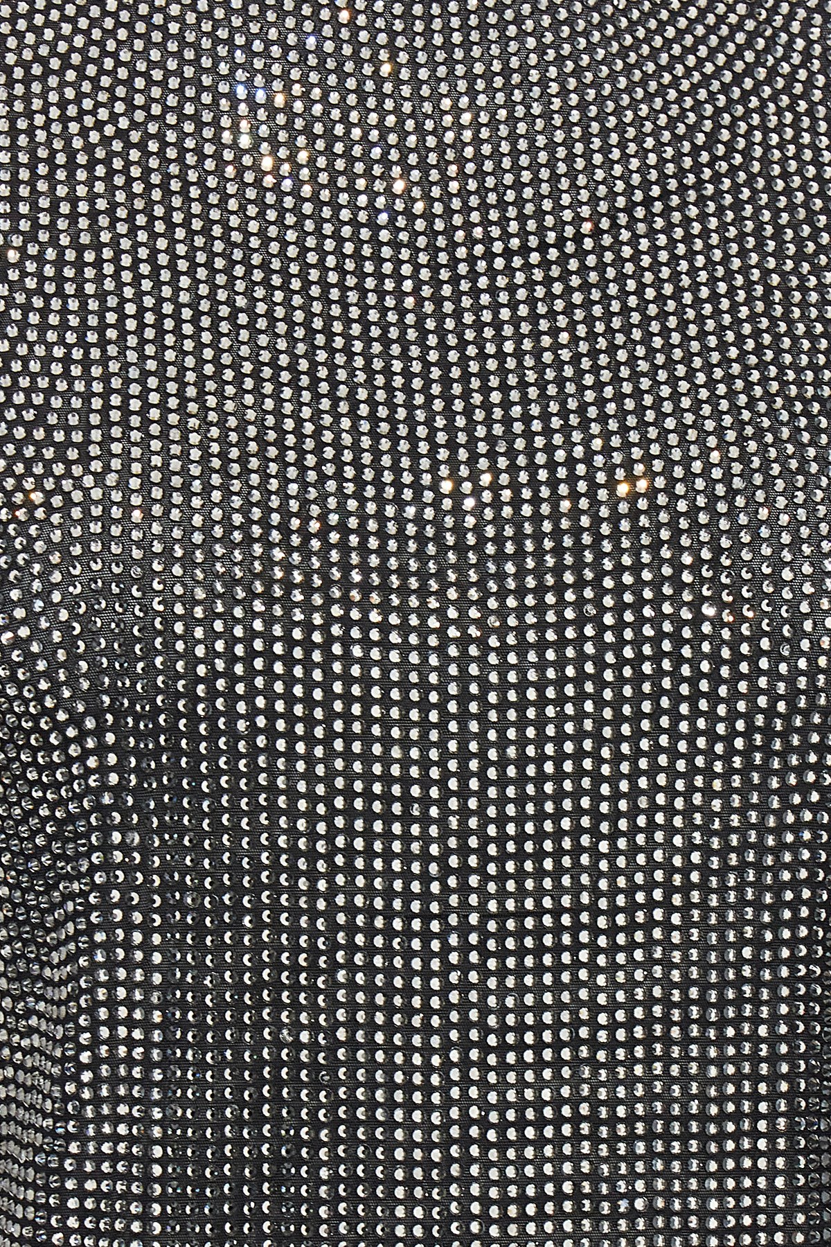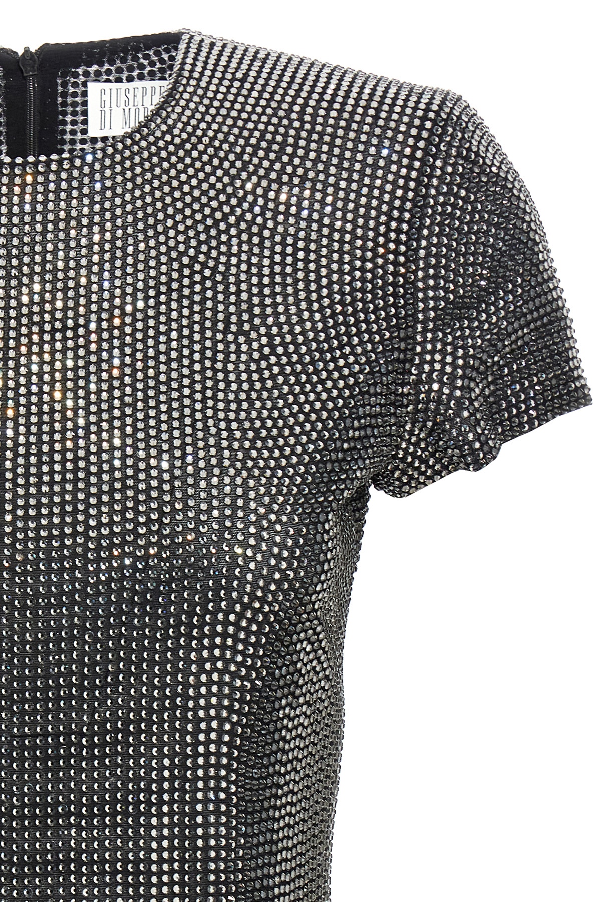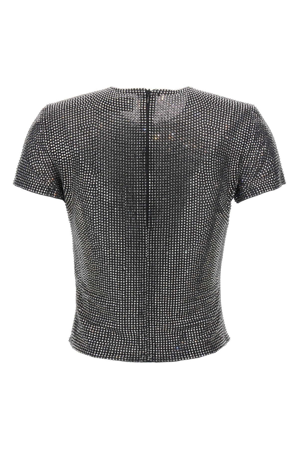 Mesh fabric T-shirt with all-over rhinestones, crew neck, short sleeves, back zip closure.