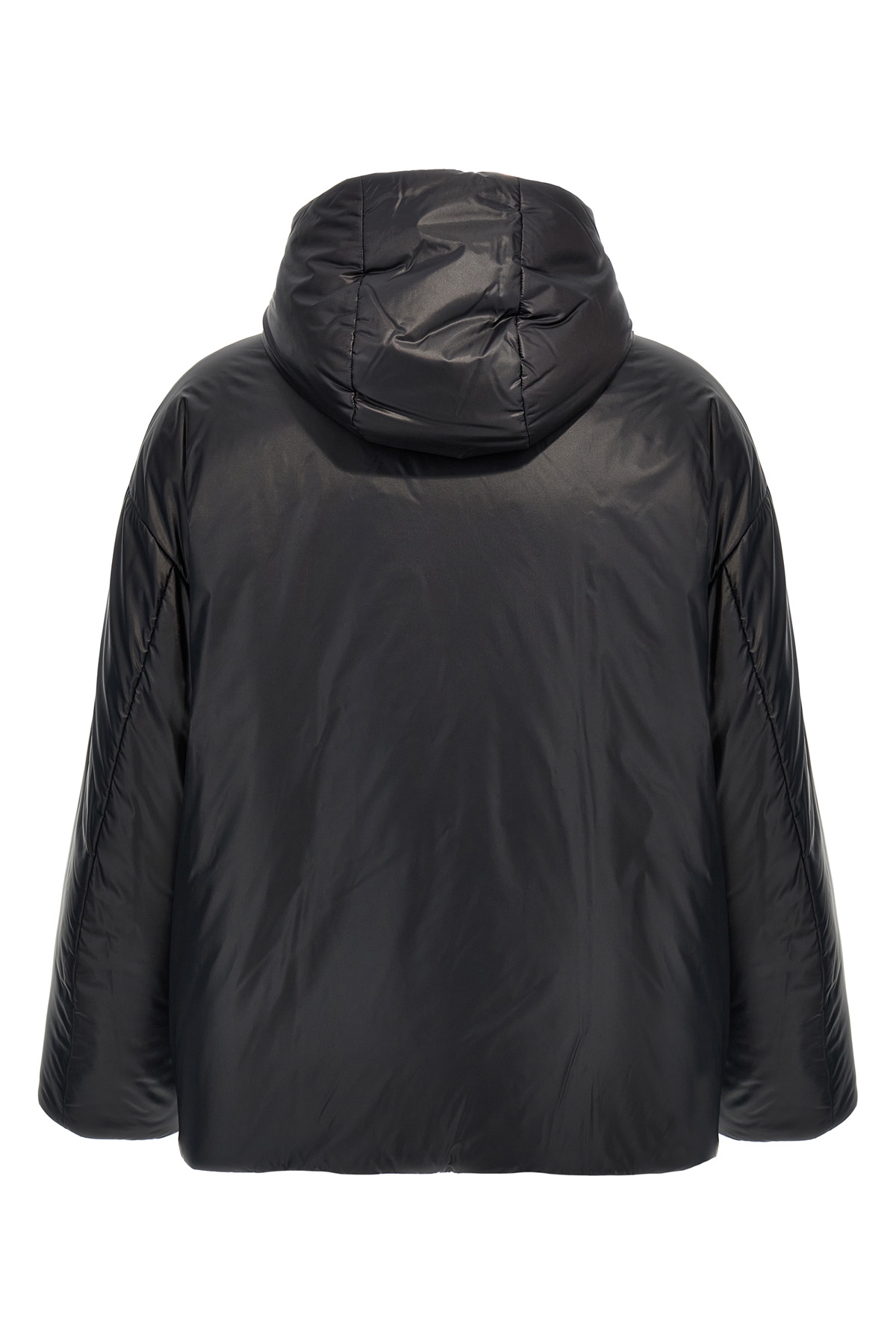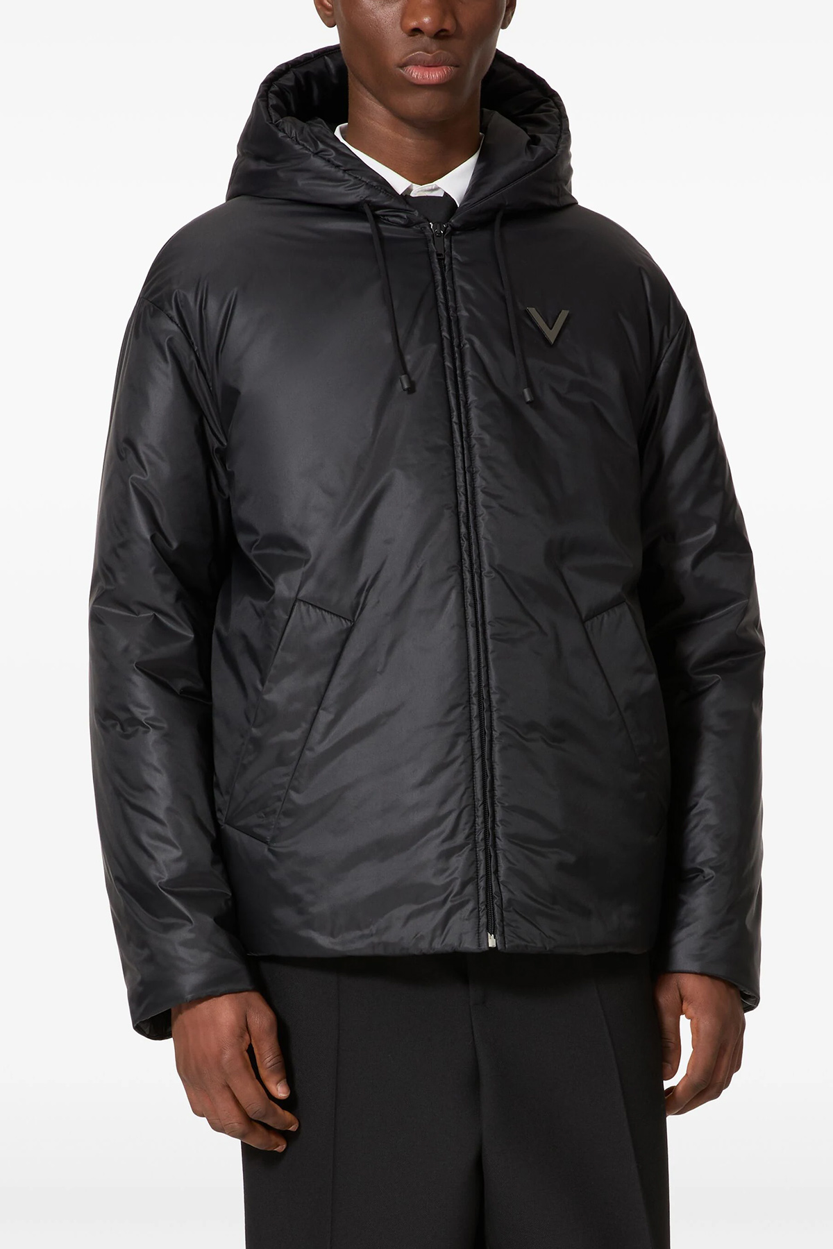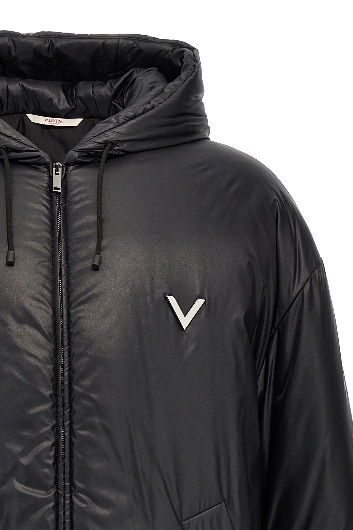 Padded nylon down jacket, front metal 'V Detail' application, hood, zip closure, pockets, long sleeves.