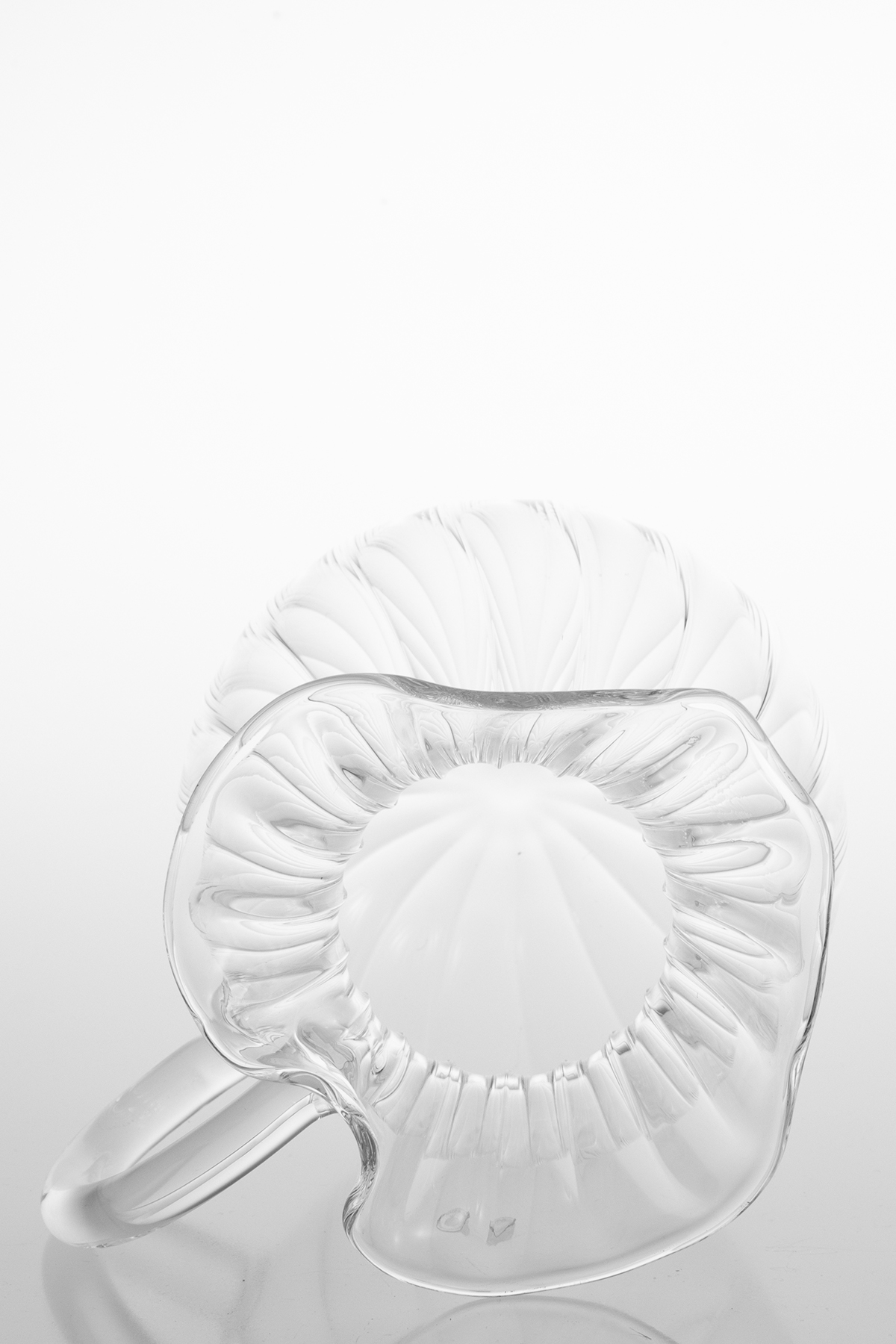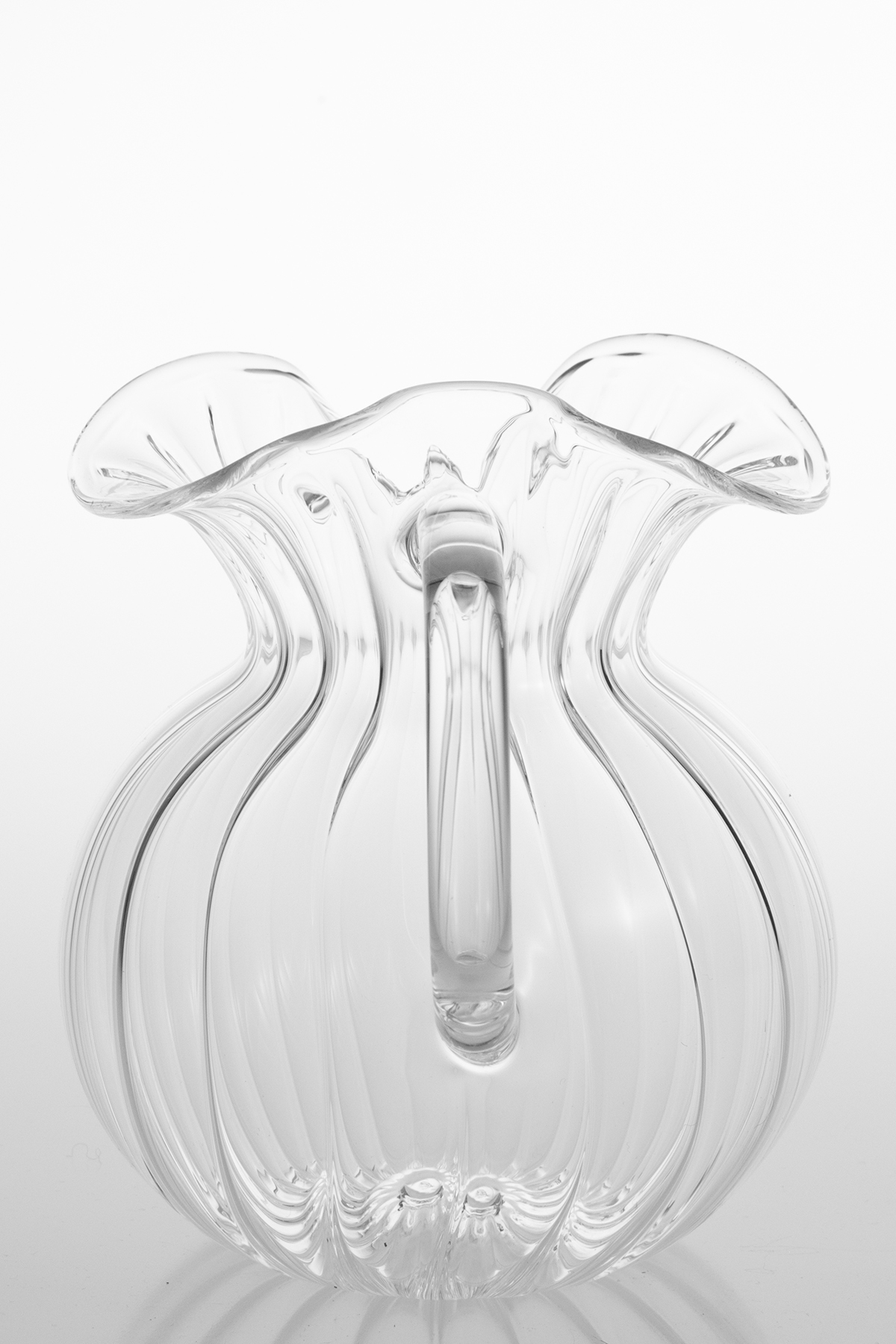 'Torcello' jug in mouth-blown borosilicate glass. Decorated manually with colored glass rods spread in flame.
