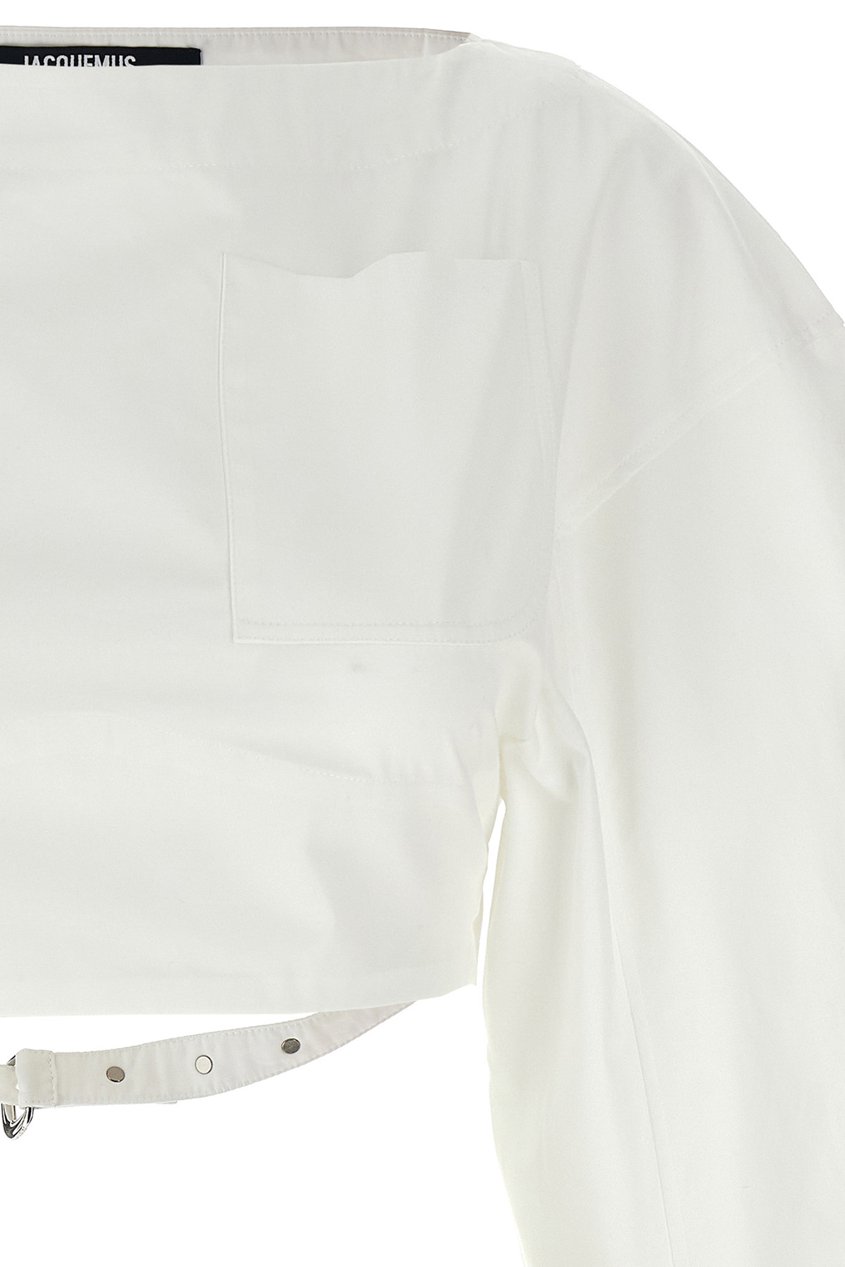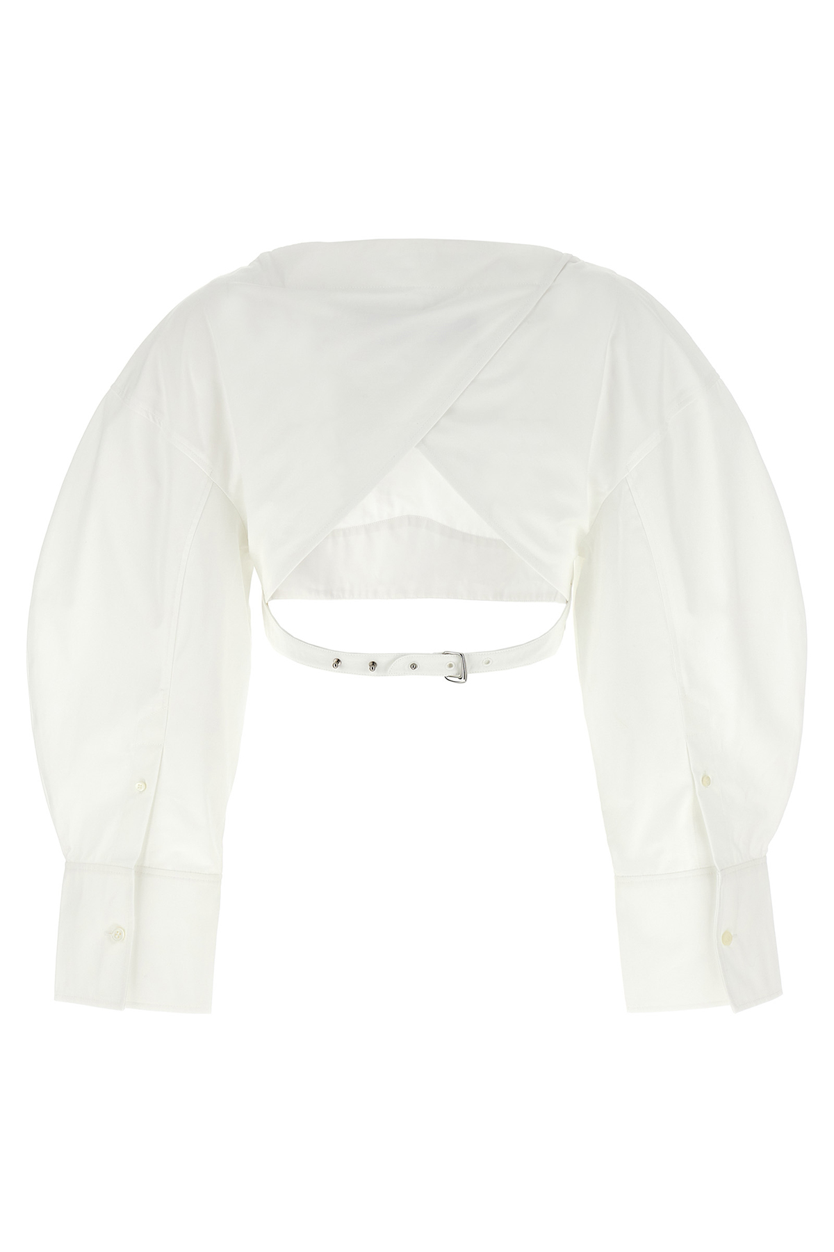 'Le haut Casaco' cotton blouse, boat neck, cropped style with cut out detail at the back and adjustable strap, long sleeves with cuffs.