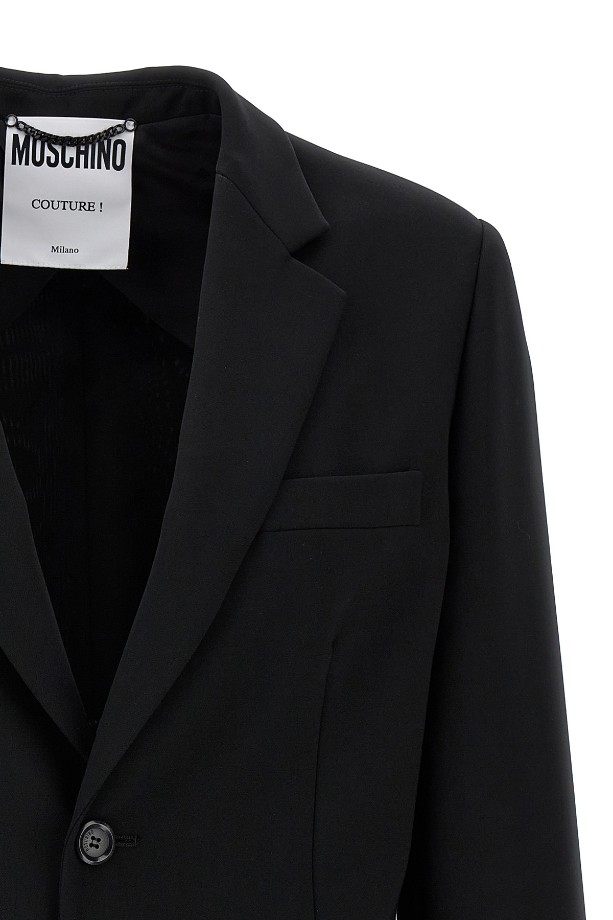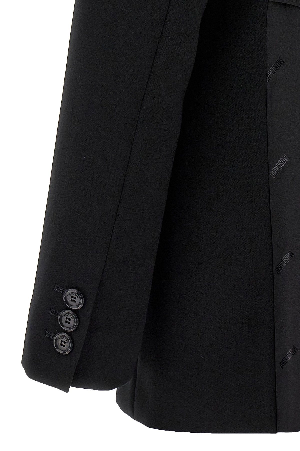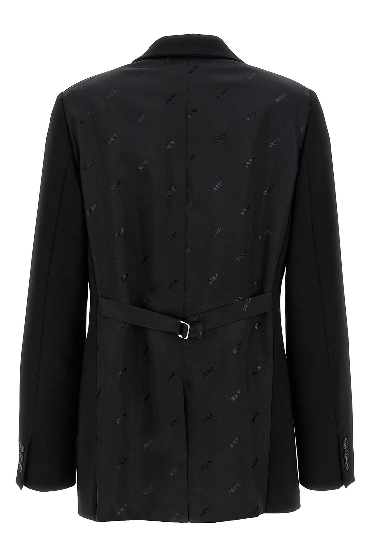 Single-breasted blazer with button closure, back logo fabric detail and martingale, pockets, long sleeves, padded shoulders.