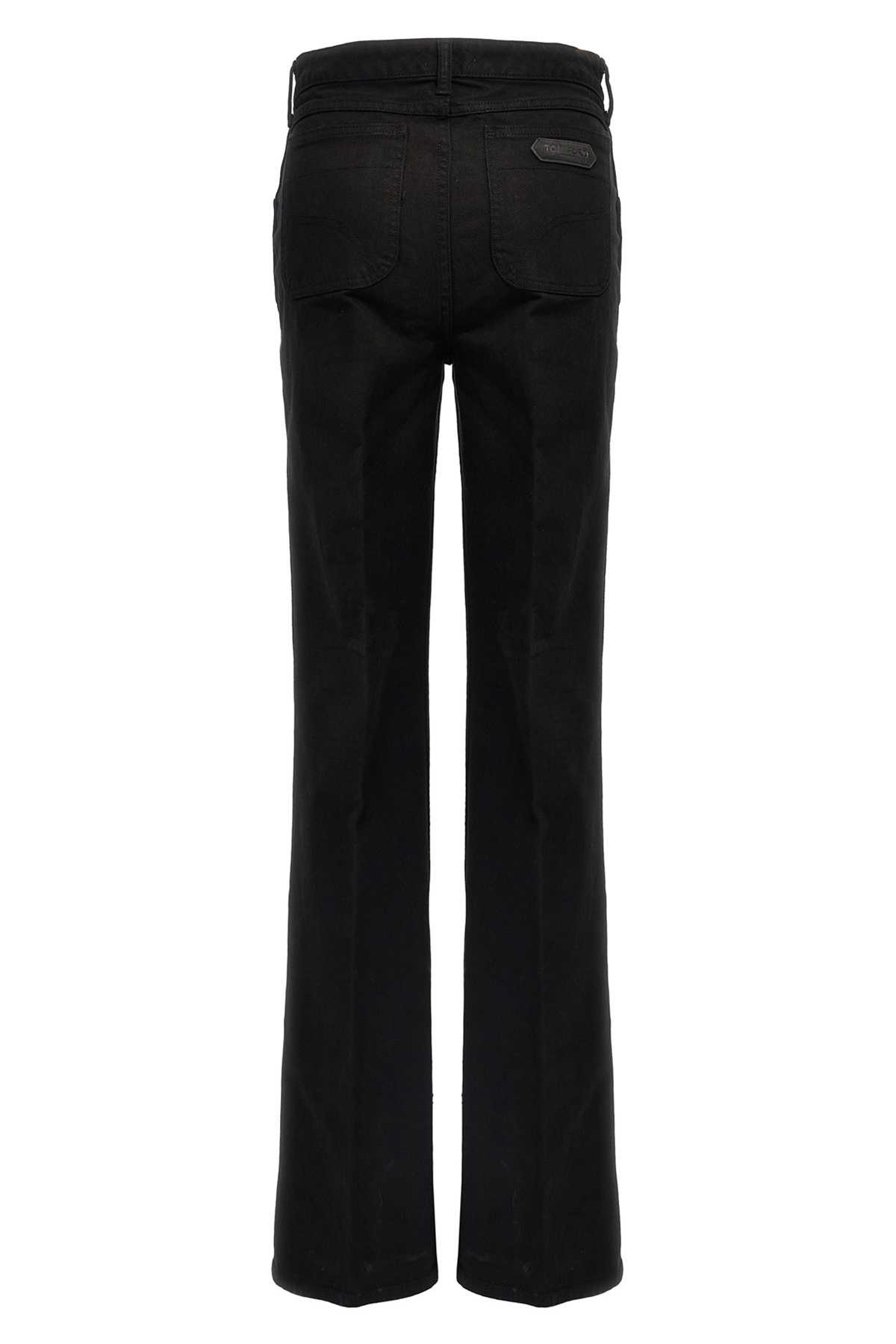 Stretch cotton denim jeans with flared leg with stretched pleat, zip and button closure, five pockets, leather logo patch on the back.