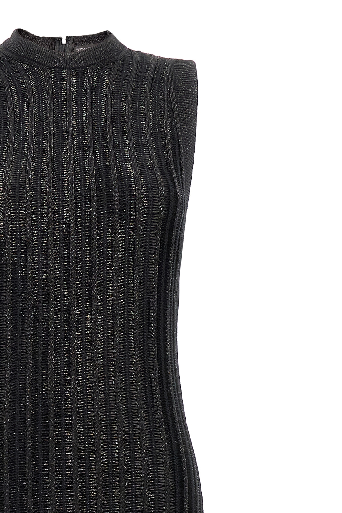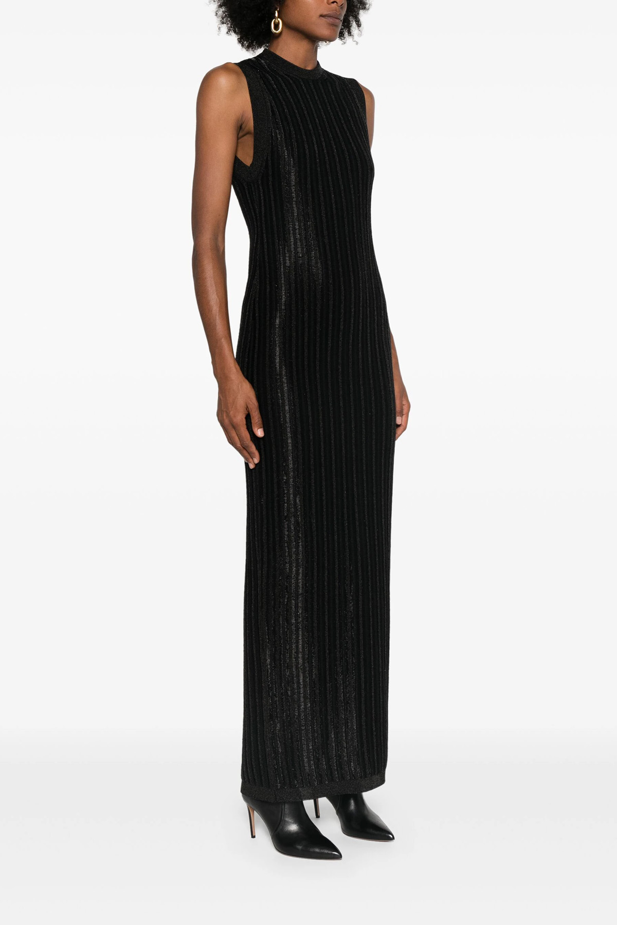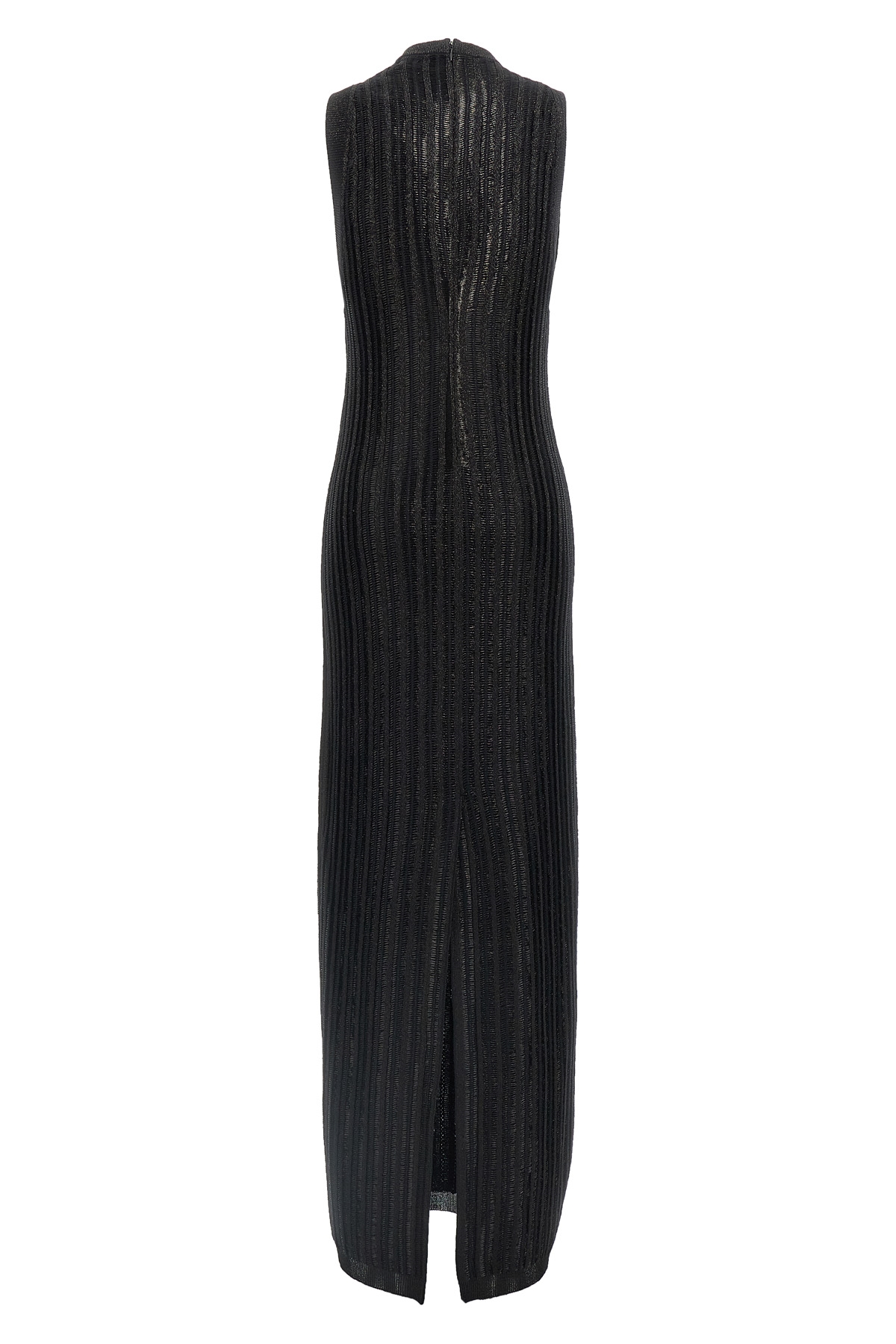 Long laminated knit dress, high neck, sleeveless, zip closure and back split.