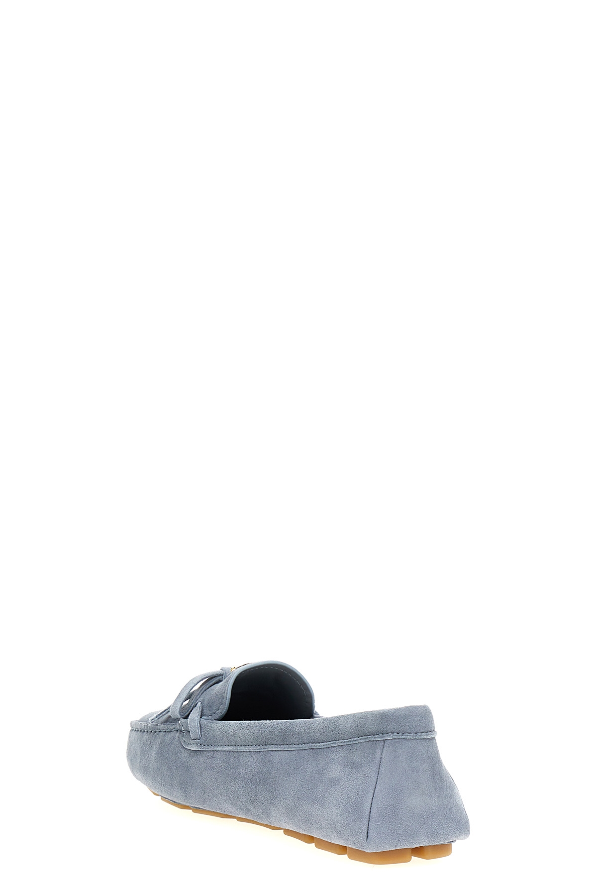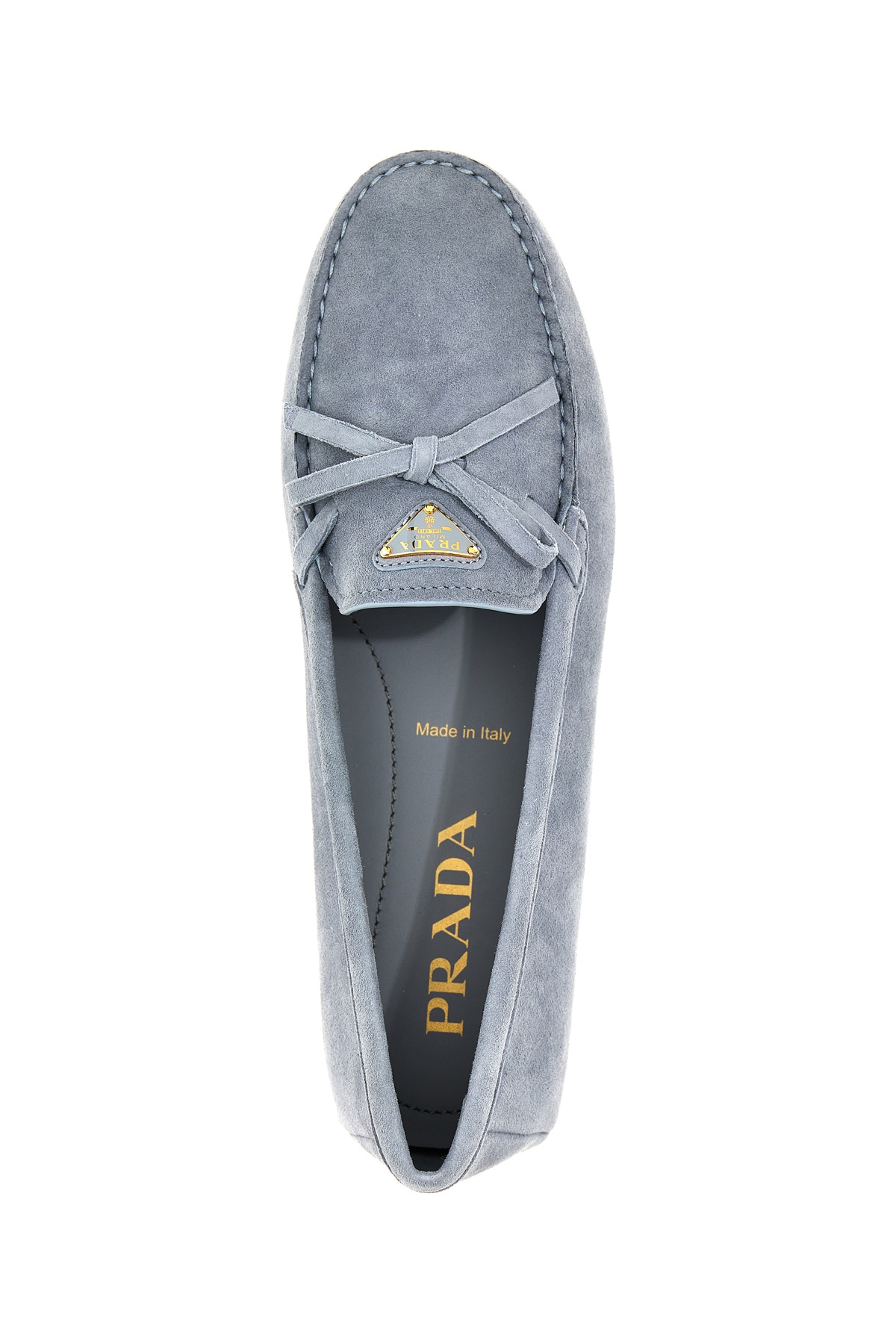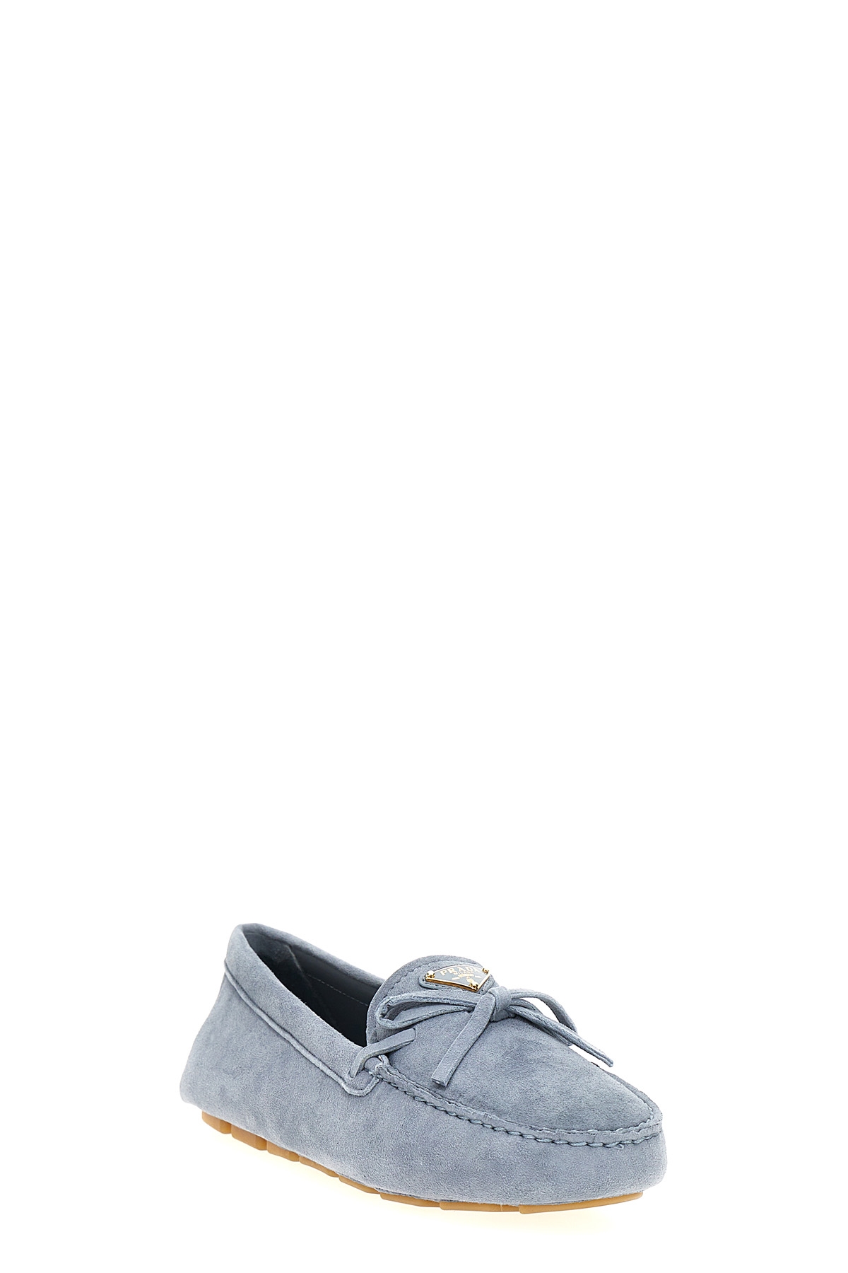 'Drive' suede loafers with bow and triangle logo in enameled metal on the front, rubber sole.