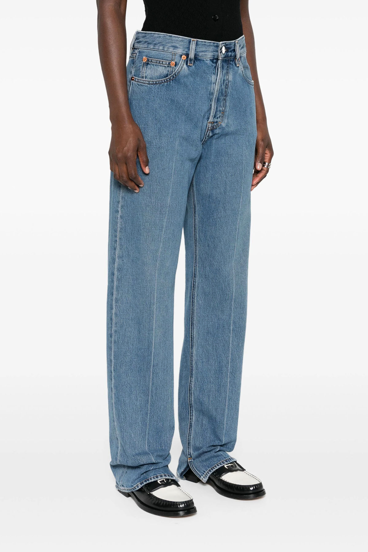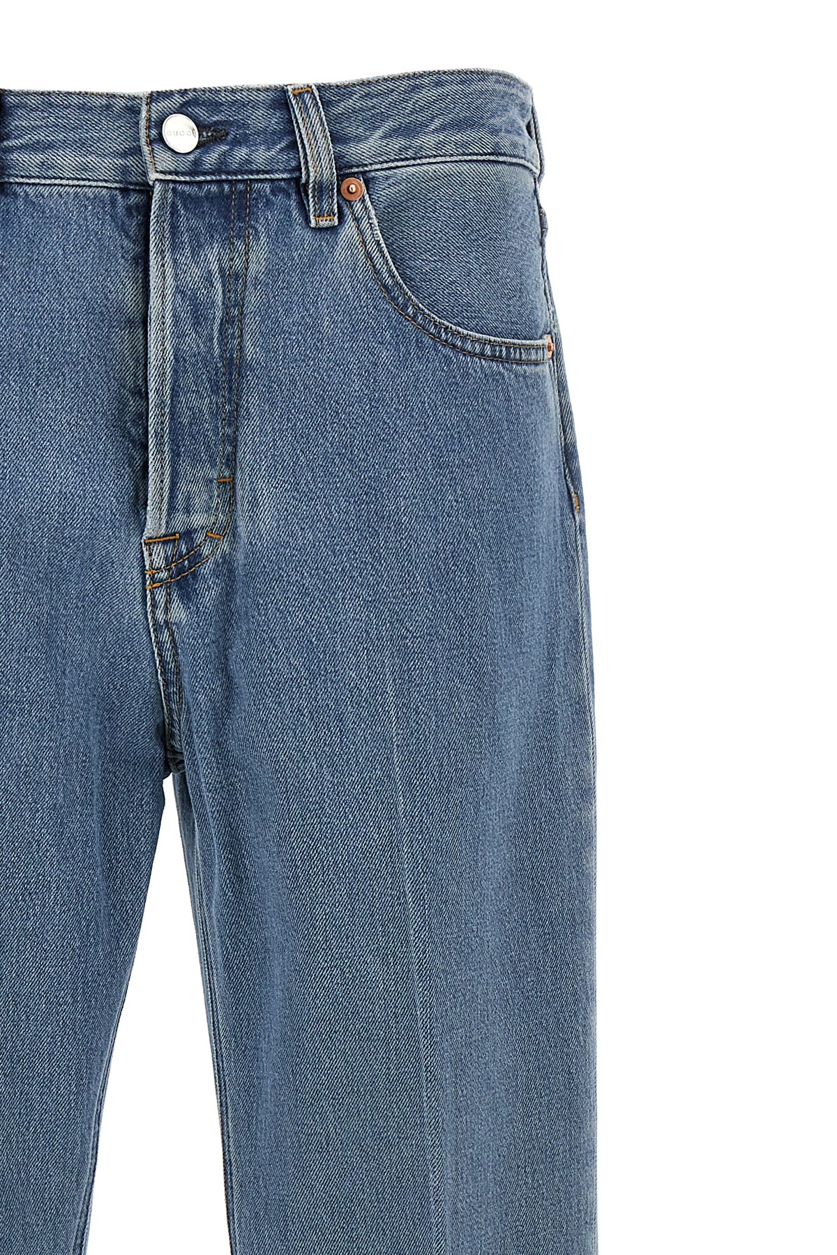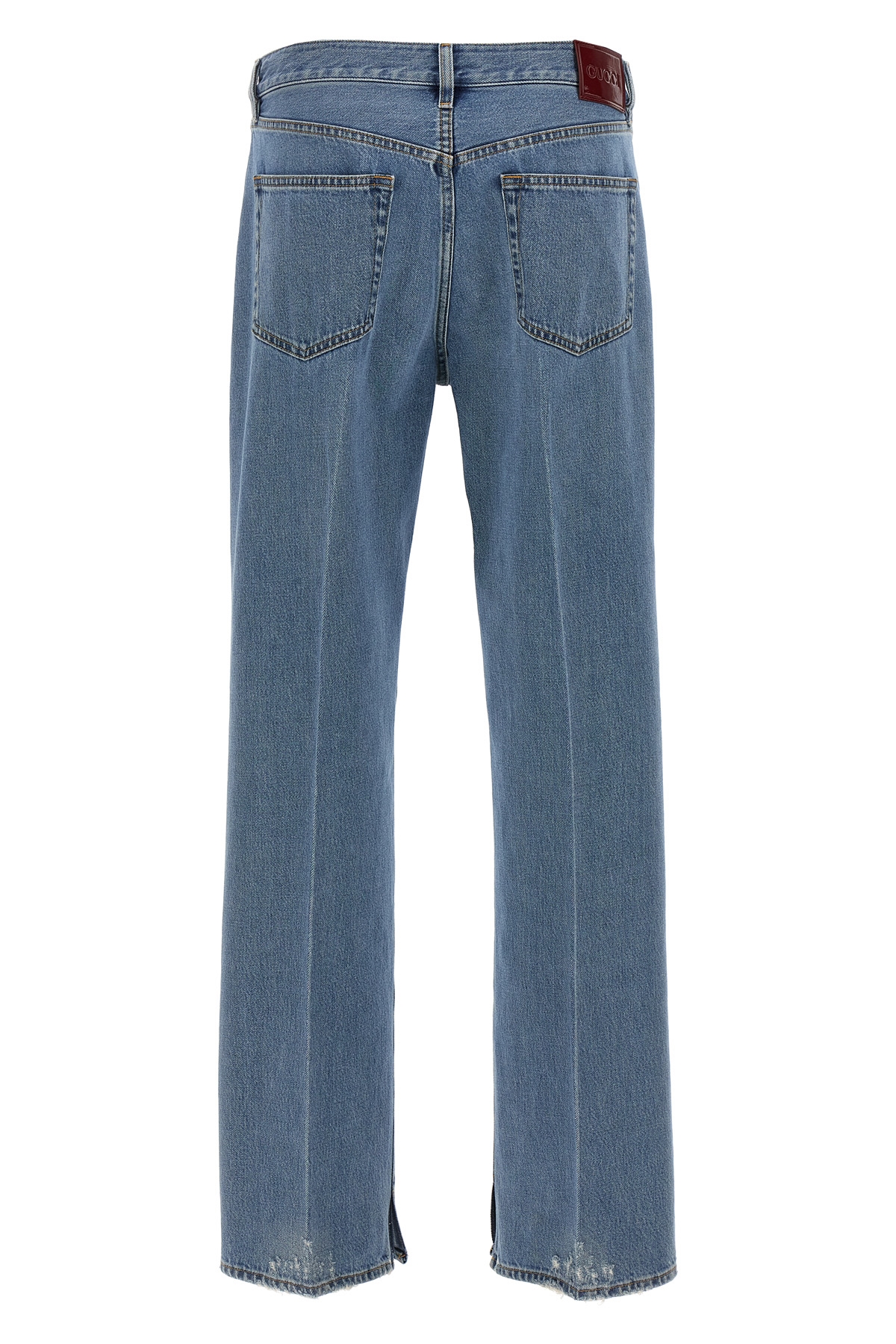 Cotton denim jeans with button closure, five pockets, 'Gucci Rosso Ancora' logo label at the back, stretched pleat leg and flared hem with slits, frayed hem.