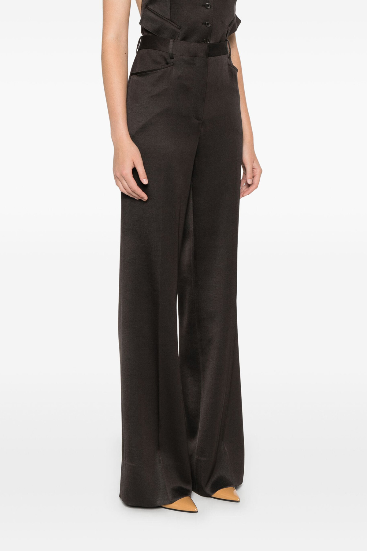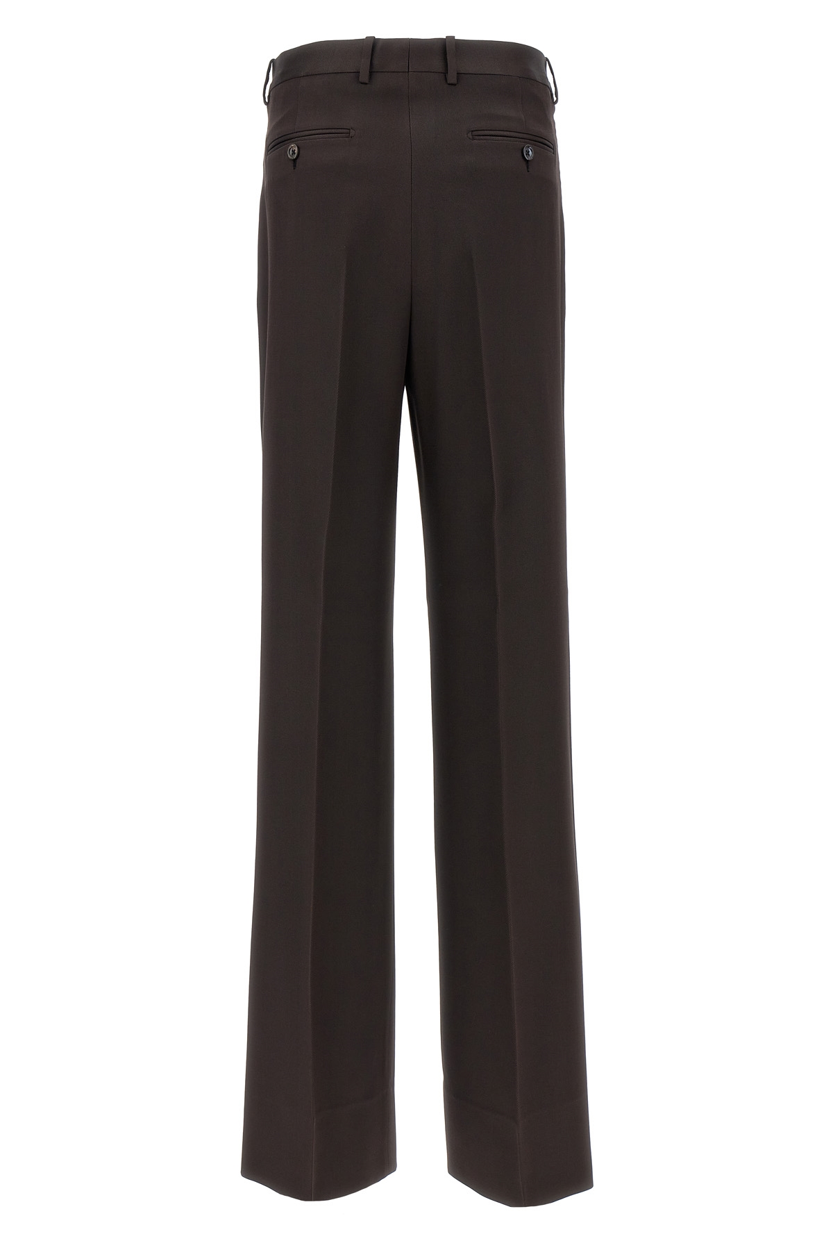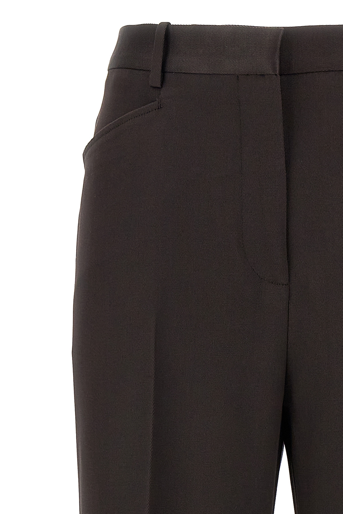 Silk and wool blend twill pants, hook and button zip closure, bootcut leg with stretched crease, pockets.