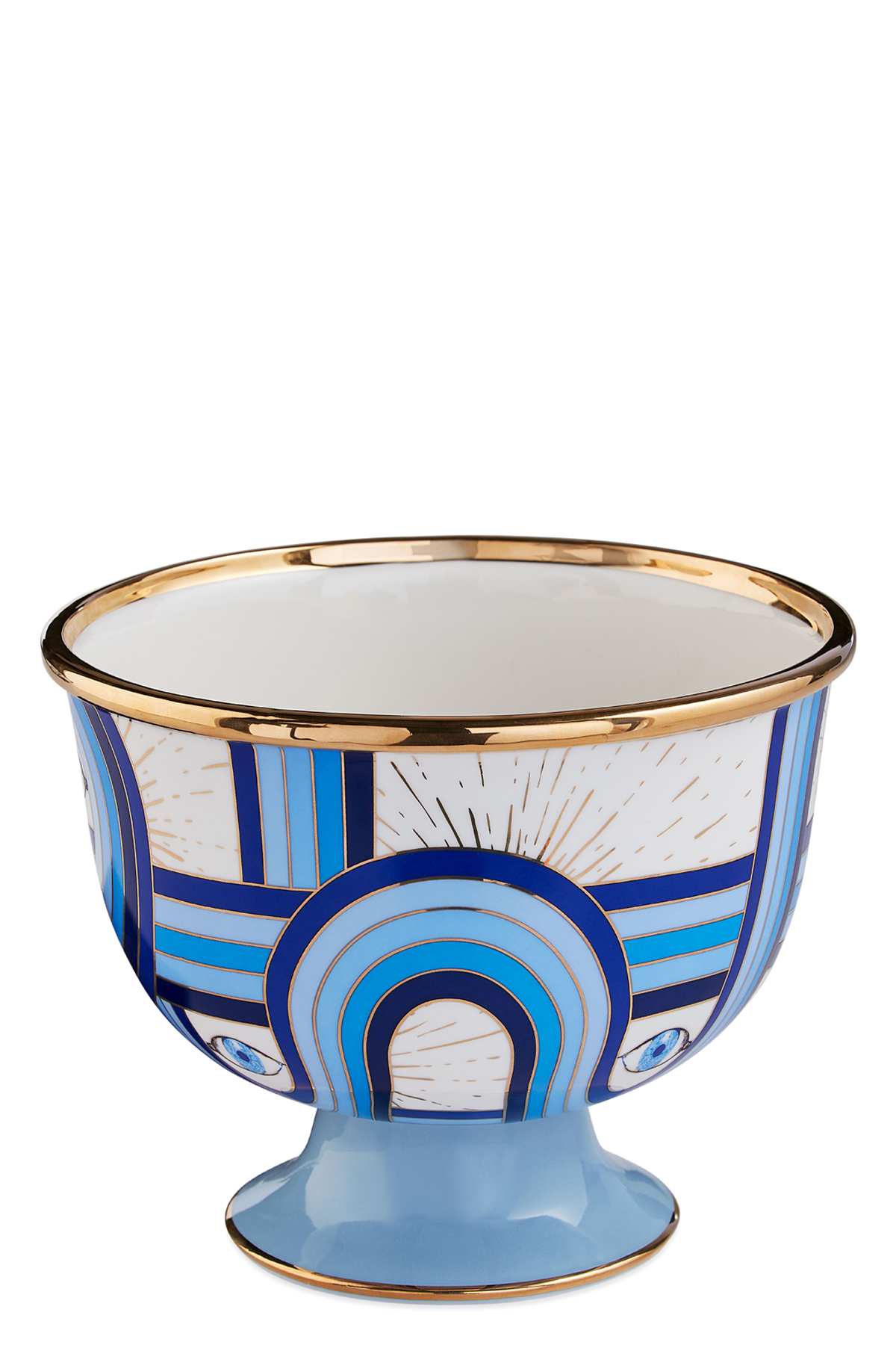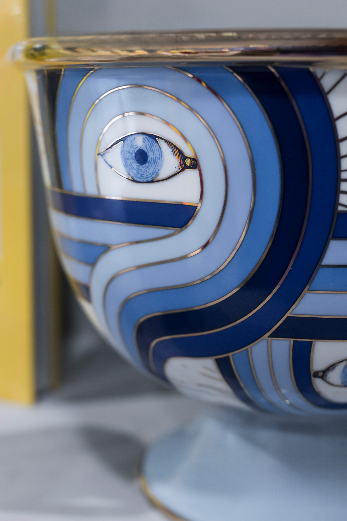 Expand your horizons with dreamy third eye mental landscapes, rendered in Delft-inspired blue and accented with real sparkling gold. High-fire porcelain elevates the experience. Our Druggist large bowl features a unique design on the front and back: rotate to refresh your eyes. A surreal addition to your table, shelf or mantelpiece. Combine it with our other Druggist ceramics and create your dream landscape.