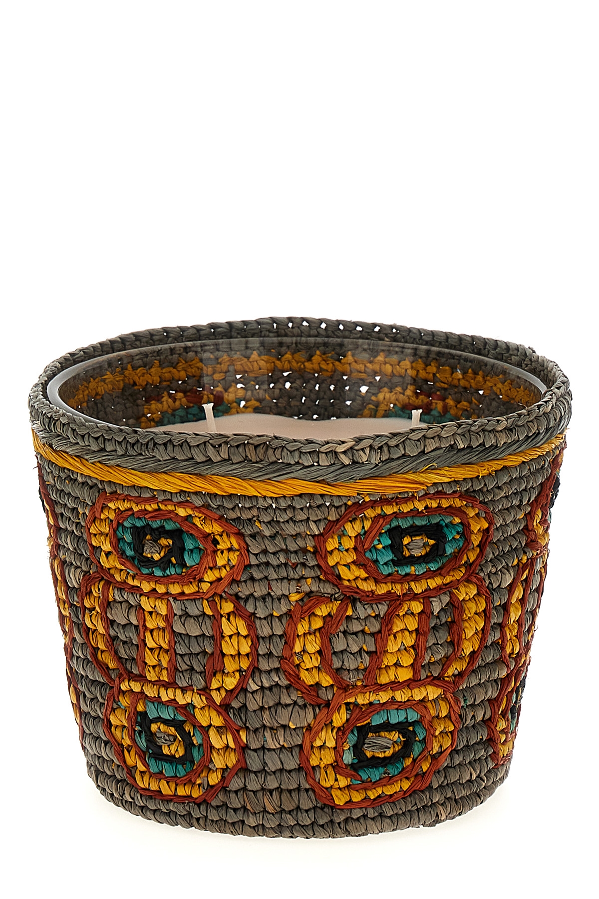 Covered in raffia hand-crocheted by the women of an all-female cooperative in Madagascar, the Antongona scented candle is a piece of furniture in shades of gray and saffron yellow, with a motif inspired by Aboriginal art that represents the sacred places of Australia's vast open spaces.