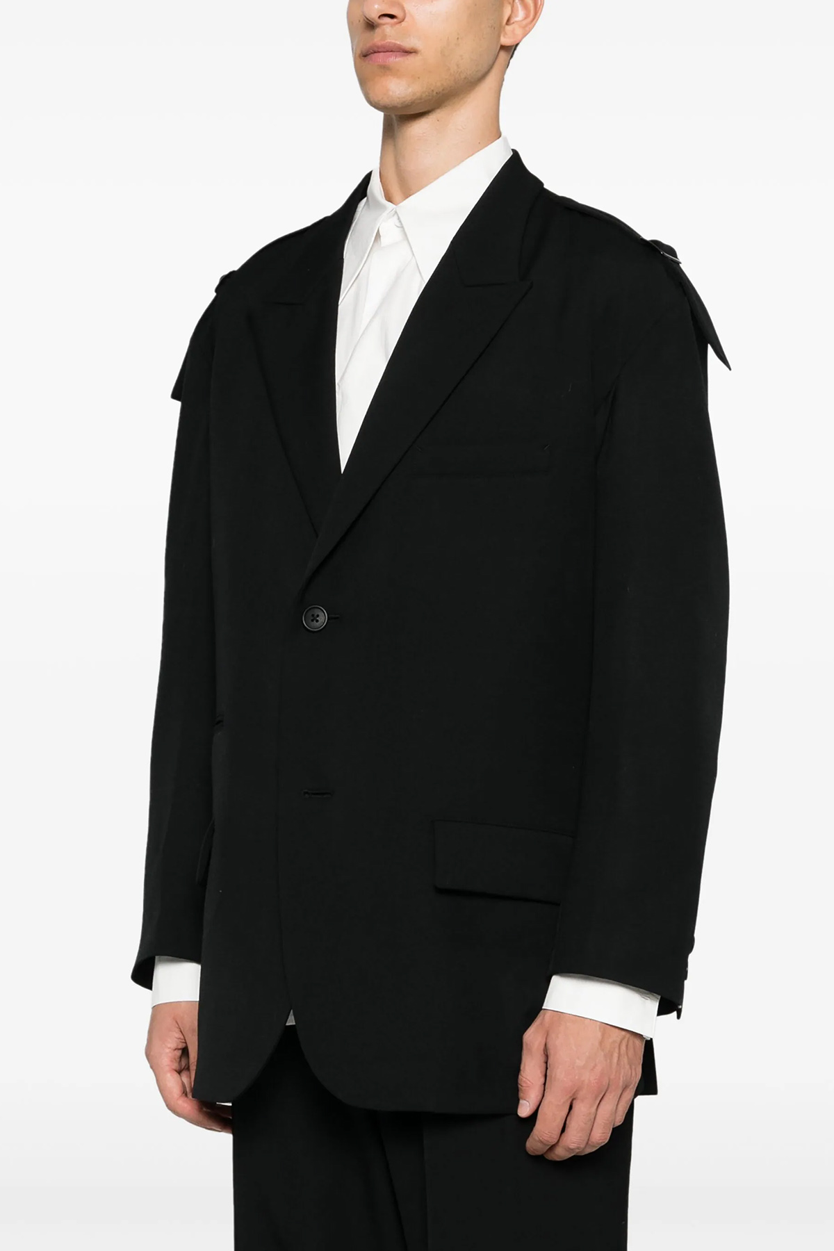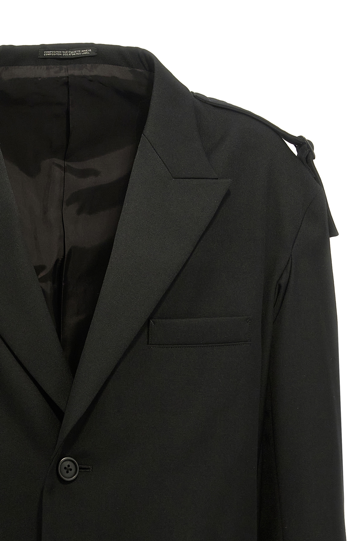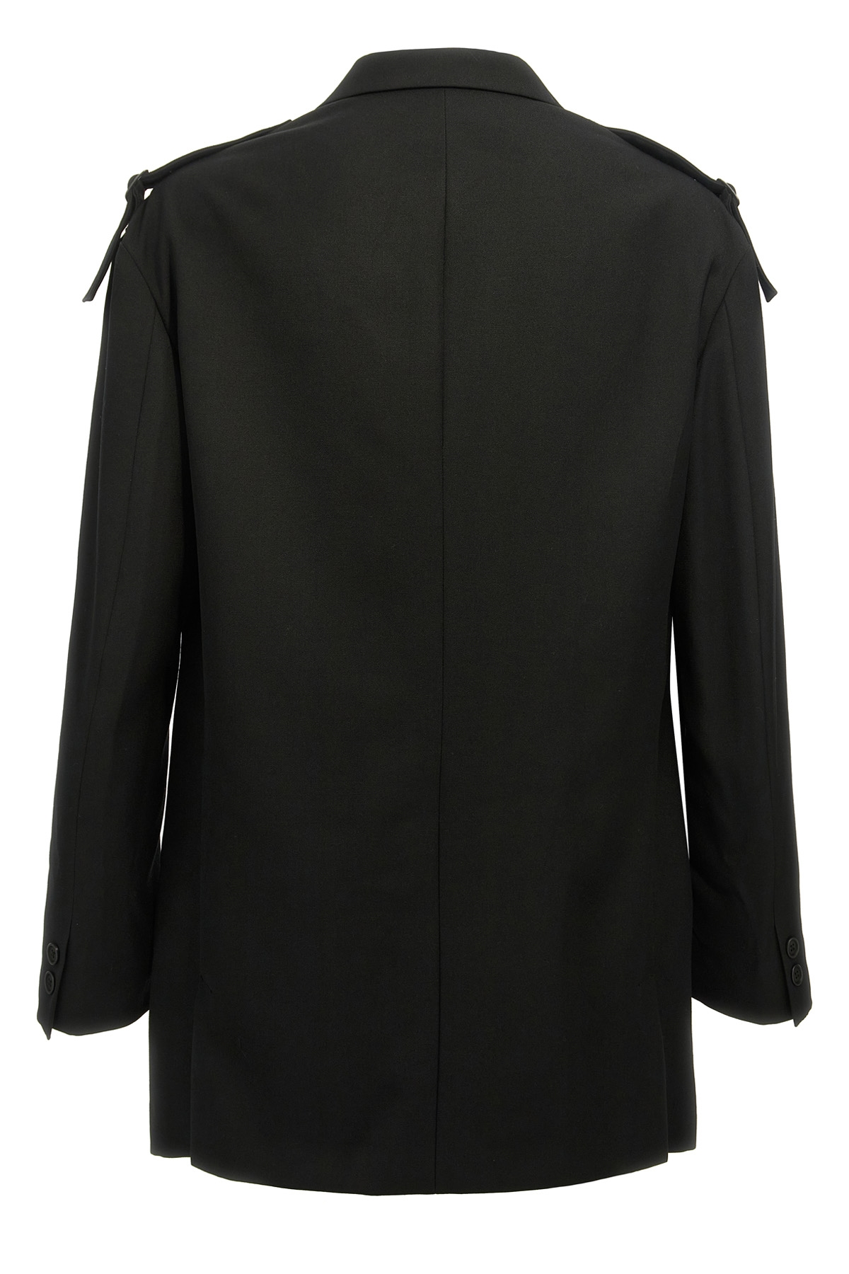 Single-breasted wool blazer with strap detail on shoulders, button closure, pockets, long sleeves, back vents.