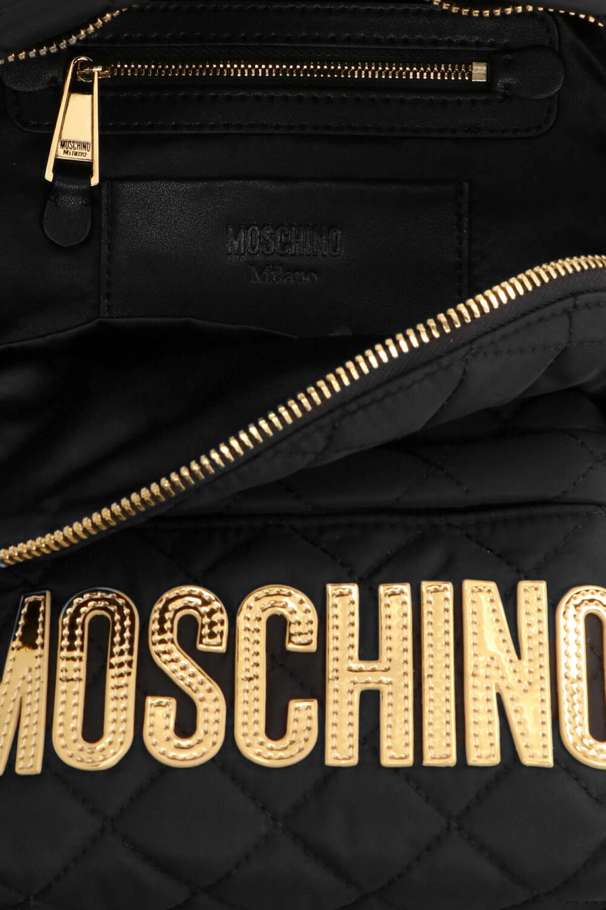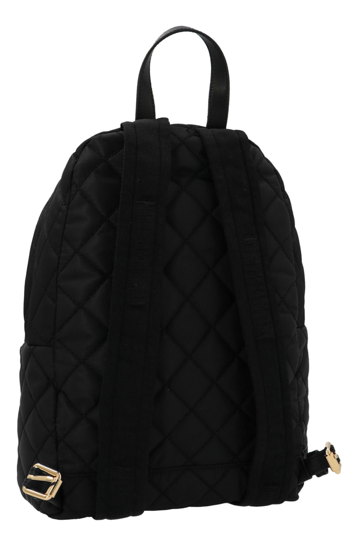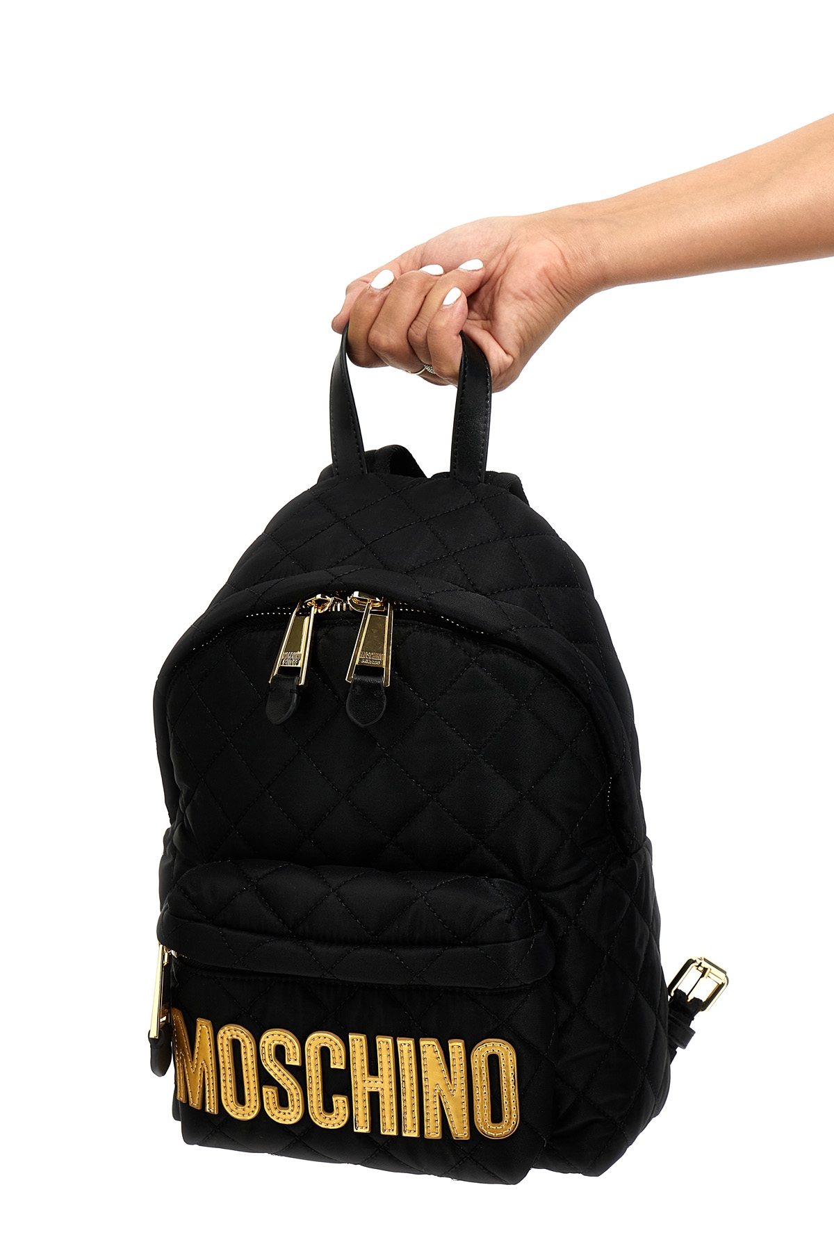 Quilted nylon backpack with contrasting logo application, adjustable shoulder straps, zip closure, and outer pocket.