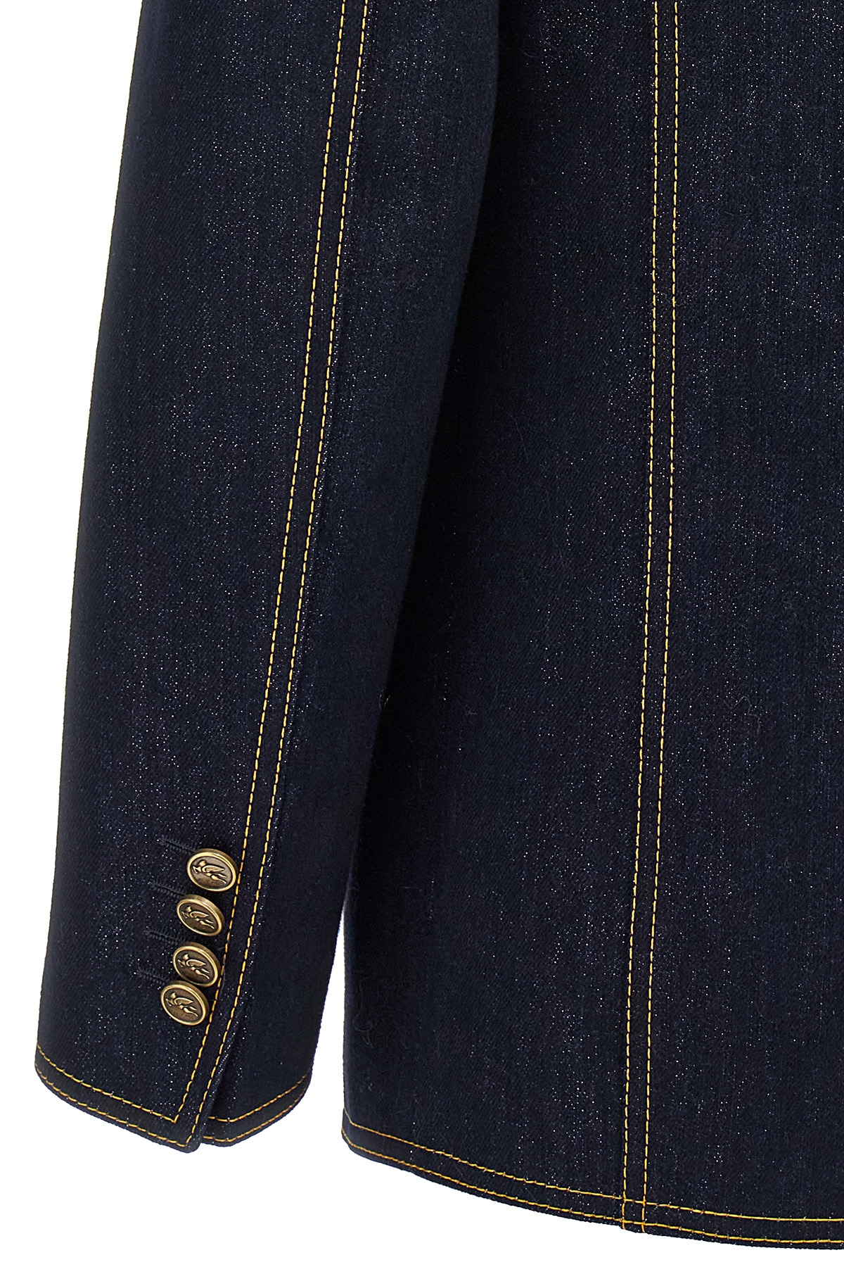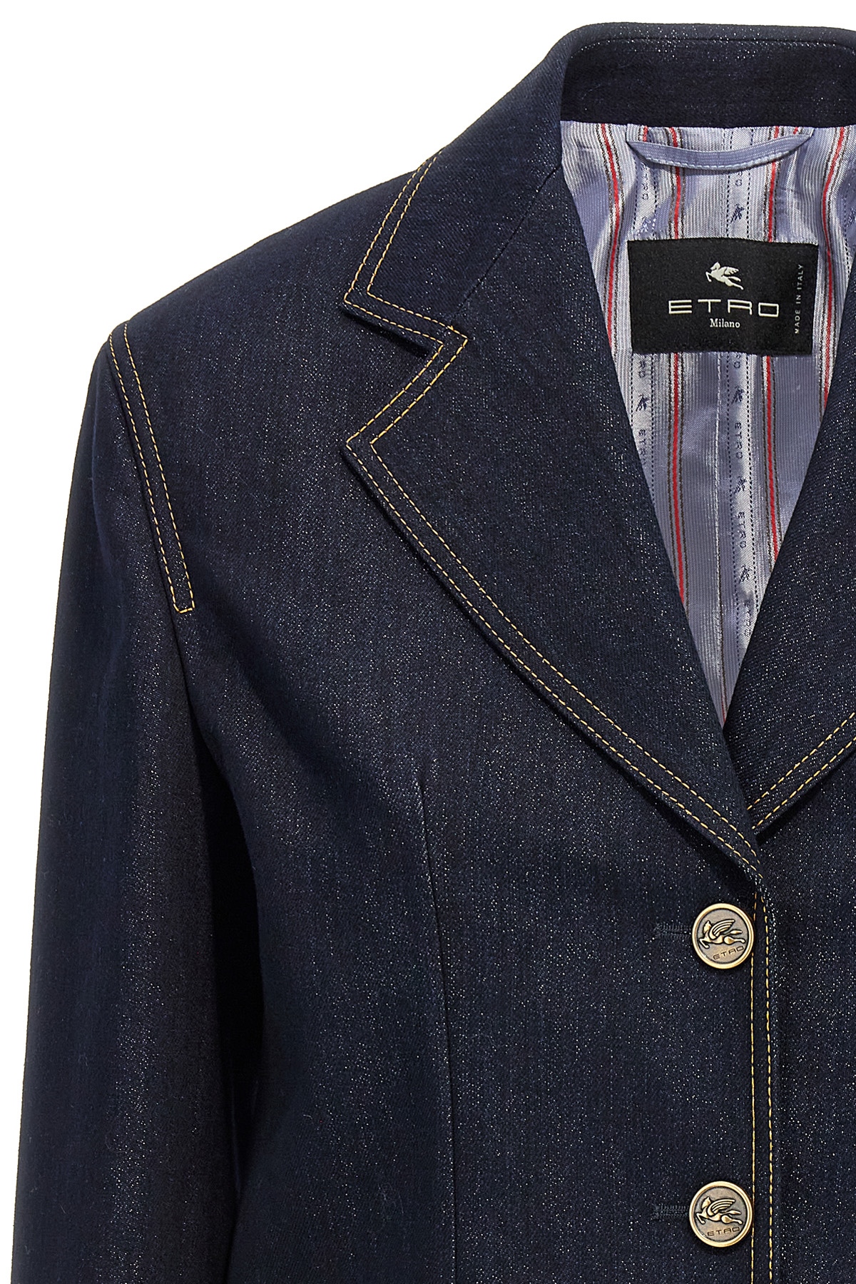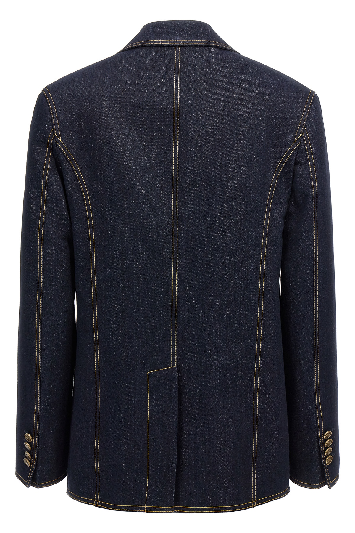 Single-breasted denim blazer with button closure, pockets, long sleeves, padded shoulders, back split.