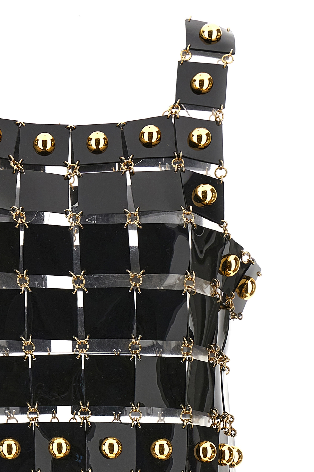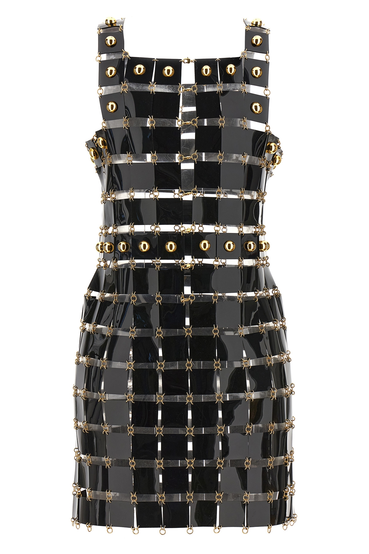 Short vinyl check knit dress, metal chain, straight design, sleeveless, side splits.