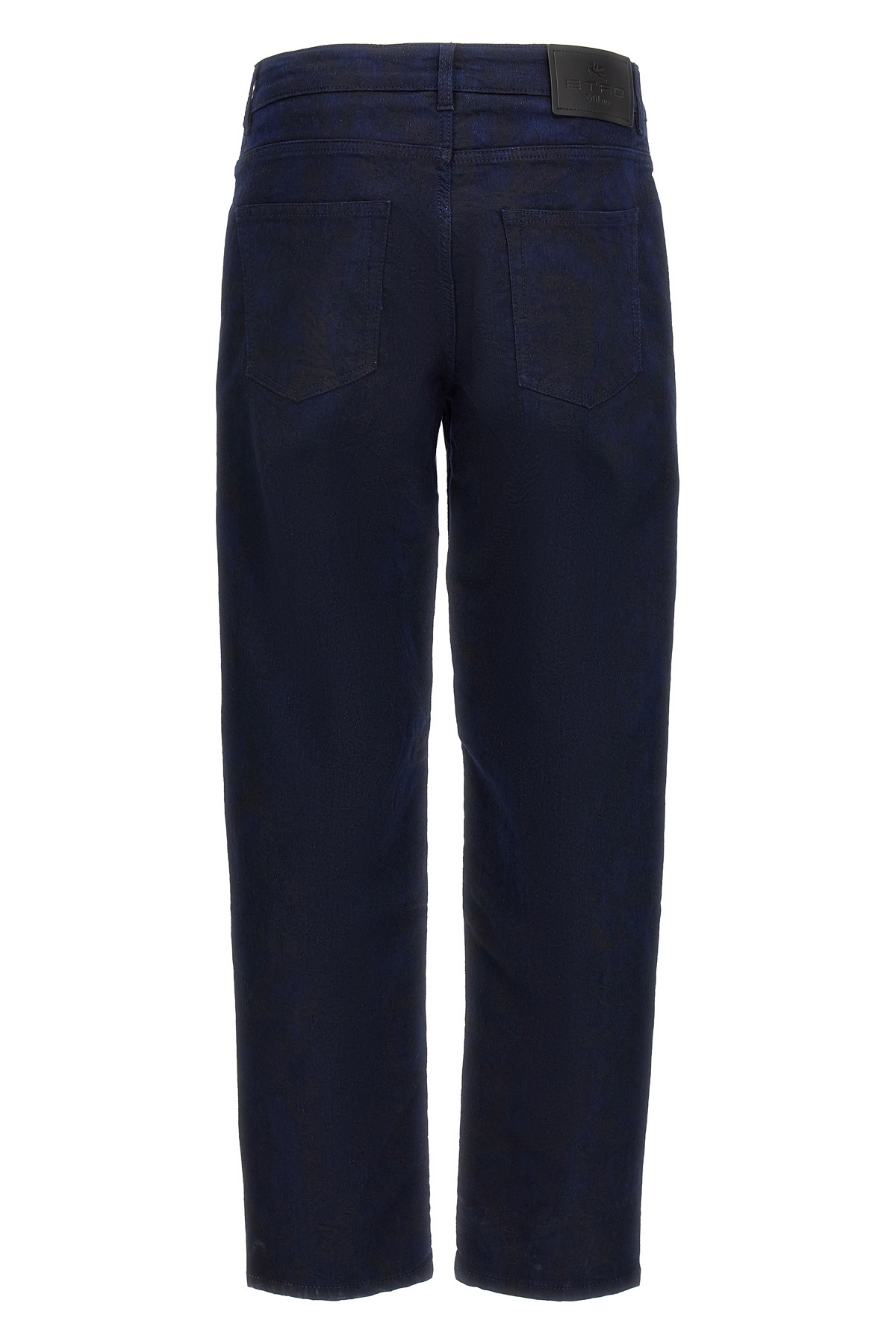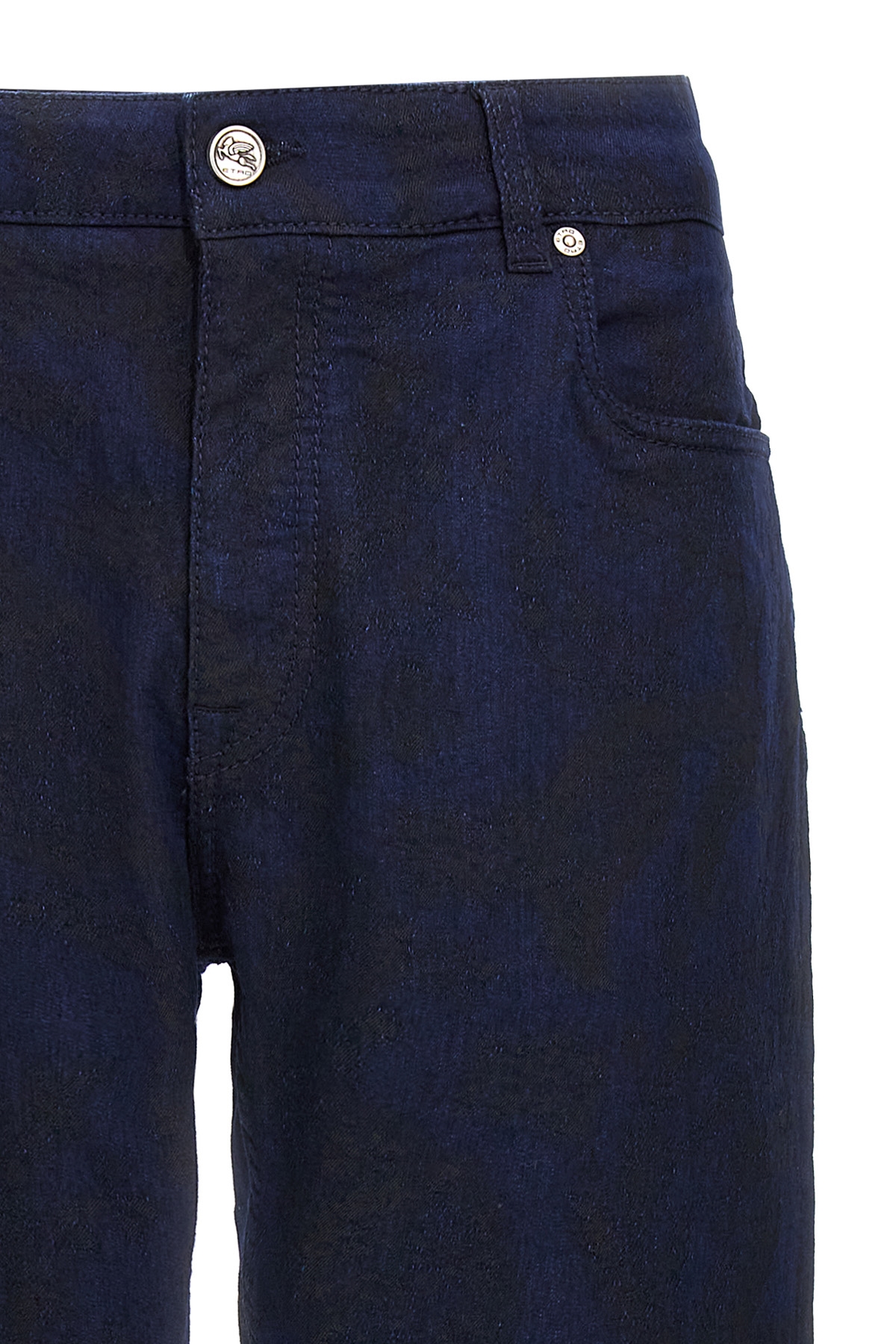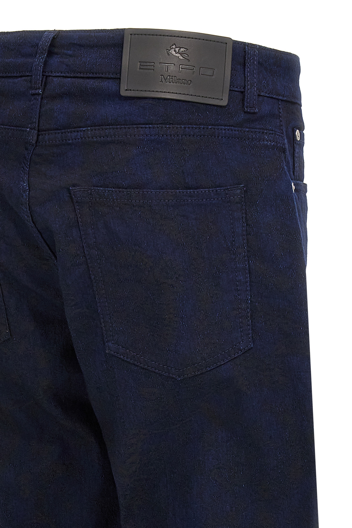 Jacquard stretch cotton blend denim jeans with all-over floral pattern, zip and button closure, five pockets, leather logo tag.