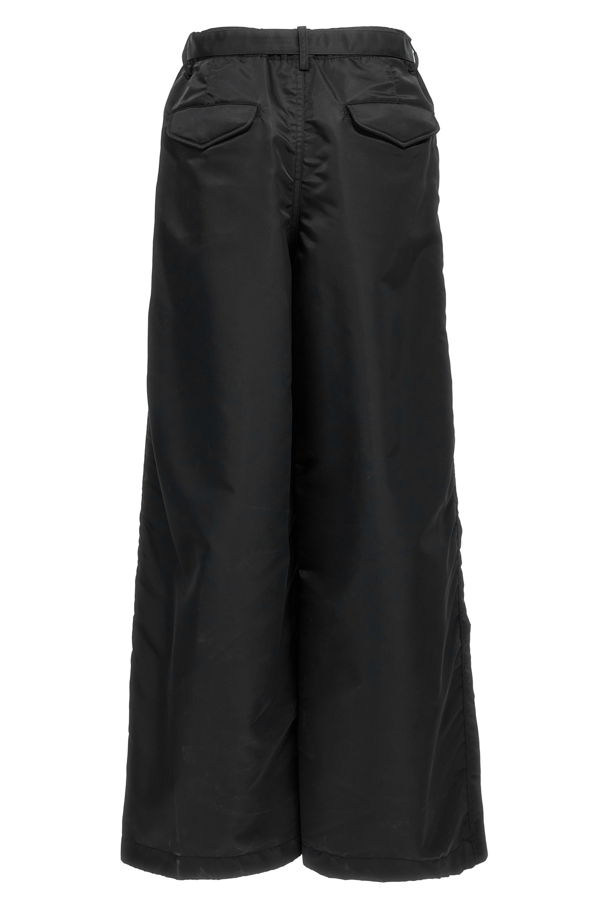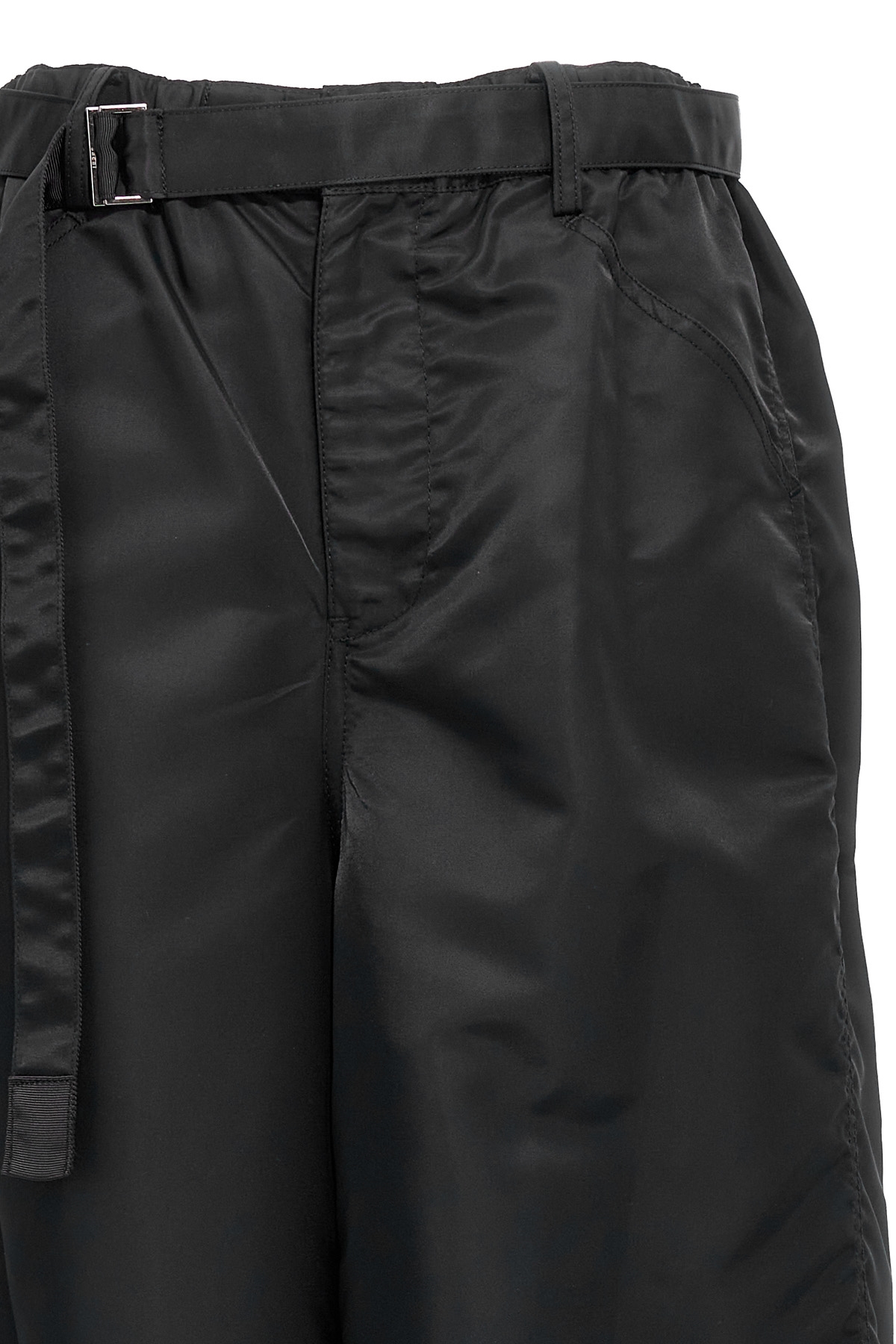 Nylon twill pants with elastic waistband and adjustable belt, zip and button closure, pockets, wide leg.