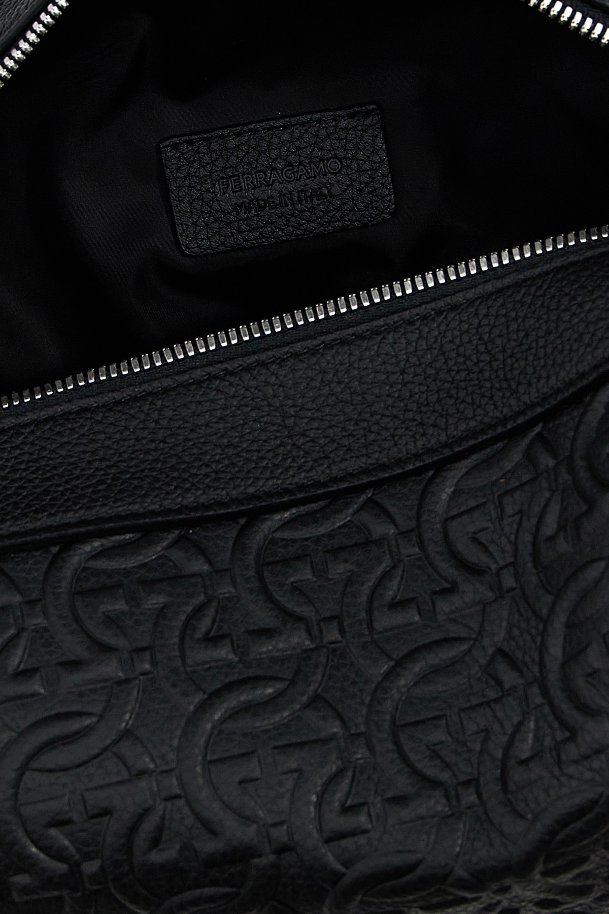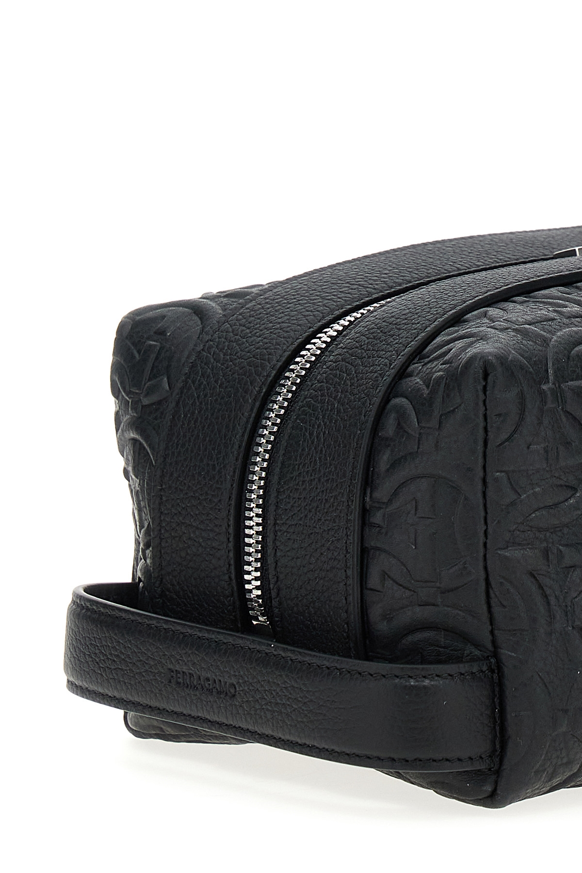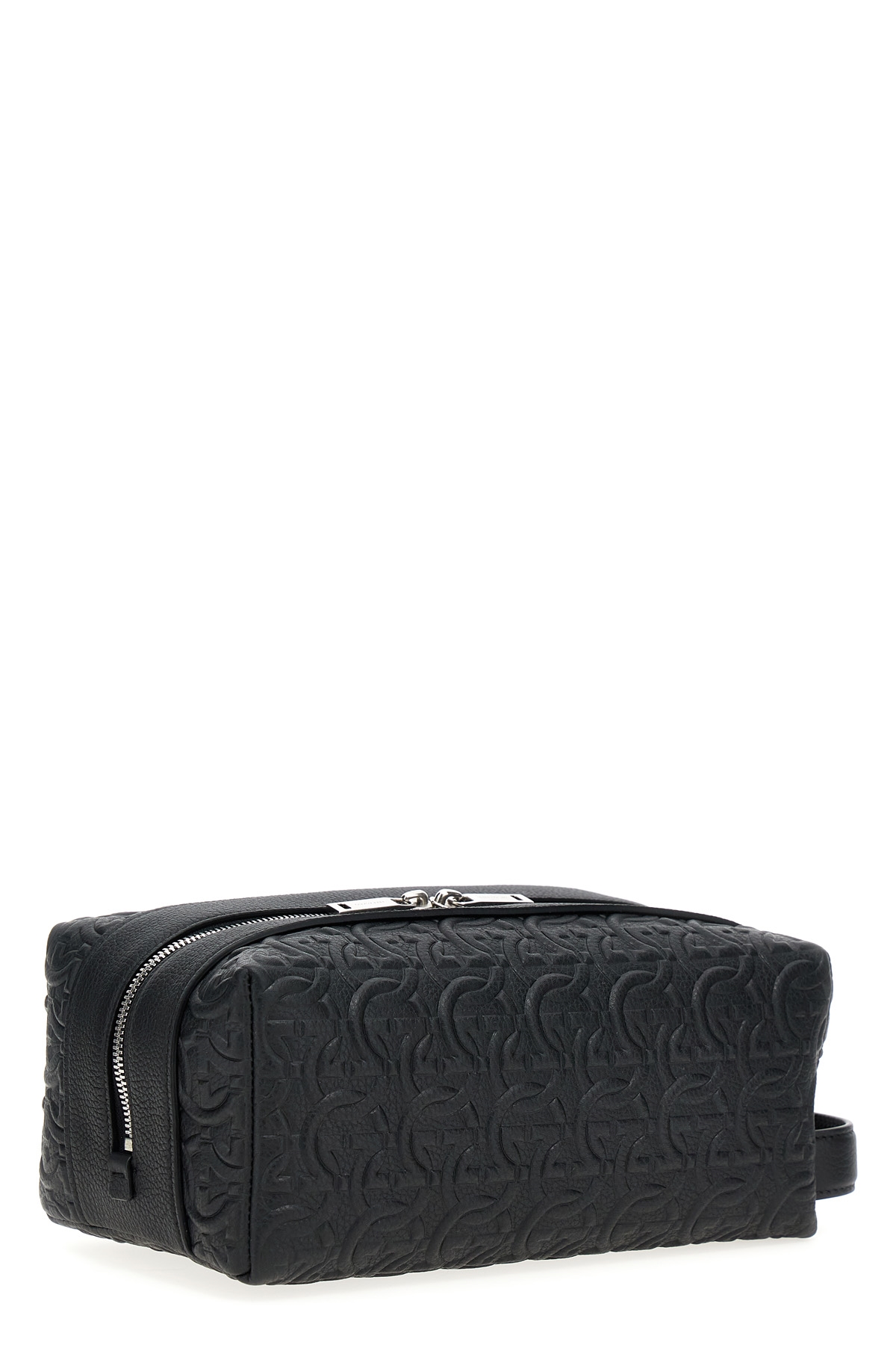 Leather beauty with all-over 'Gancini' pattern, zip closure, side handle.