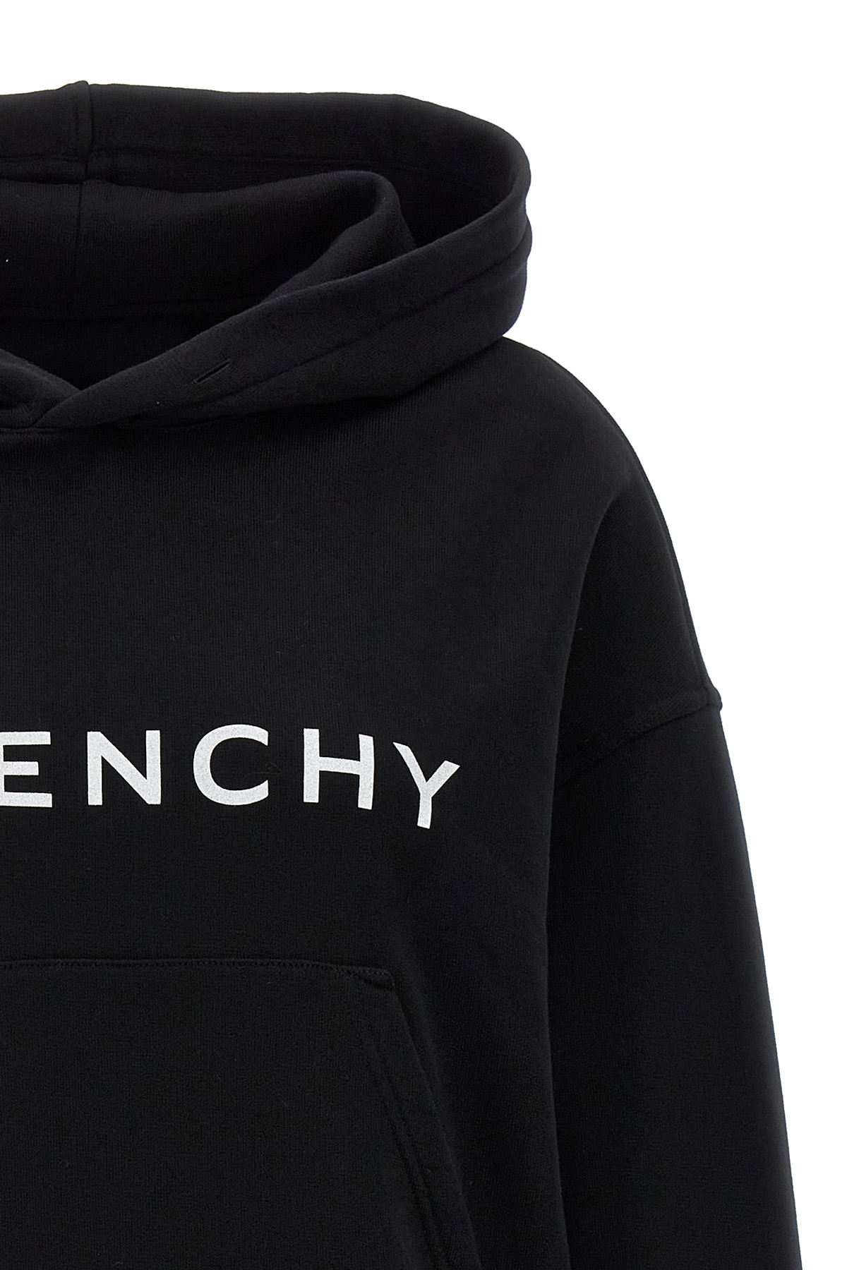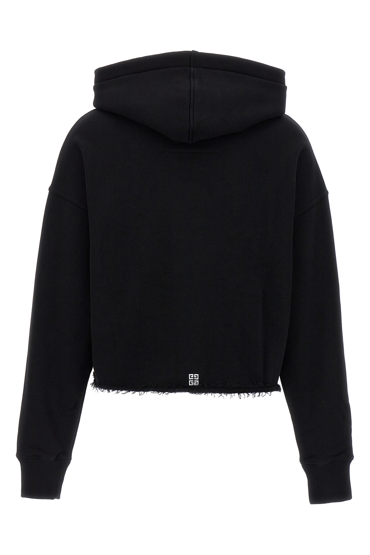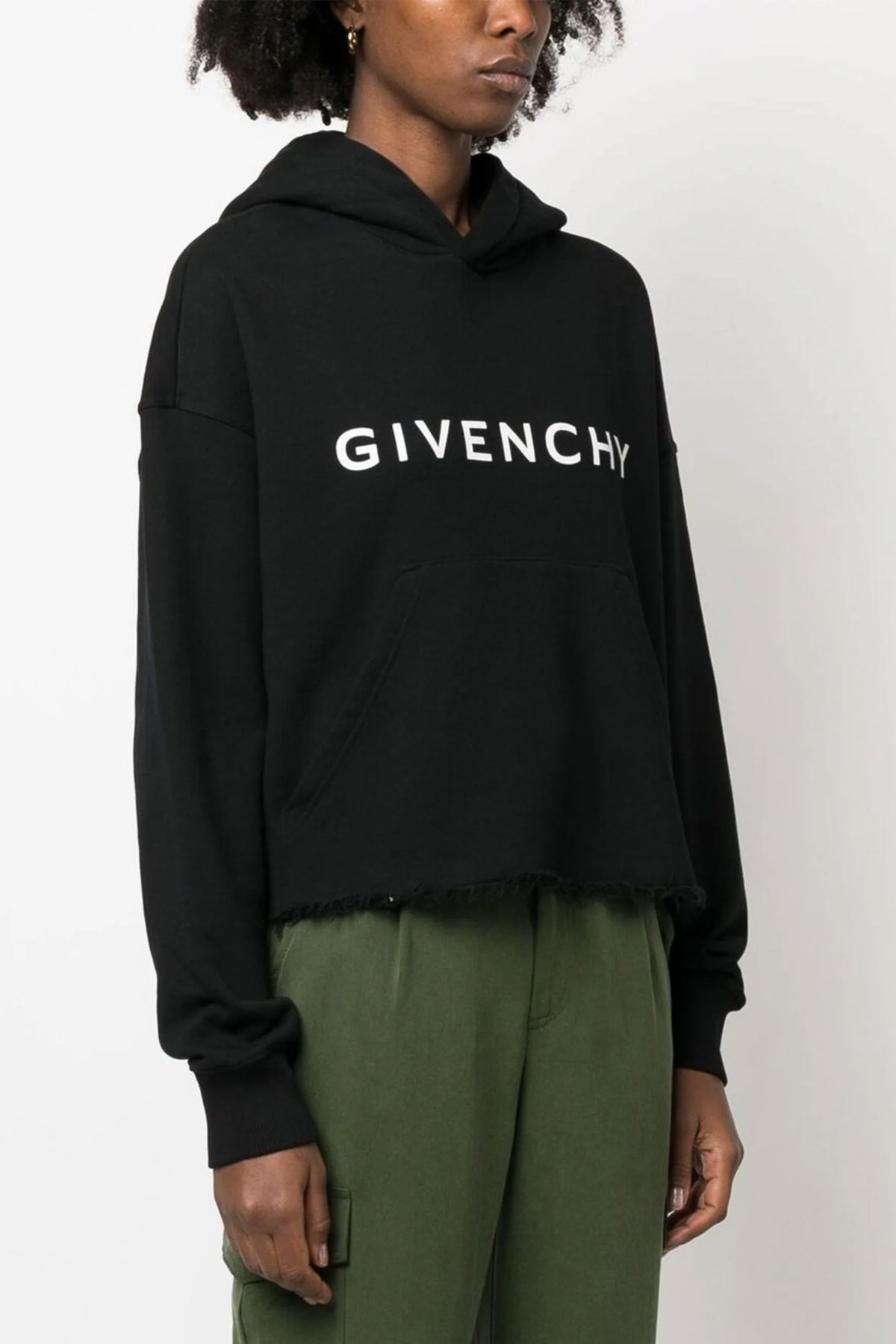 Cotton hoodie with front logo print, kangaroo pocket, long cuffed sleeves, frayed hem.