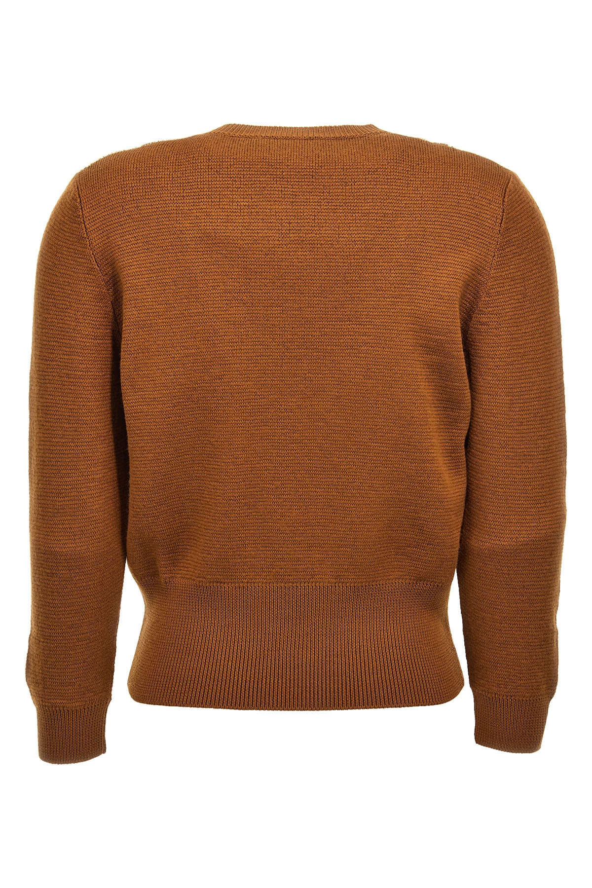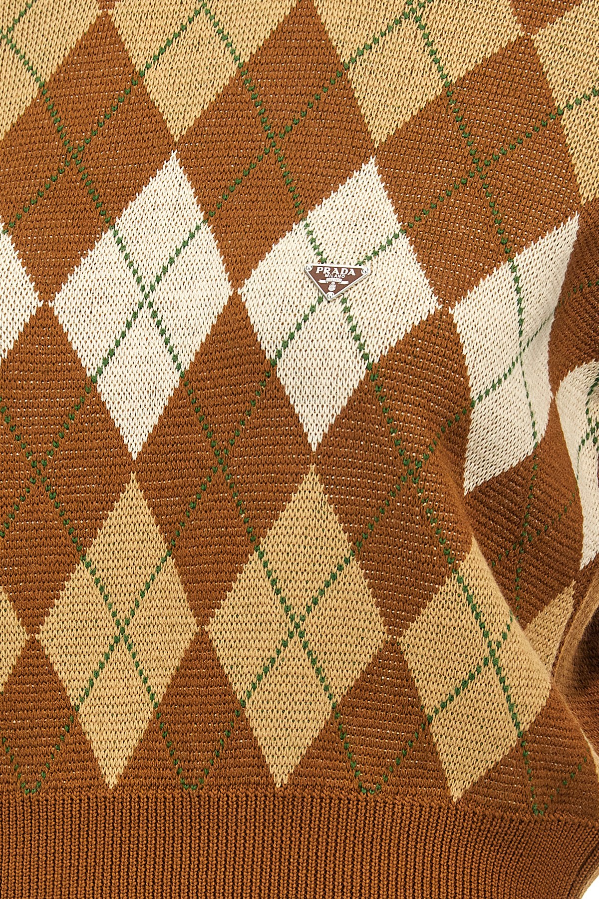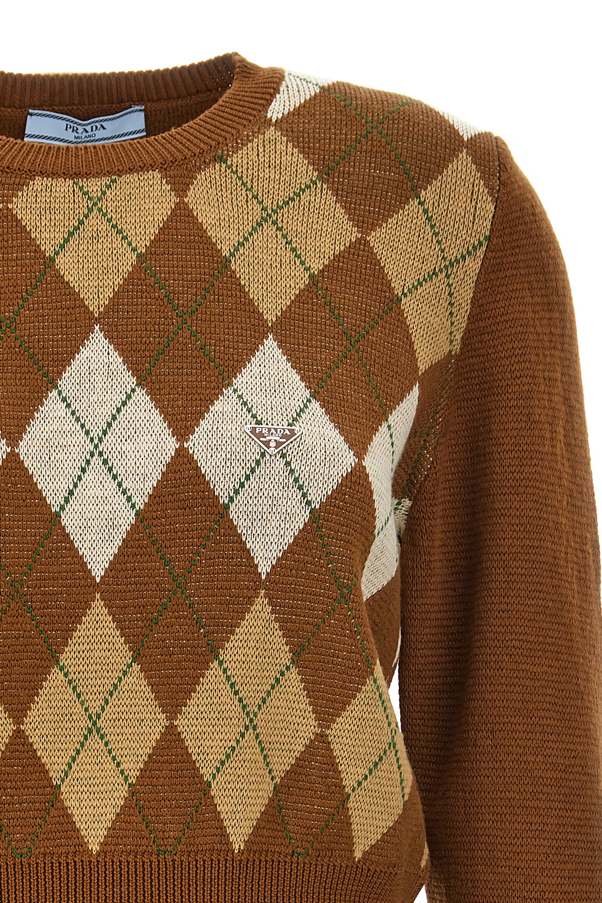 Argyle wool sweater with front triangle logo, crew neck, 3/4 cuffed sleeves.