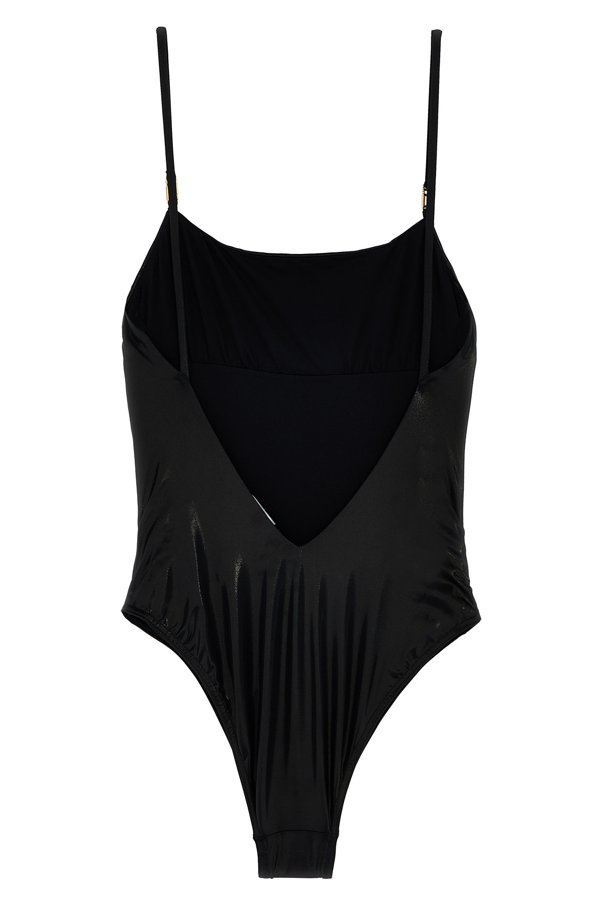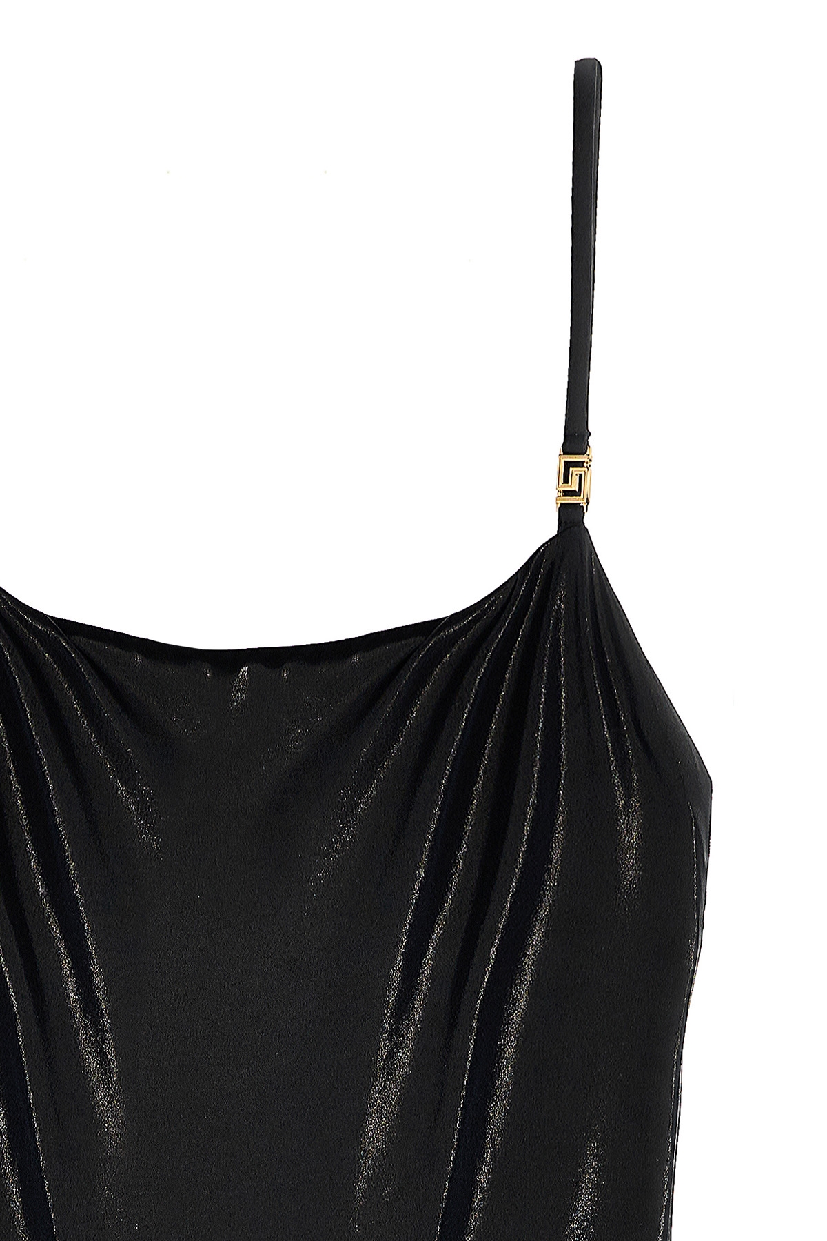 One-piece swimsuit in coated effect fabric with thin straps with gold metal 'Greca' detail.