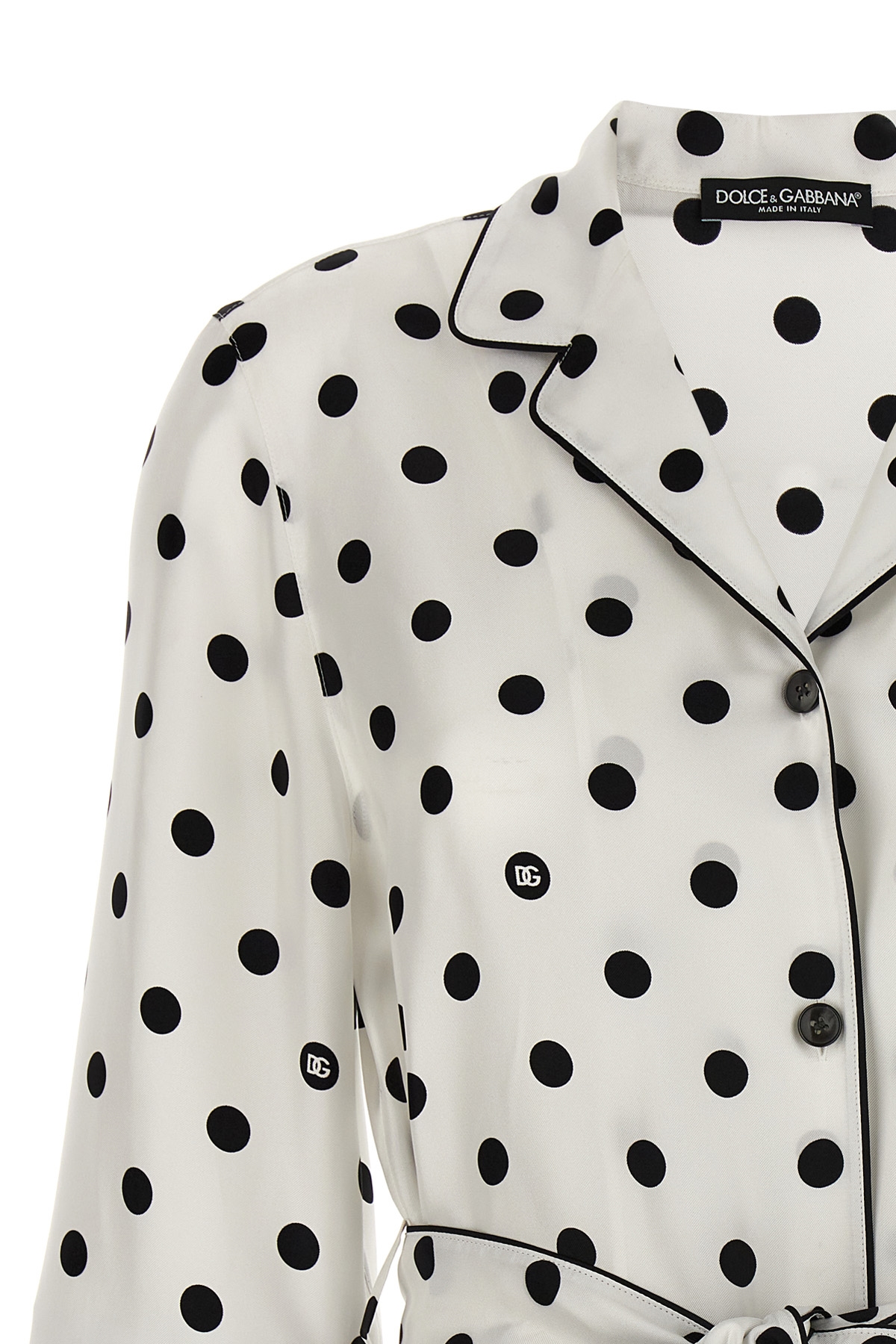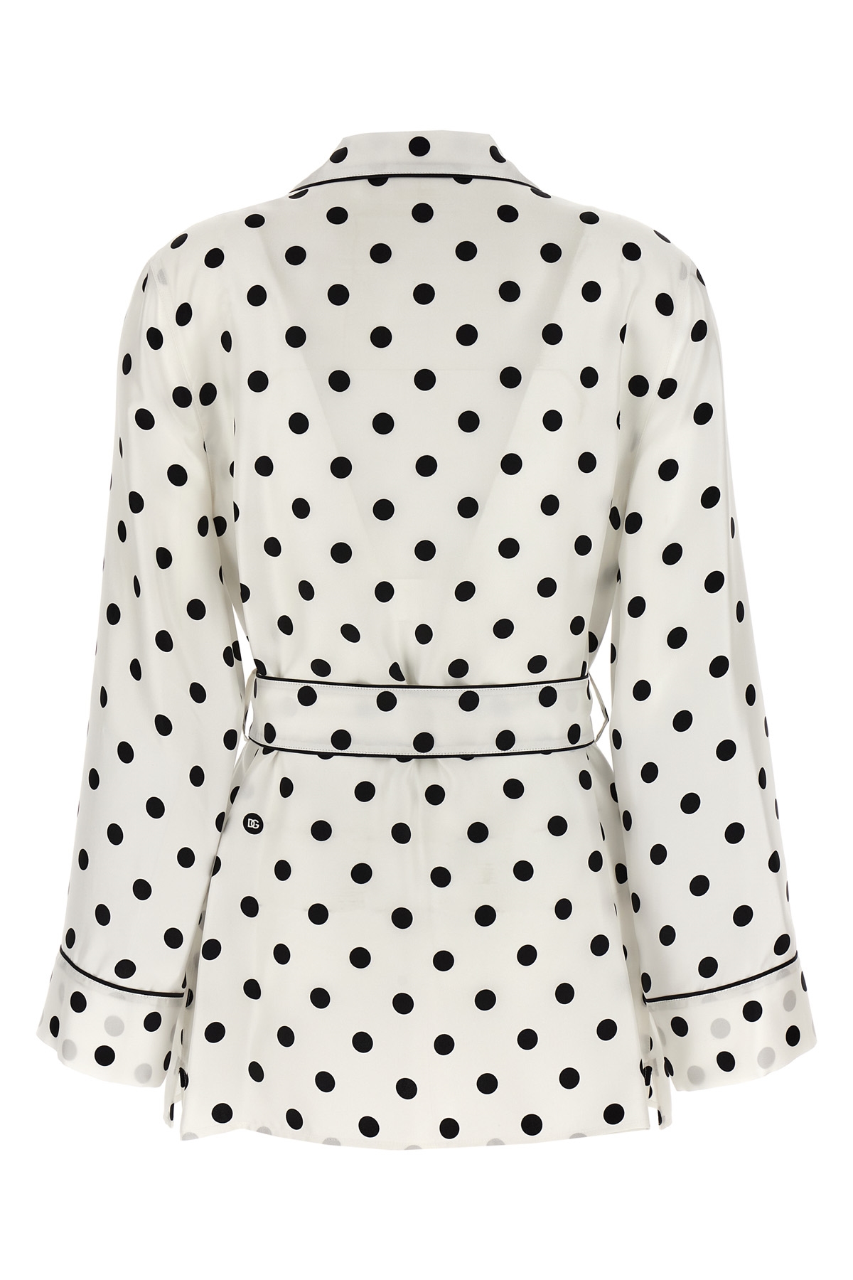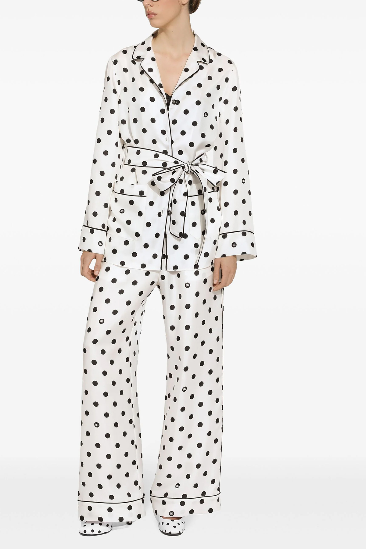 'Mambo' pajama shirt in polka dot print silk twill with button closure, matching waist belt, long sleeves, pockets.
