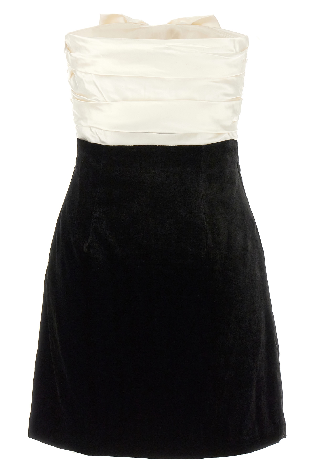 Short dress in satin and velvet, off-the-shoulder model with front bow, back zip closure.